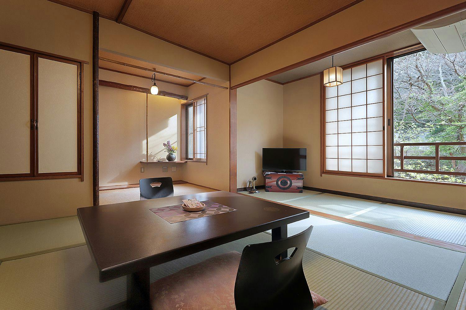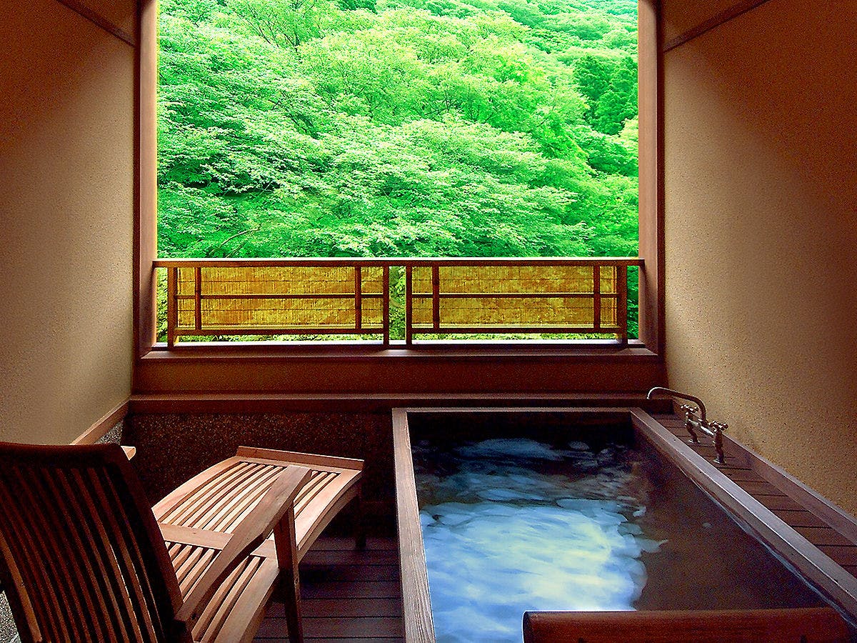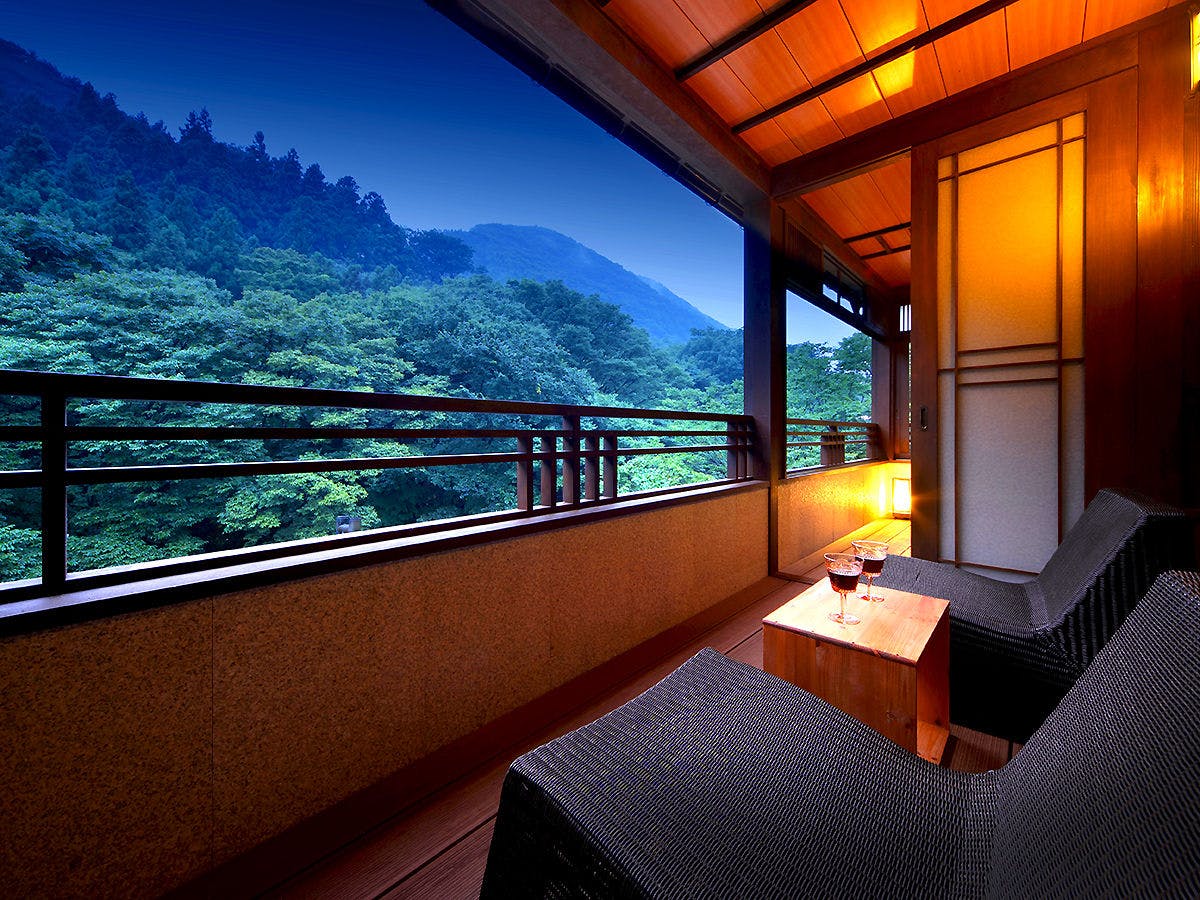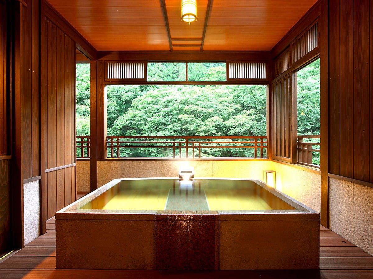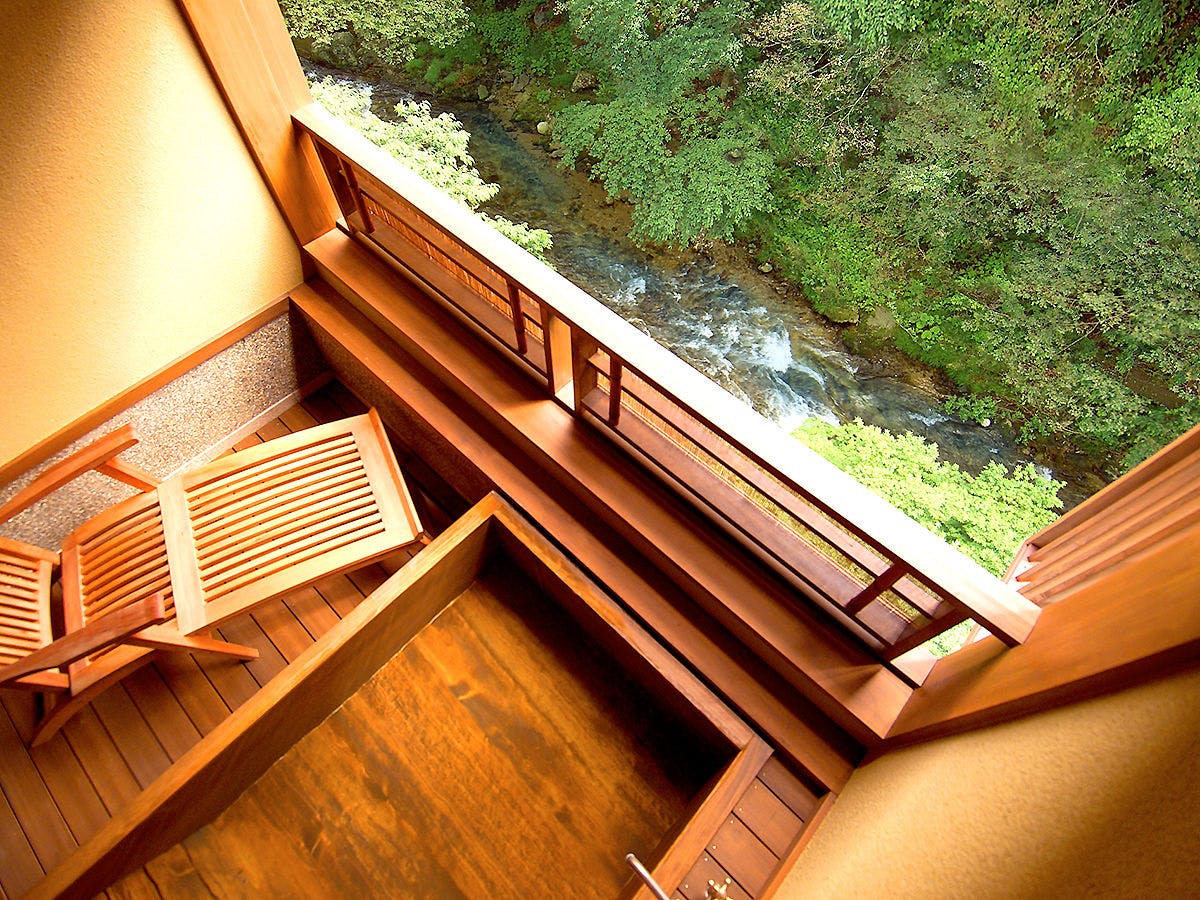 五百川の清流を眼下に望む渓流沿いの眺望抜群のお部屋。源泉掛け流し100%のゆったりとした檜露天風呂付客室には浴室にチェアを備え四季折々の景色を眺めながらの湯あみをお愉しみいただけます。心地よい時間をお過ごしください。