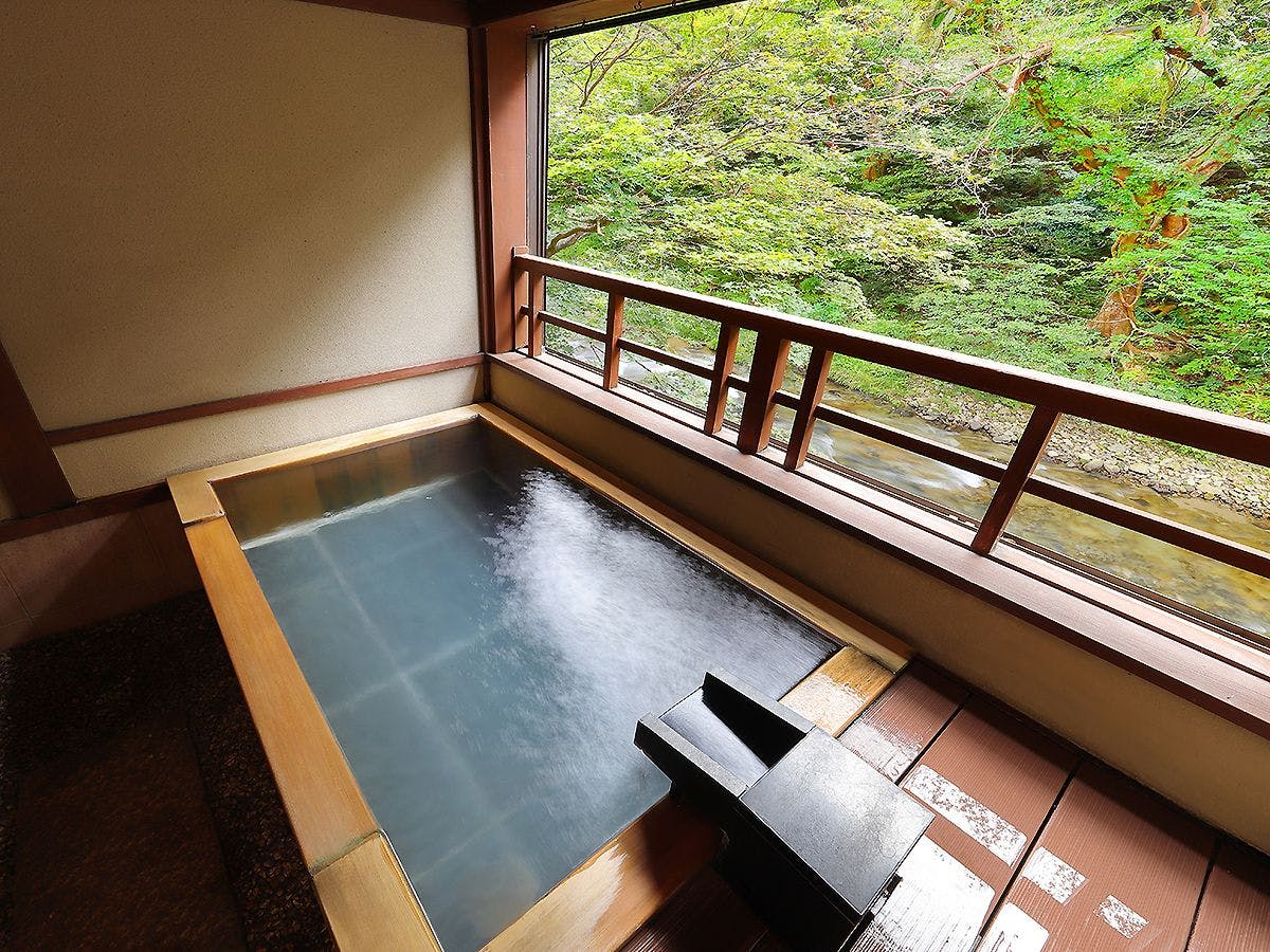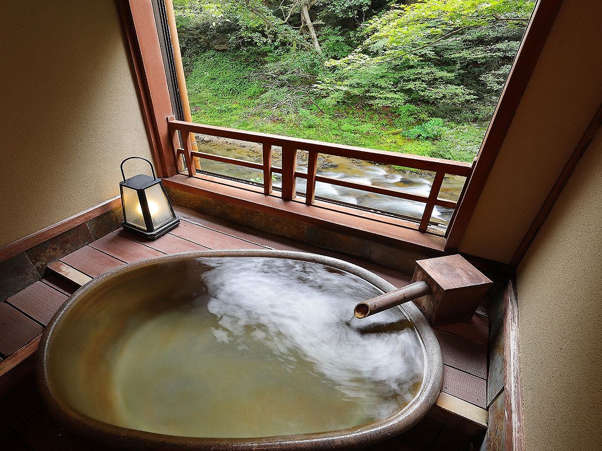 源泉掛け流し100%の専用露天風呂は檜と陶器の2タイプがあり共に五百川の清流と対岸の緑を望むお部屋。(指定不可)心地よい露天風呂と美肌の湯、窓から見える景色に癒されるとリピーターに喜ばれています。