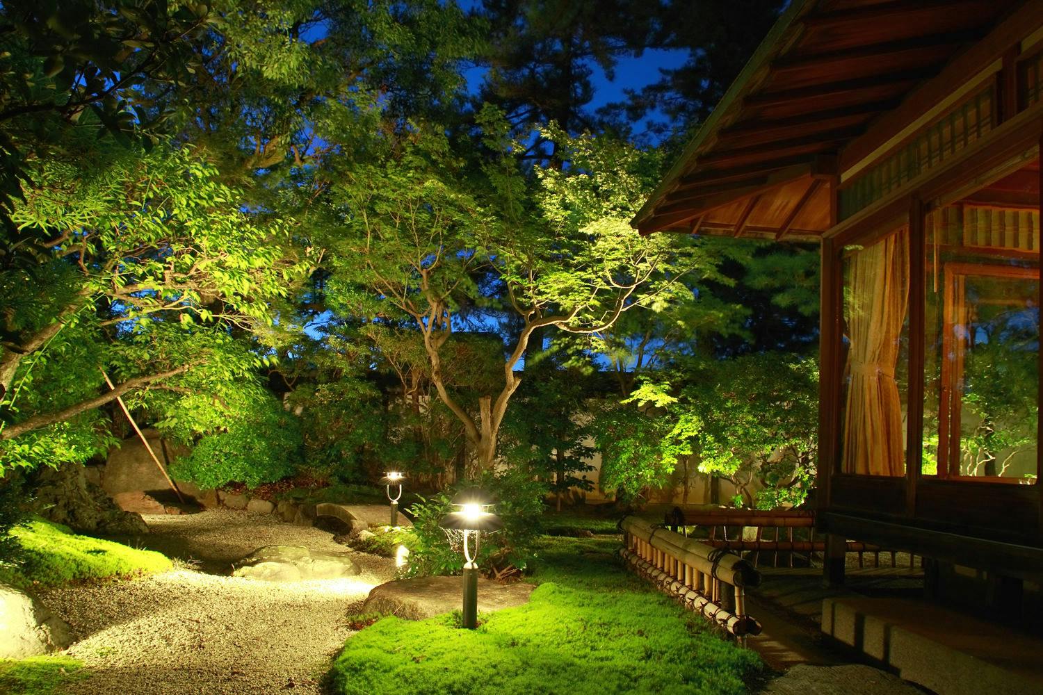 平成26年8月完成。世界のVIPのリクエストが反映された半露天庭園風呂付きの本館の簡素枯淡な本間8畳と控えの間8畳「植治」1階庭側の1階庭側庭園客室。定員6名様。和布団のご用意となります。