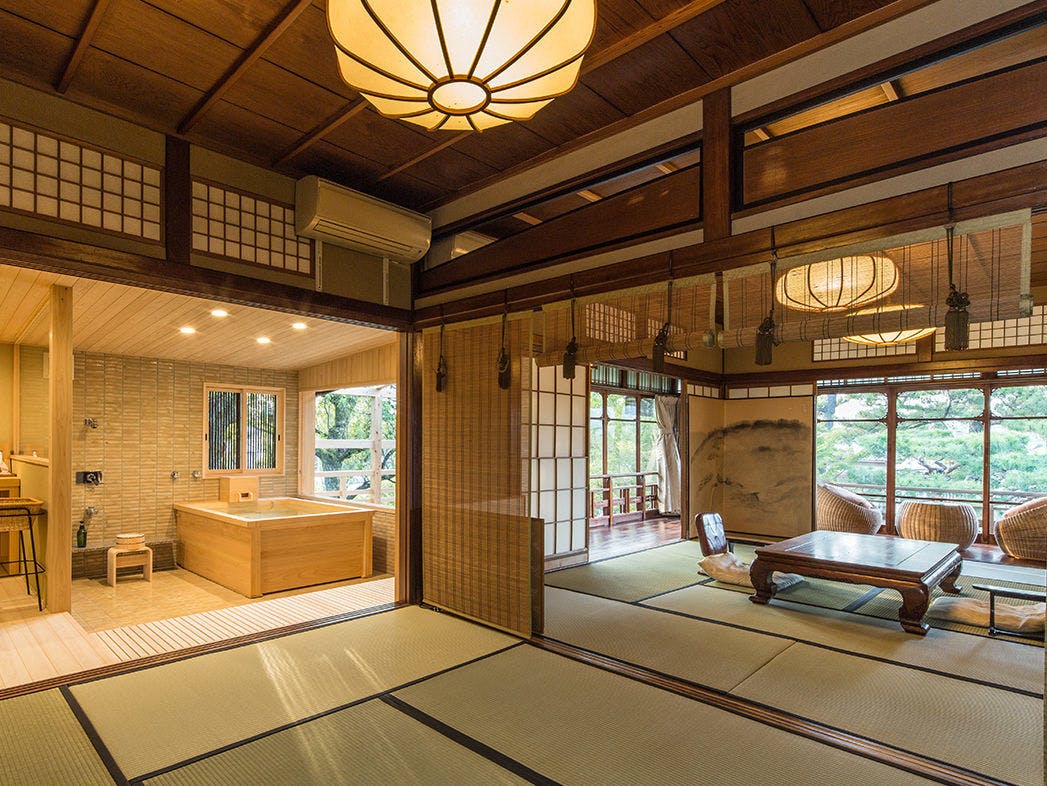 平成21年4月完成。世界のVIPのリクエストが反映された半露天庭園風呂付きの本館16帖「植治」のスイート【露天風呂付客室】1階庭側でのご宿泊。定員6名様。和布団のご用意となります。