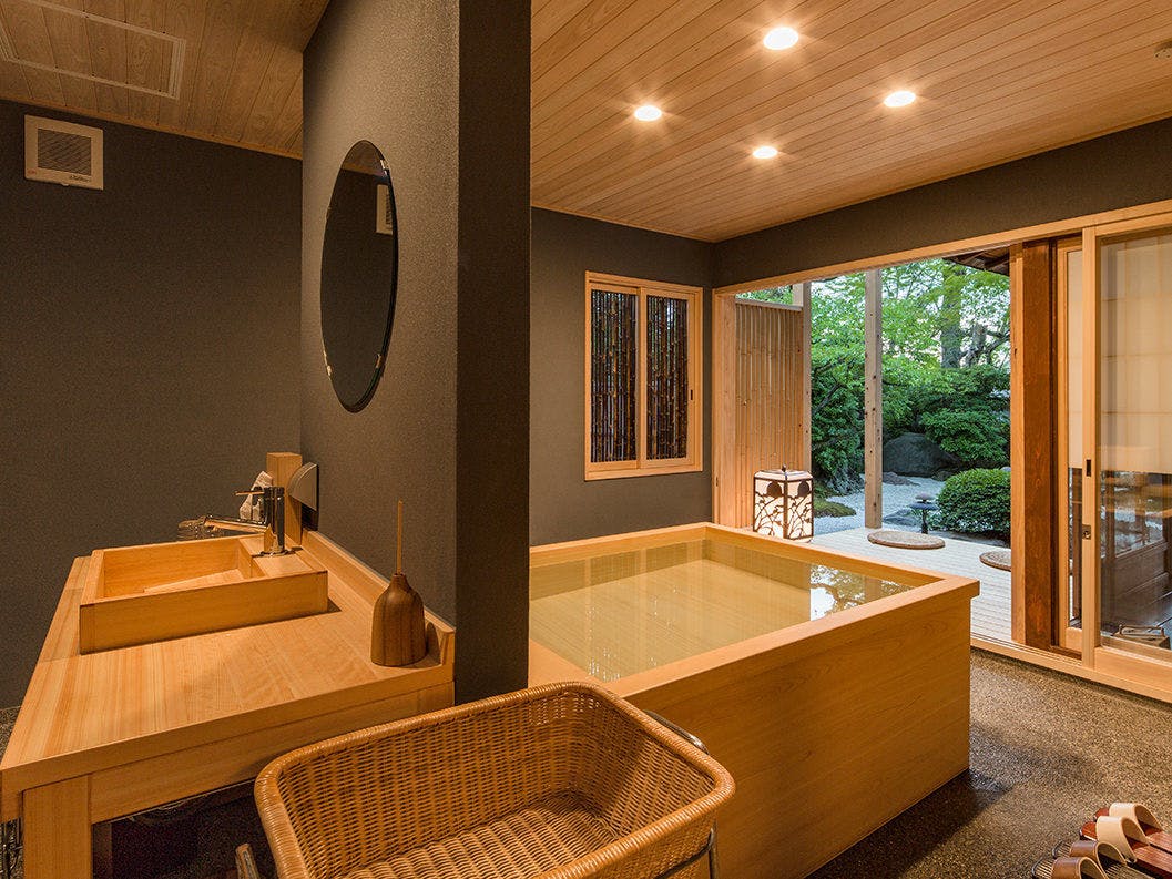 1915年より本館は庭に囲まれた「南禅寺別荘」として在りました。リノベーションされた浴室は客室を囲む樹齢200年の楠の緑と、数奇屋の伝統的な指物とガラス、W1600,D1500,H500,1200リットルもある総檜風呂で構成された簡素枯淡な空間が老舗旅館八千代の昔ながらの空間に新たな粋を演出いたします。総檜のパテオより半露天で四季の庭園をお楽しみいただけます。(平成28年4月完成)(20畳特別室・半露天風呂シャワートイレ付。WiFi・AppleTv完備。)