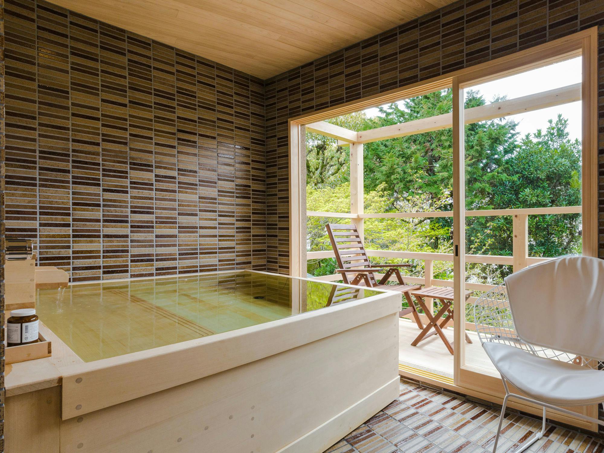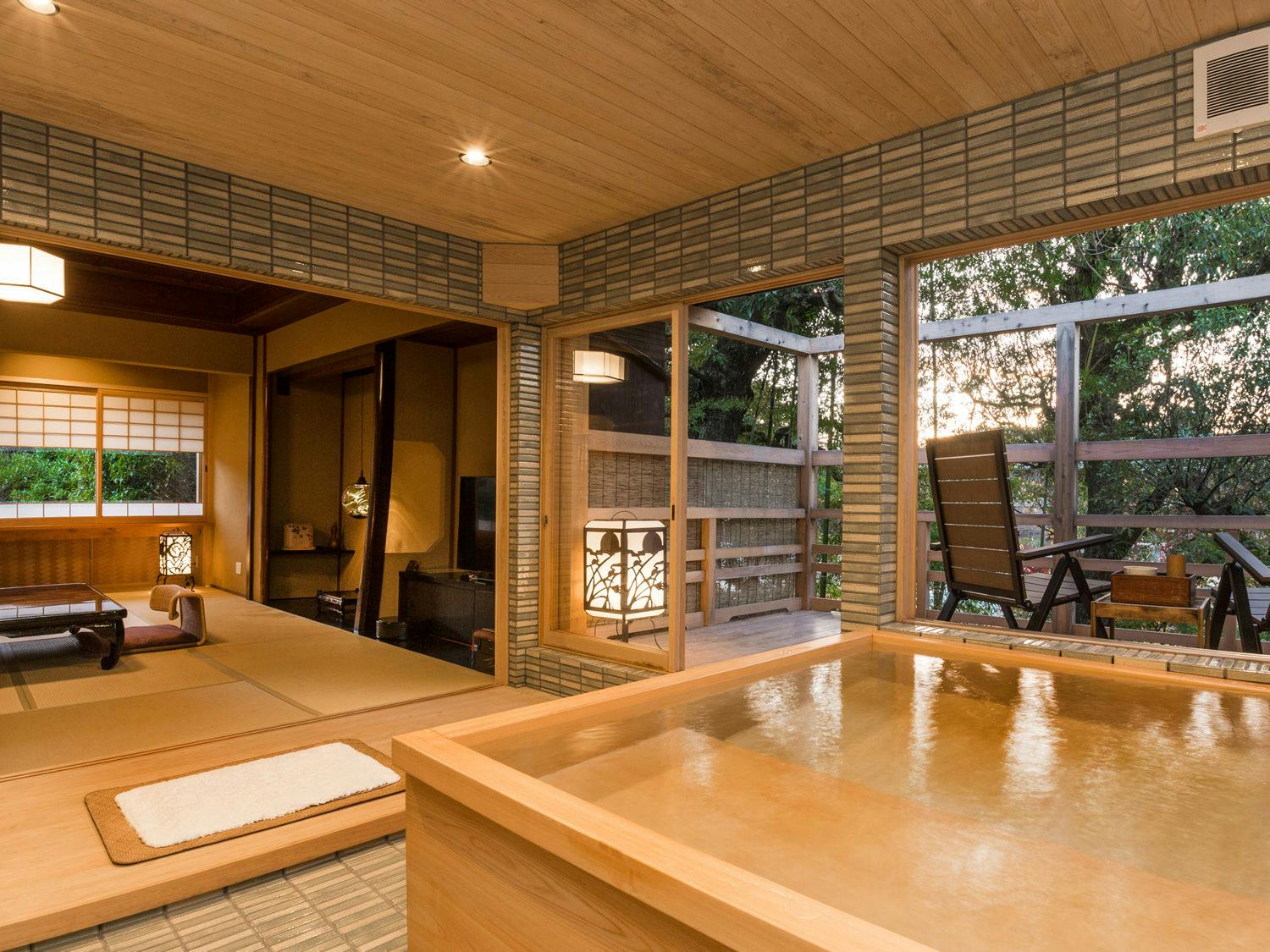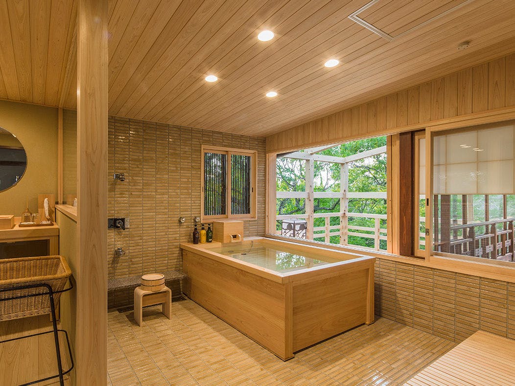 1915年より本館は庭に囲まれた「南禅寺別荘」として在りました。新しくリノベーションされた浴室は客室を囲む樹齢200年の楠の緑と、数奇屋の伝統的な洗い出し土間、聚楽壁と指物とガラス、W1500,H400,1000リットルもある総檜風呂で構成された簡素枯淡な空間が老舗旅館八千代の昔ながらの空間に新たな粋を演出いたします。総檜のパテオより半露天で四季の庭園をお楽しみいただけます。(平成29年4月完成)(8畳特別室・半露天風呂シャワートイレ付。床暖房完備。WiFi・AppleTv完備。)●当館は館内禁煙なっております。喫煙はテラスにてお願いいたします。