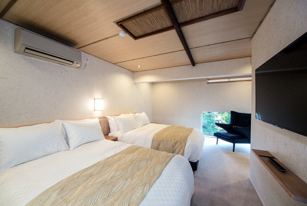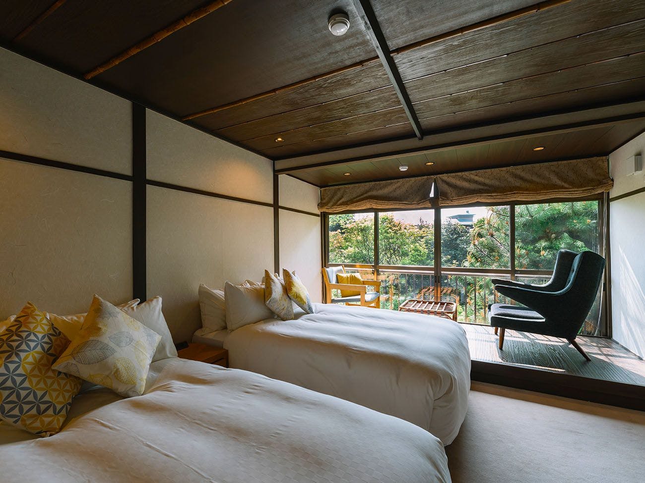 平成27年4月完成。世界のVIPのリクエストが反映された半露天風呂付きの本館の簡素枯淡な本間12畳と134cm×203cmハリウッドツインスタイルのベッドルームの10畳と簡易キッチン、全自動洗濯機完備のコンドミニアムスタイルの「植治」2階庭側の庭園客室。3~6名様利用の場合は和布団をご用意します。