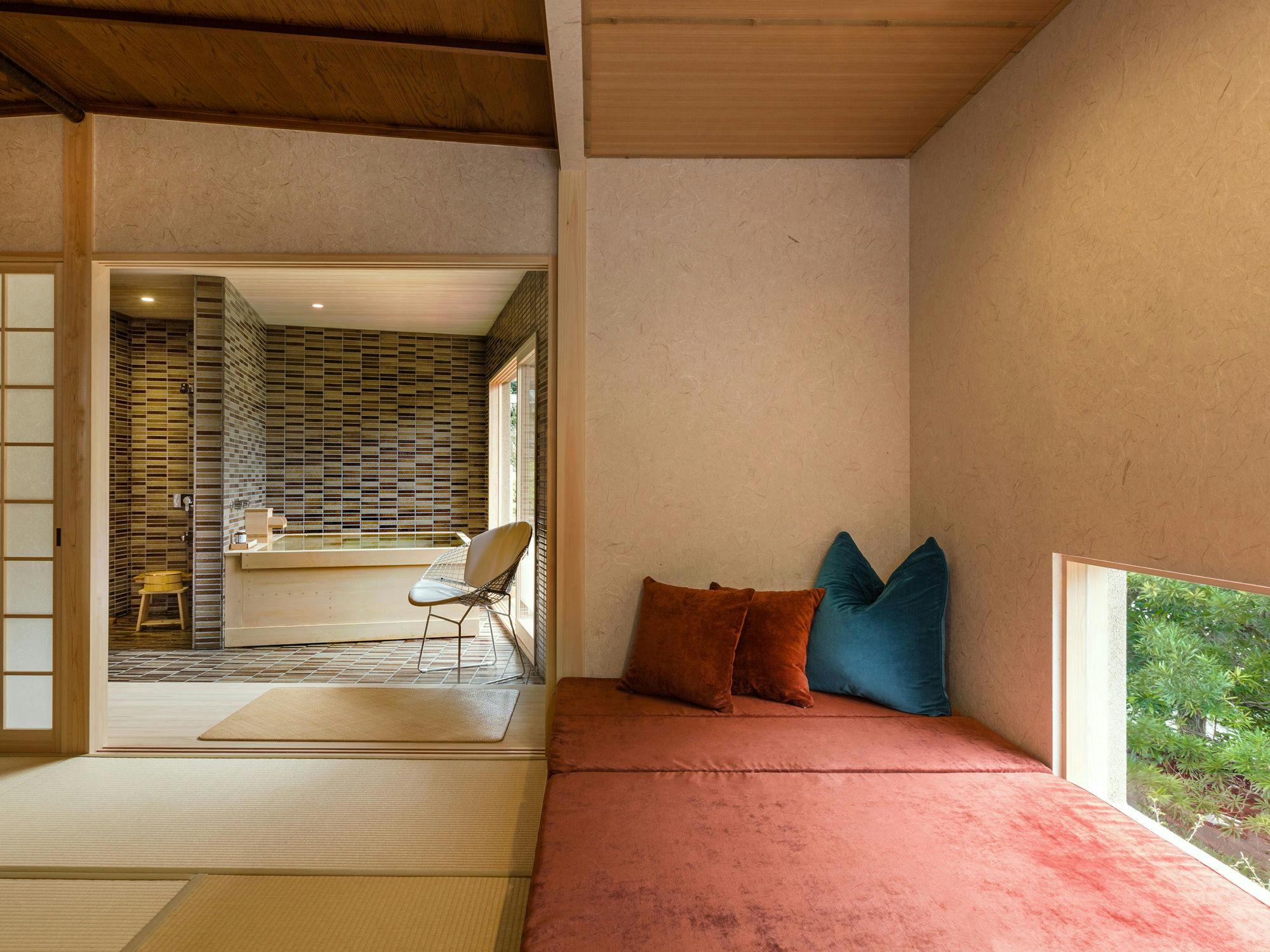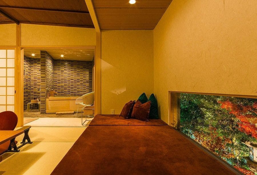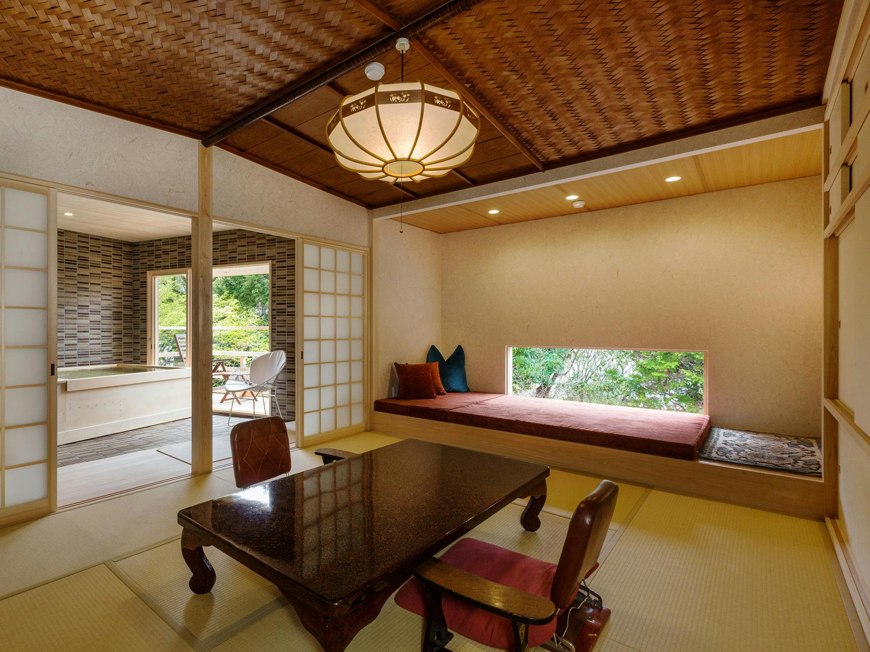 平成29年4月完成。世界のVIPのリクエストが反映された半露天庭園風呂付きの本館の簡素枯淡な本間8畳とデイベッド「植治」2階庭側の庭園客室。