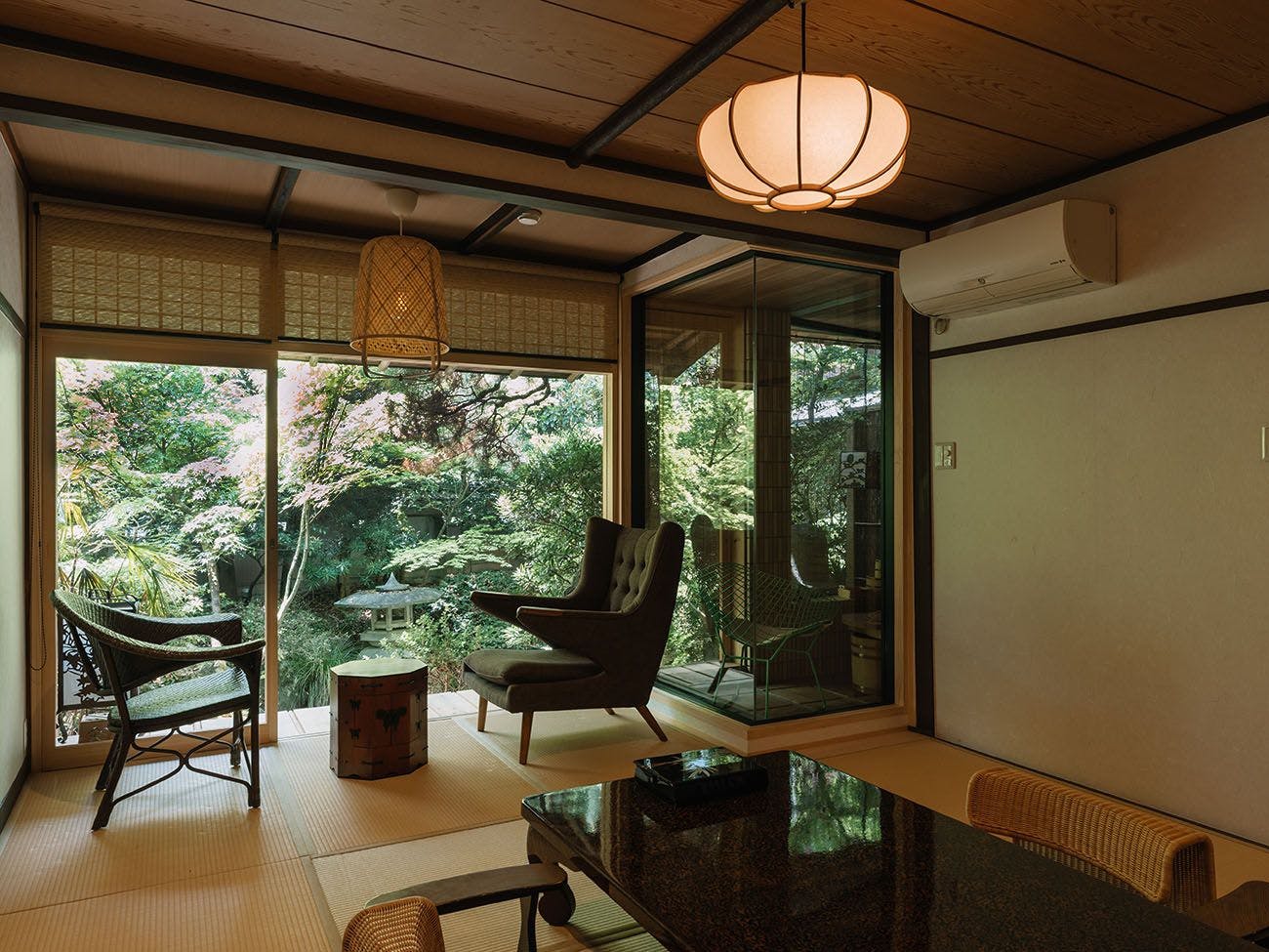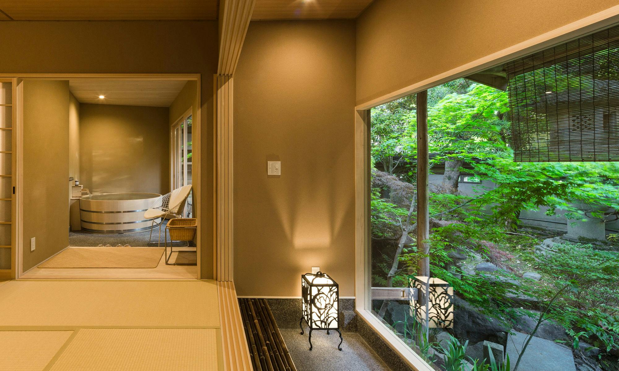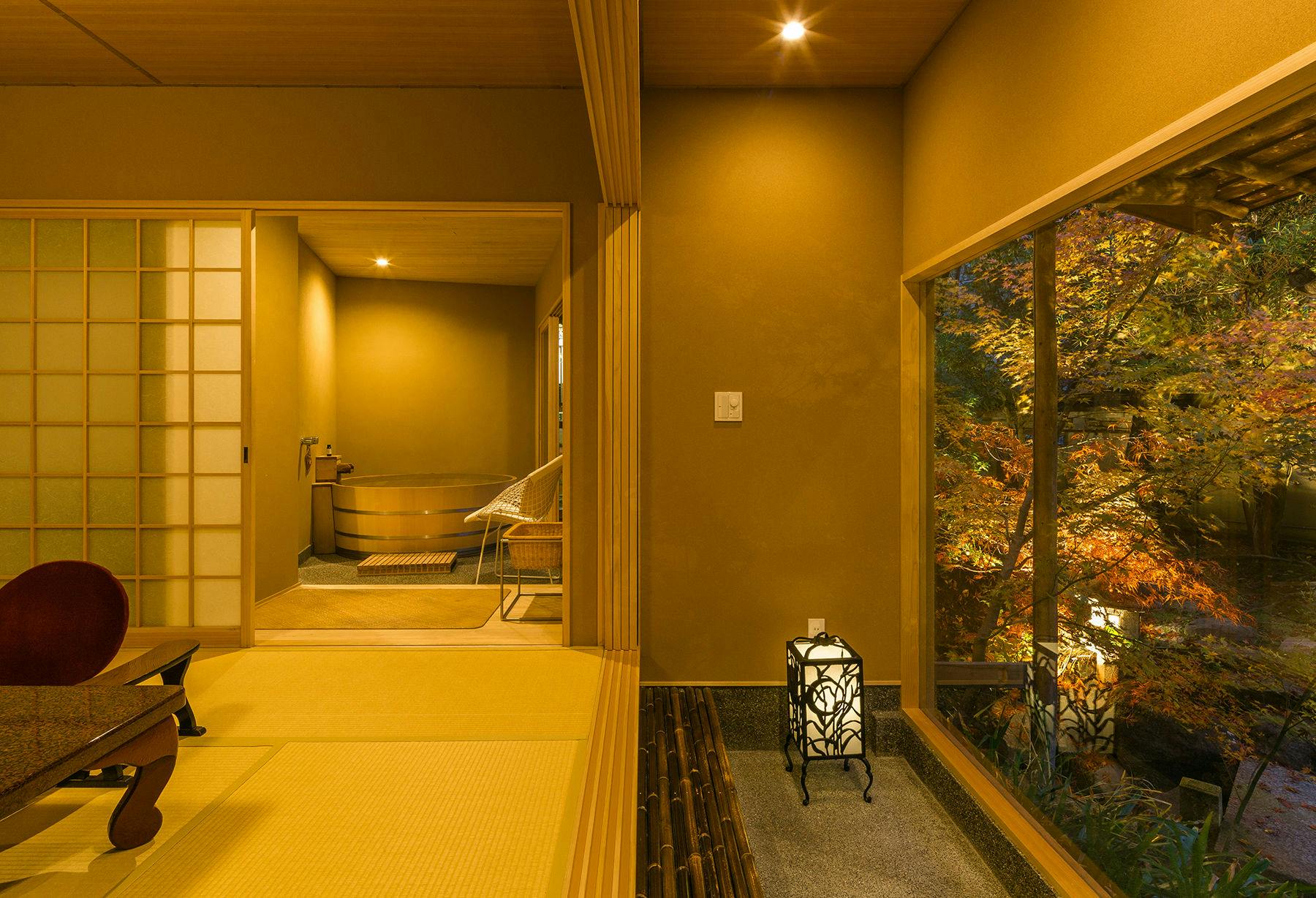 平成26年8月完成。世界のVIPのリクエストが反映された半露天庭園風呂付きの本館の簡素枯淡な本間8畳と控えの間8畳「植治」1階庭側の1階庭側庭園客室。