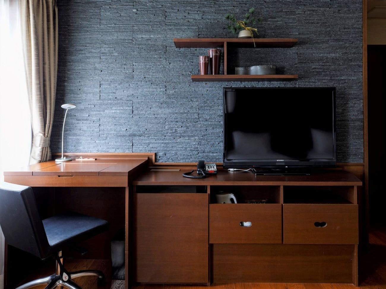 人間工学デザインのデスクチェアと広々としたライティングデスクで、お客様に快適なビジネス空間とリラックスタイムを提供します。