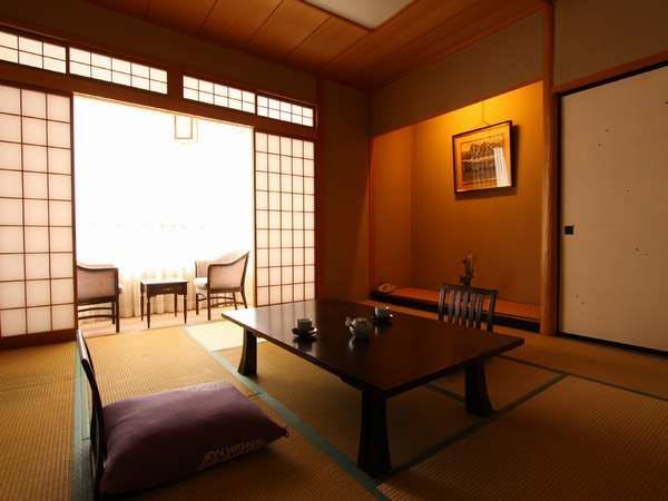 10畳+広縁付きの和室です。トイレ・洗面・バス付き。トイレはシャワートイレです。川のせせらぎを聞きながらゆっくりとお過ごし頂けます。