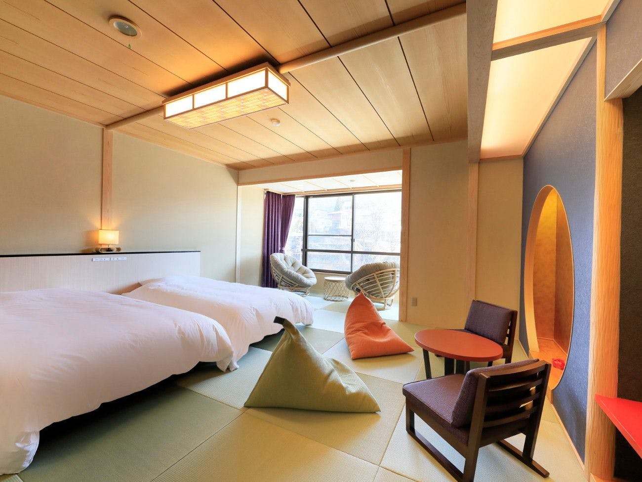 和の伝統「平安」を意識した現代アレンジの川側客室和洋室16畳 ツインベッドのお部屋です。トイレ・洗面・シャワーブース付き。川のせせらぎを聞きながらゆっくりとお過ごし頂けます。