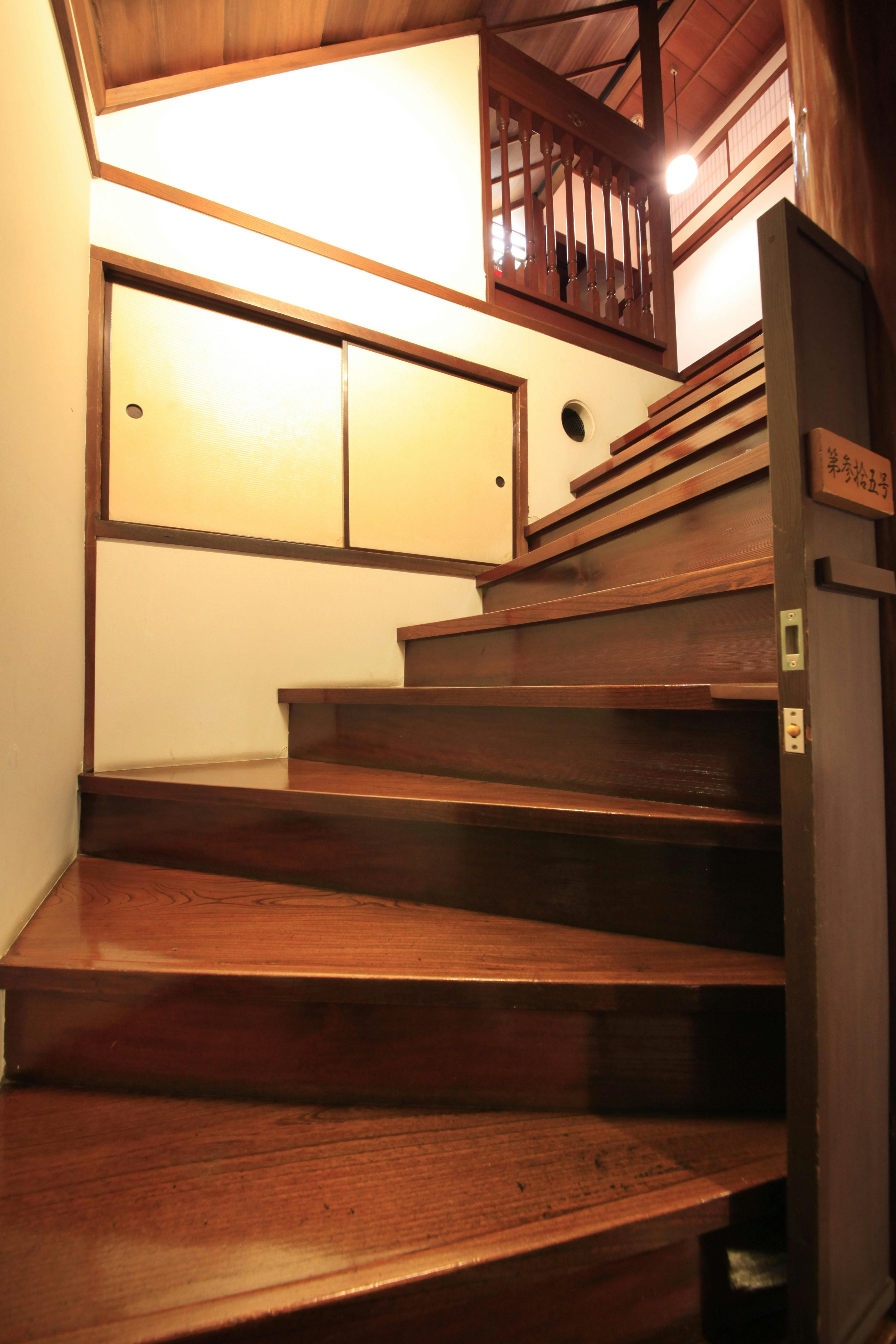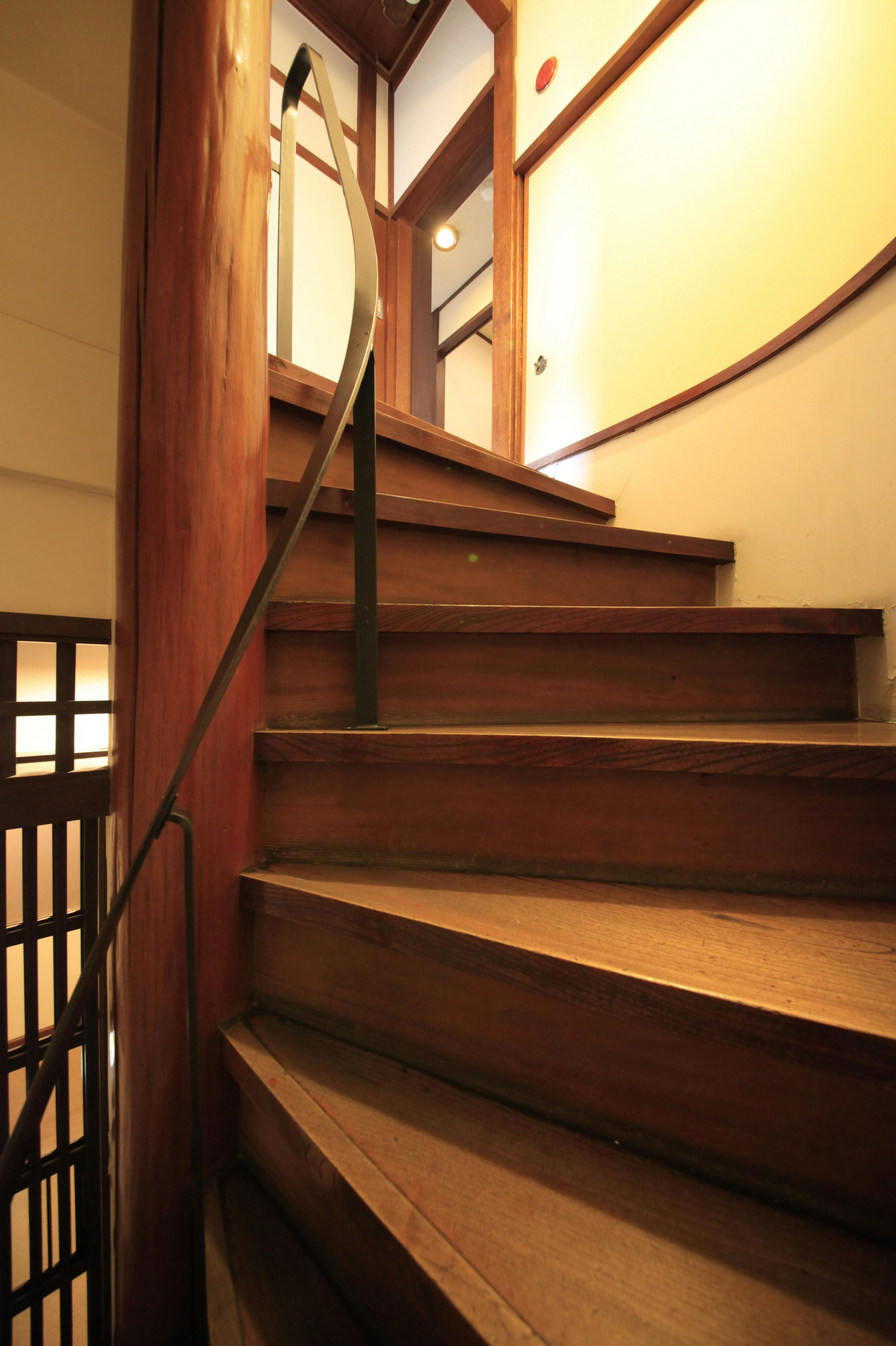 階段で三階迄お昇りいただきます。明治の螺旋階段で、当時としては、勾配を少しでもゆるやかにしておりますが、現代からみると急な階段となっております