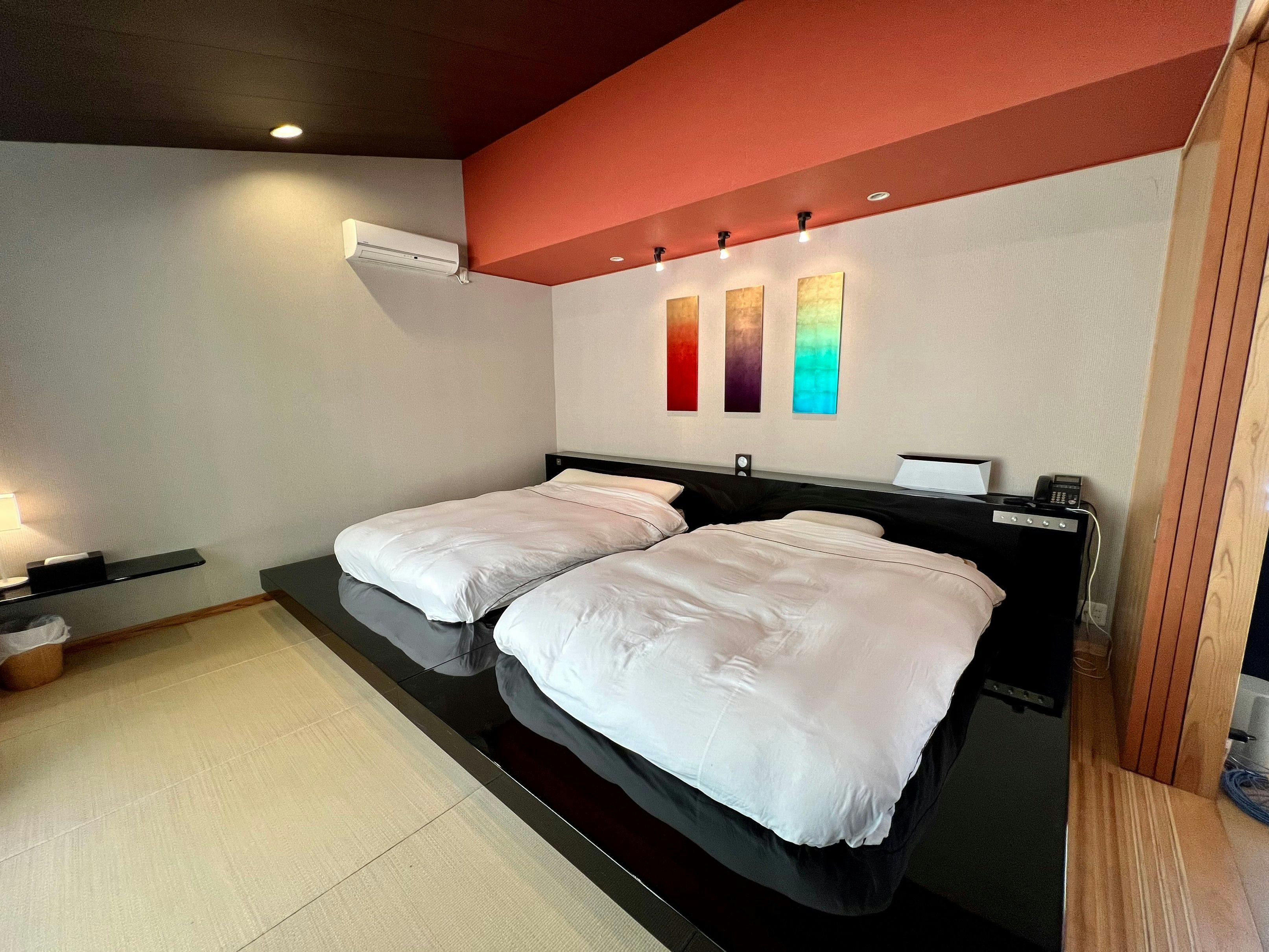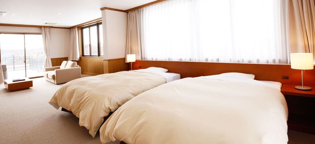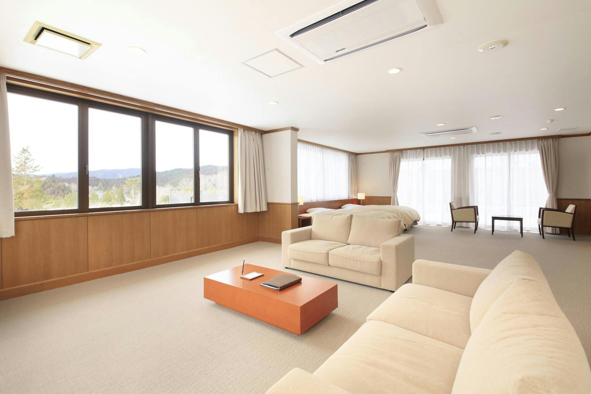 本館唯一の2Fに位置するスイートルームは、室内118平米、窓外には室内とほぼ同じ広さのルーフバルコニーが拡がり、天馬夢の敷地はもちろんのこと周囲の山々を見渡せる開放感抜群のお部屋です。家具は木製を中心にやさしい素材を使用しており、枕やタオル、アメニティについてはこだわりの品をご用意しております。※館内は携帯の電波がつながりづらくなっております。通信は無料wifiや有線LANをご利用ください。