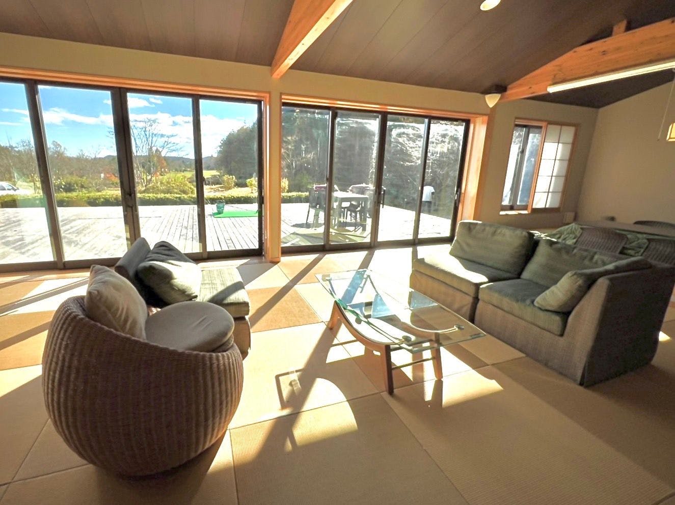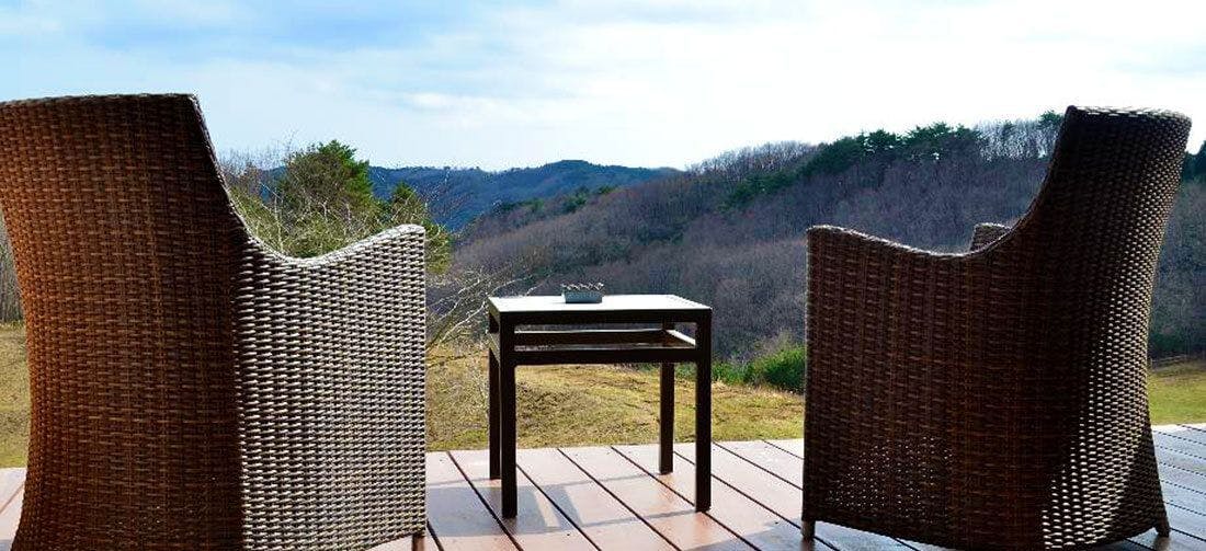 室内39.06平米、窓外には15.12平米のウッドデッキが拡がり、非日常を体験していただくため広い作りとなっております。家具は木製を中心にやさしい素材を使用しており、枕やタオル、アメニティについてはこだわりの品をご用意しております。※館内は携帯の電波がつながりづらくなっております。通信は無料wifiや有線LANをご利用ください。