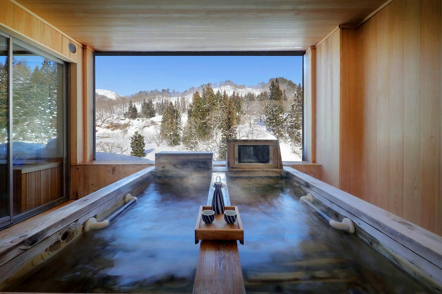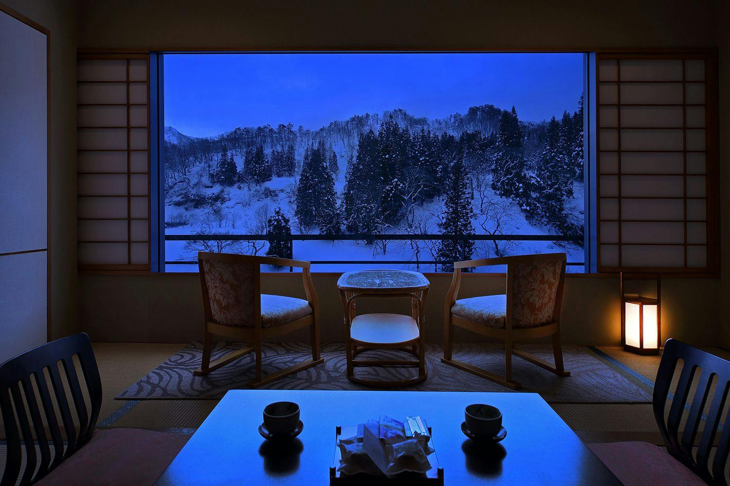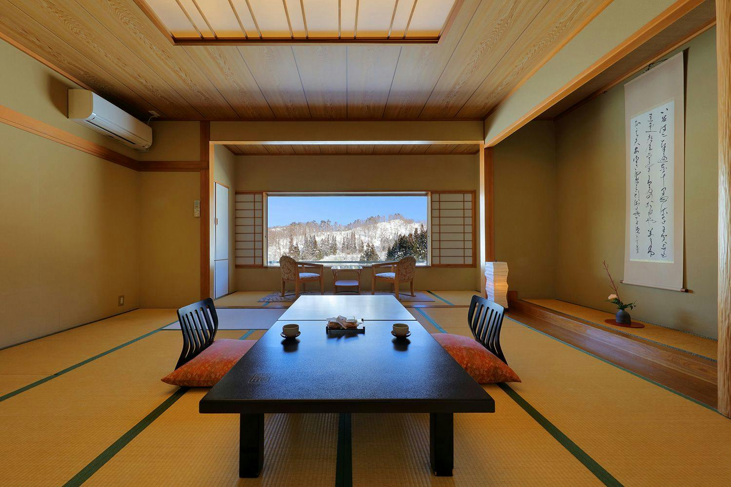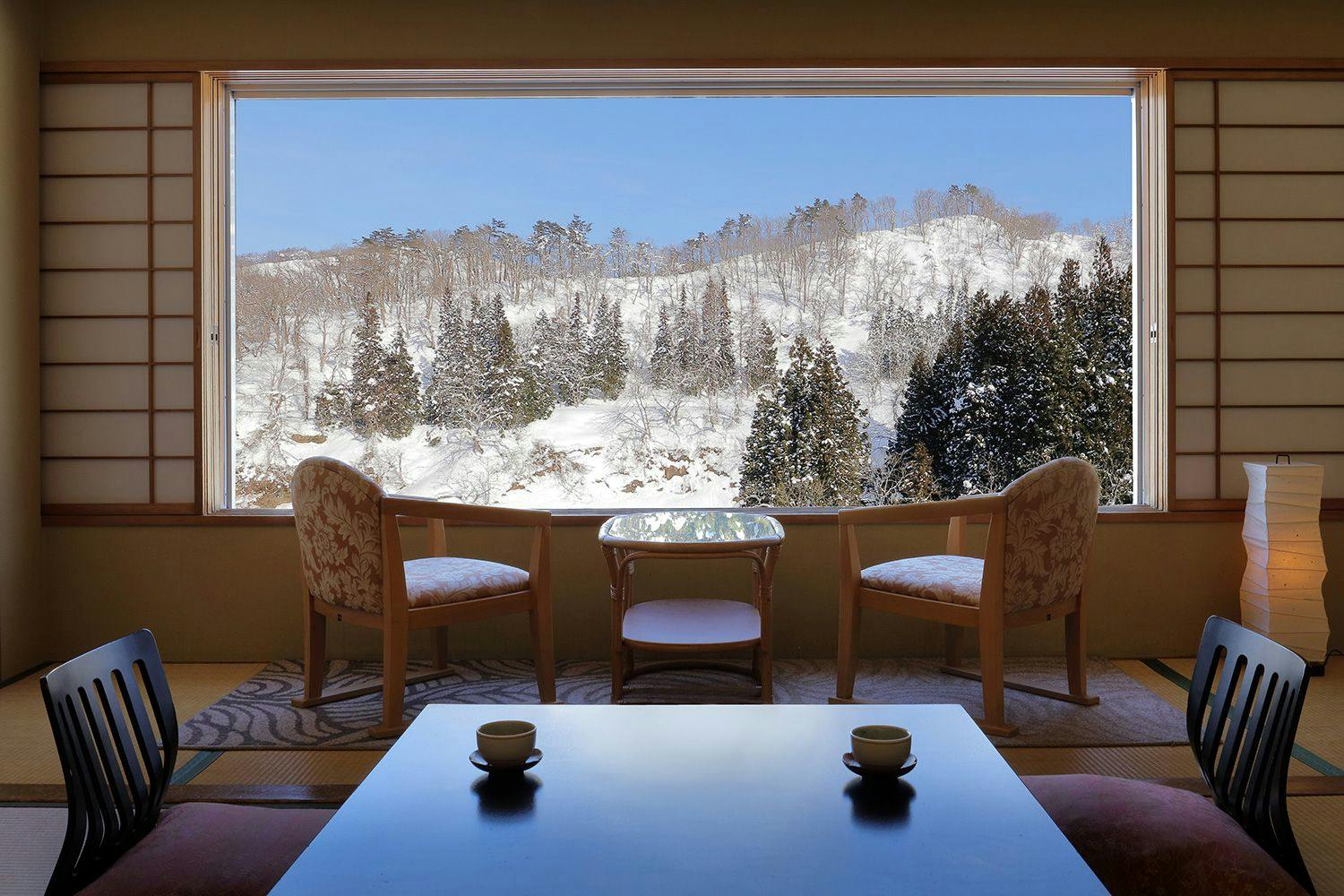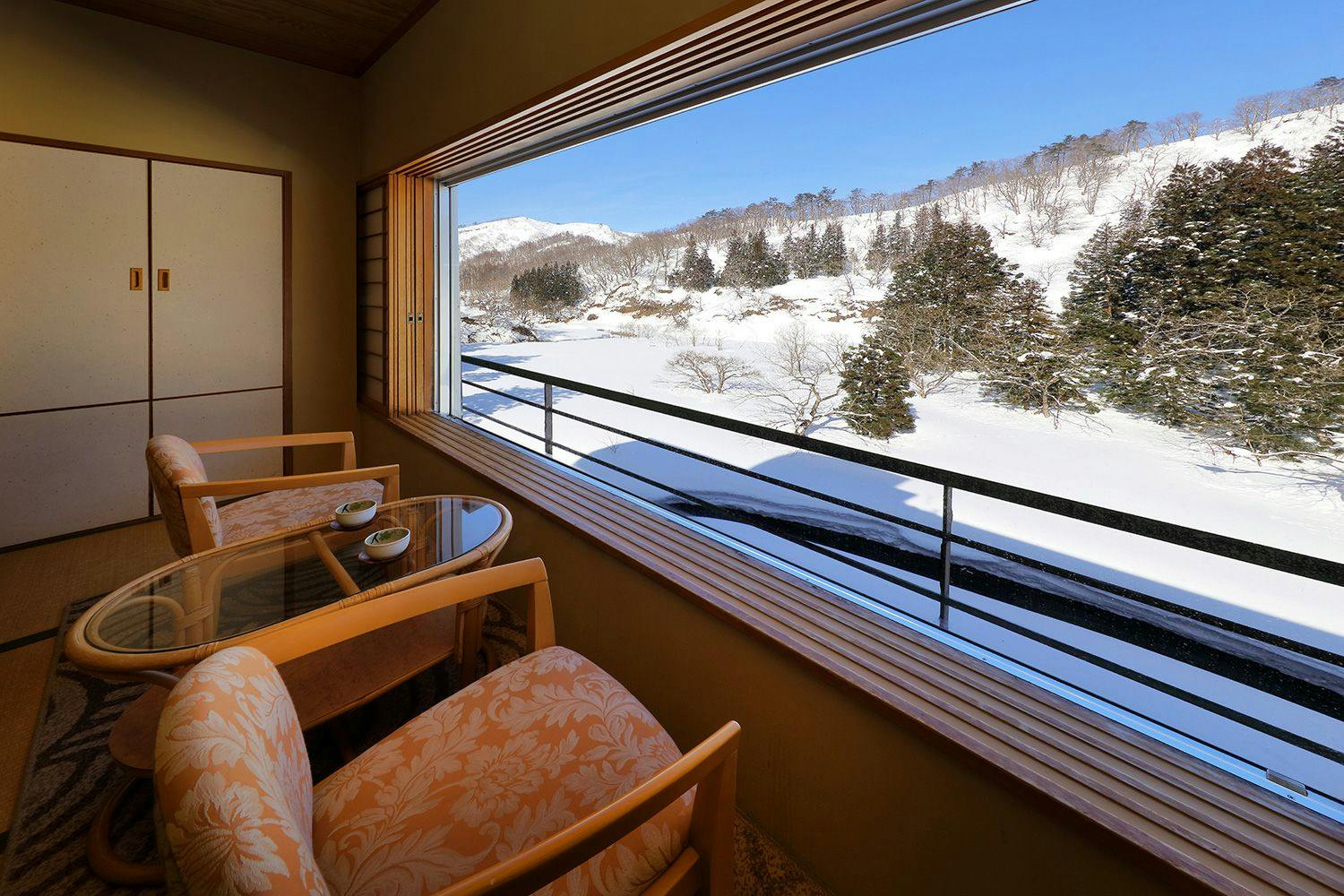 和室にプライベート半露天寝湯が付いた客室です。寝湯の大きな窓から眺める銀山川の雄大な自然は四季の移り変わりを感じることができて、このお部屋一番のお勧めポイントです。