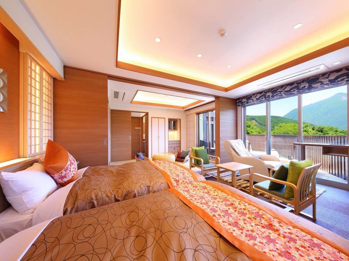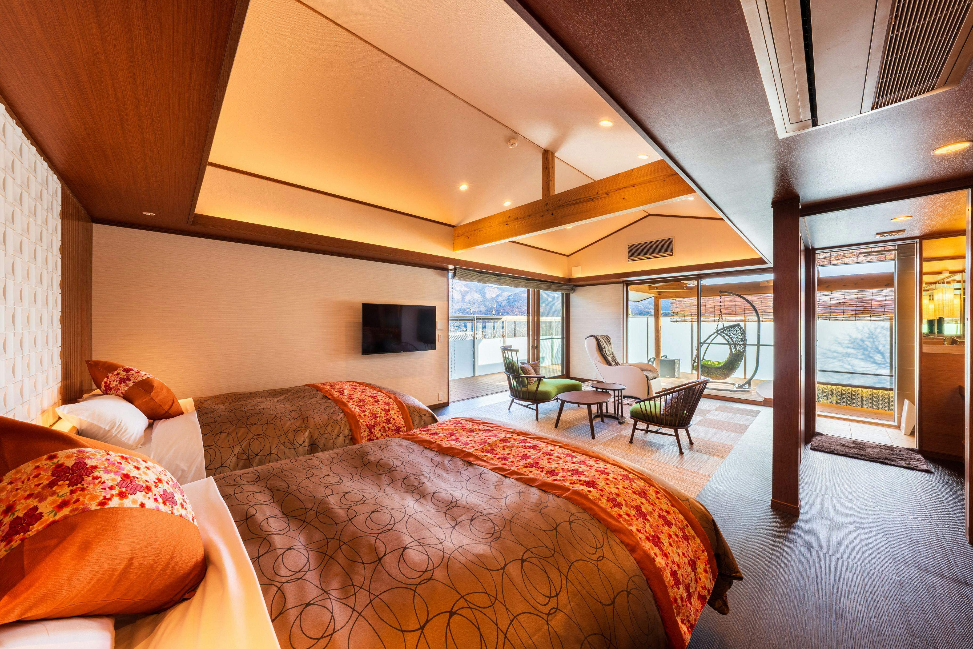 寝室(ツインベッド)と和室、内湯、露天、テラス付き。ベッドは体に優しいシングルコイル、ゆとりの140センチサイズです。