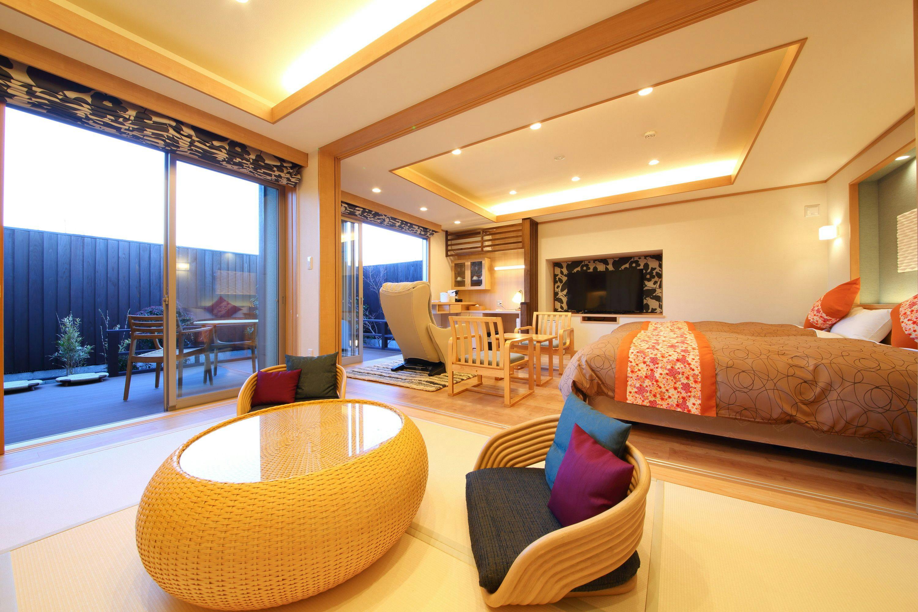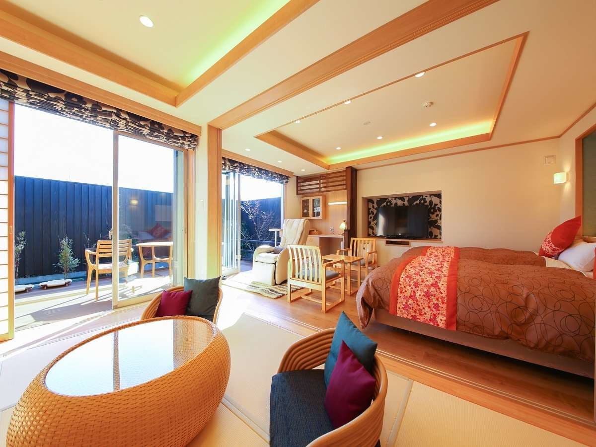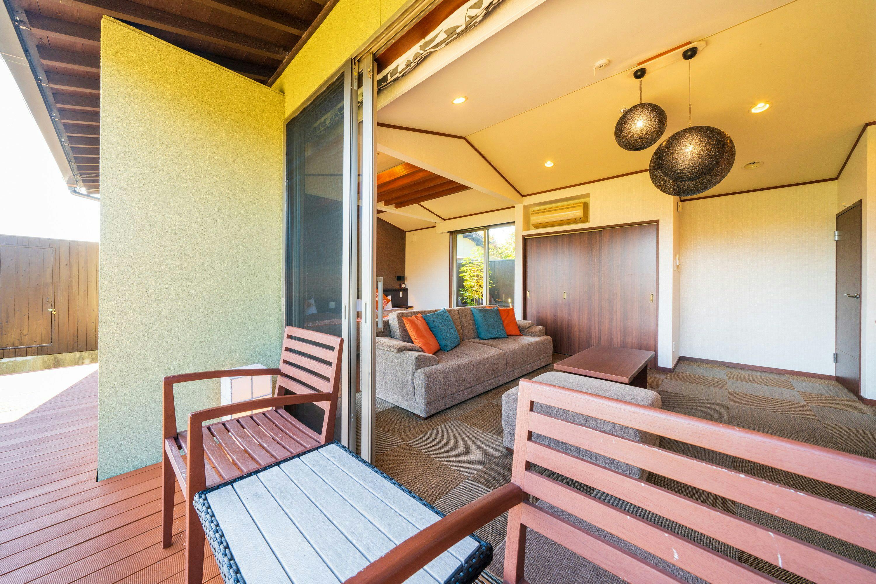 露天風呂付き客室離れ洋室です。客室に中央にソファーがあり、そのままテラスに出る事も出来ます。