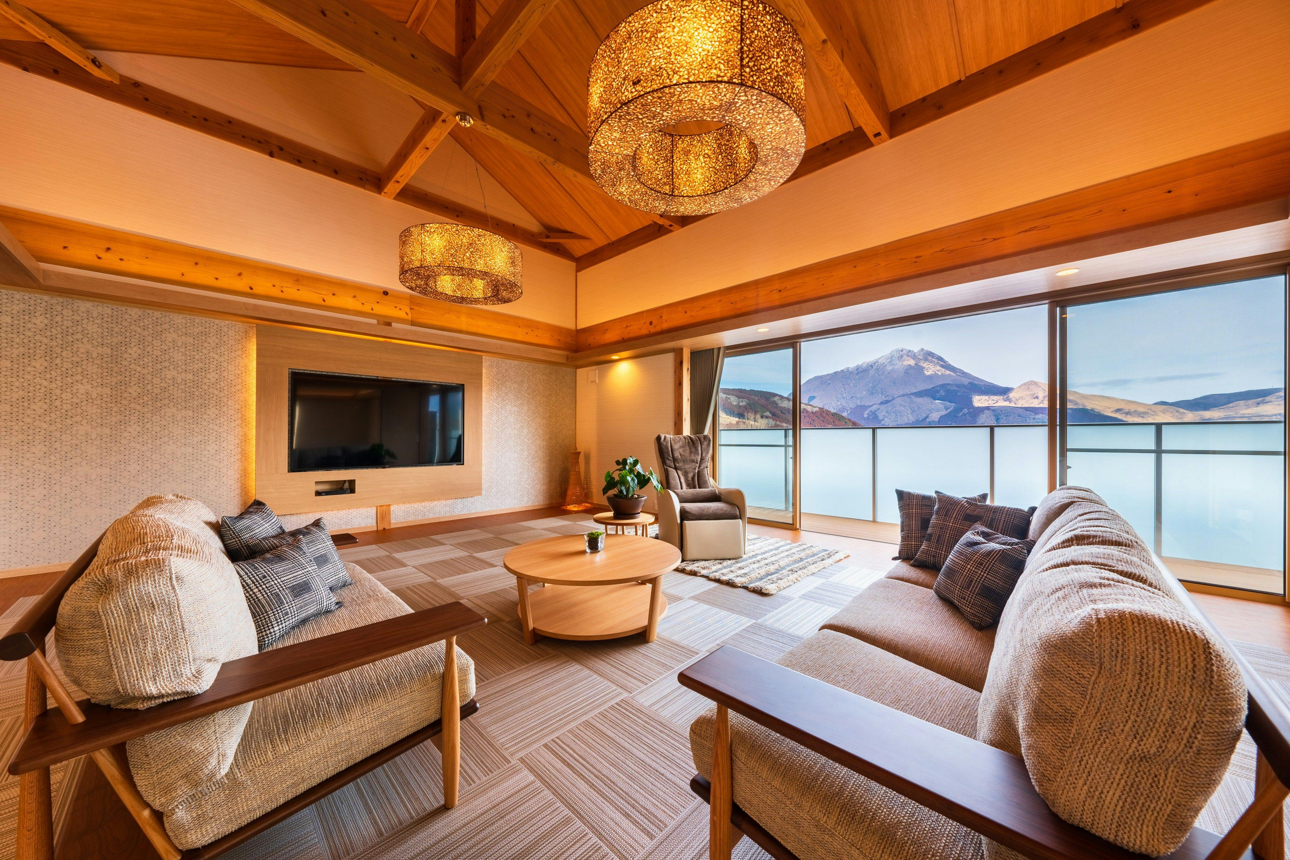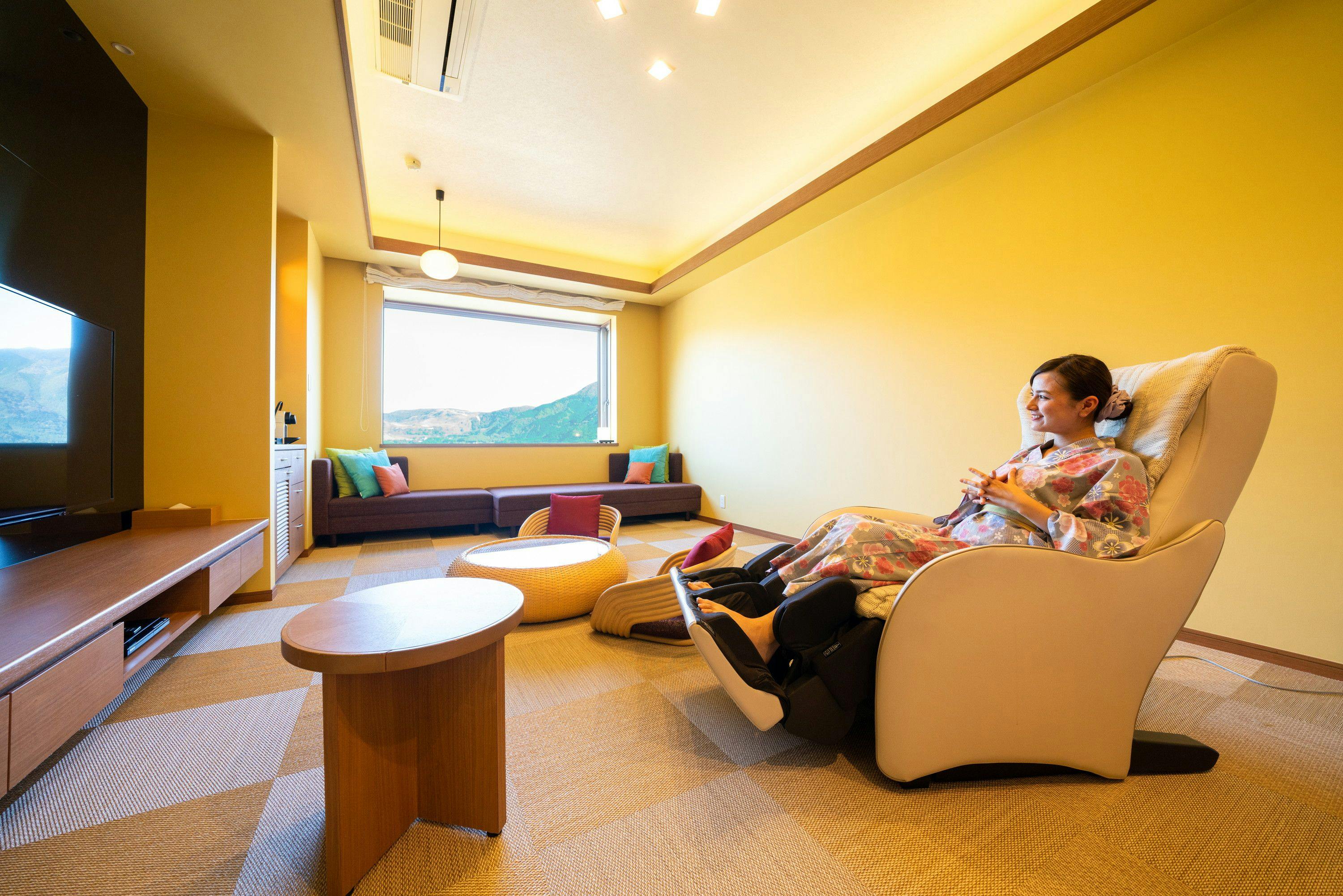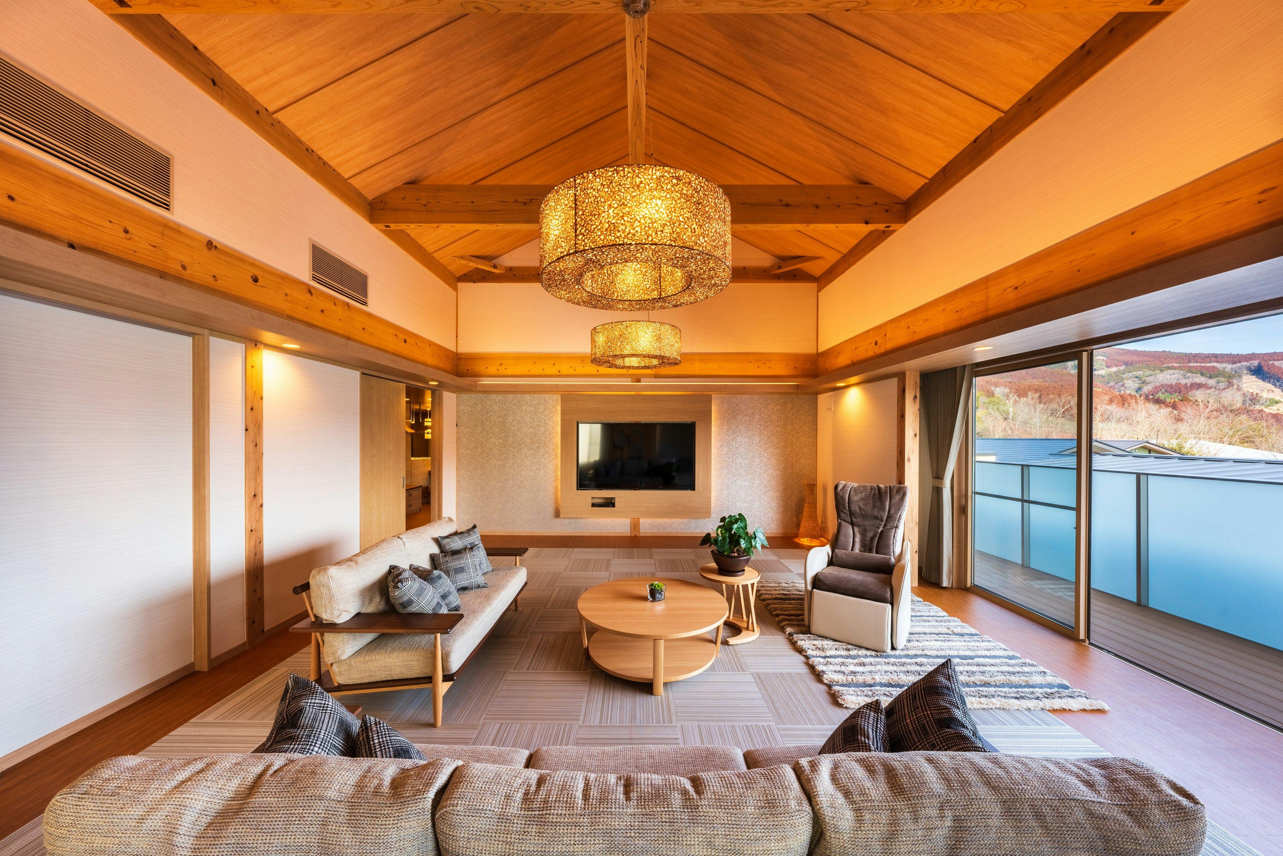 露天風呂付き客室離れ洋室です。客室に中央にソファーがあり、そのままテラスに出る事も出来ます。