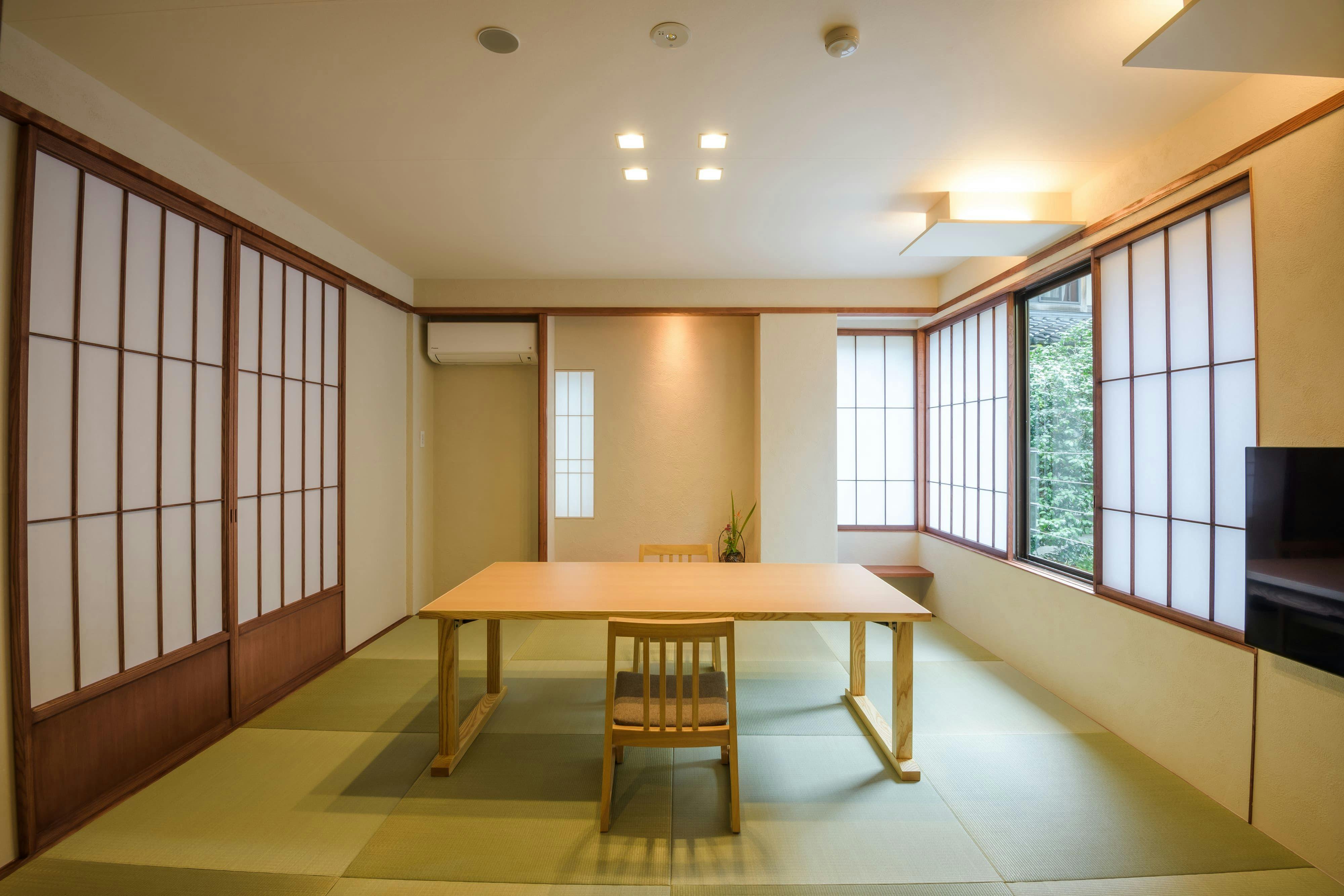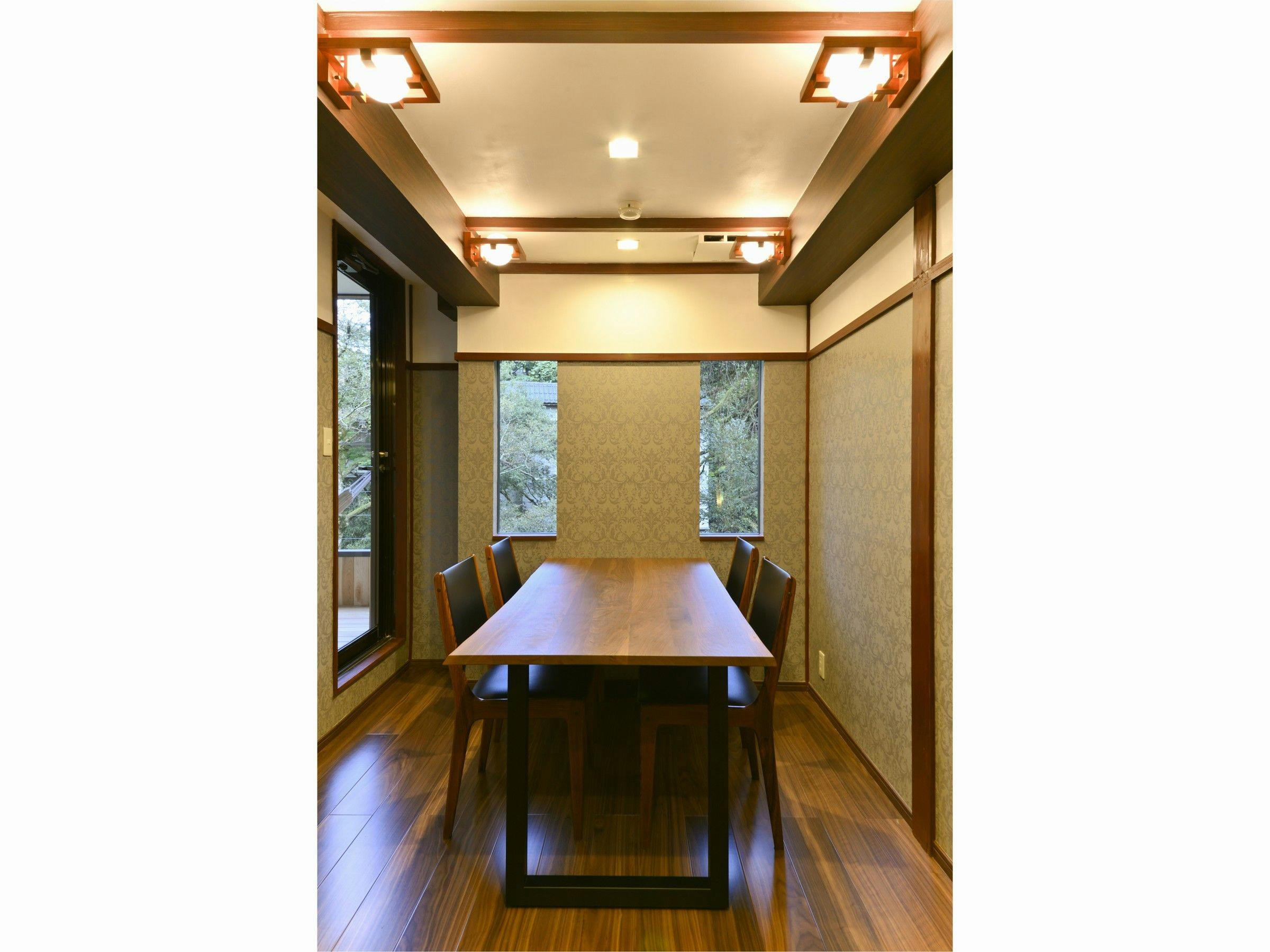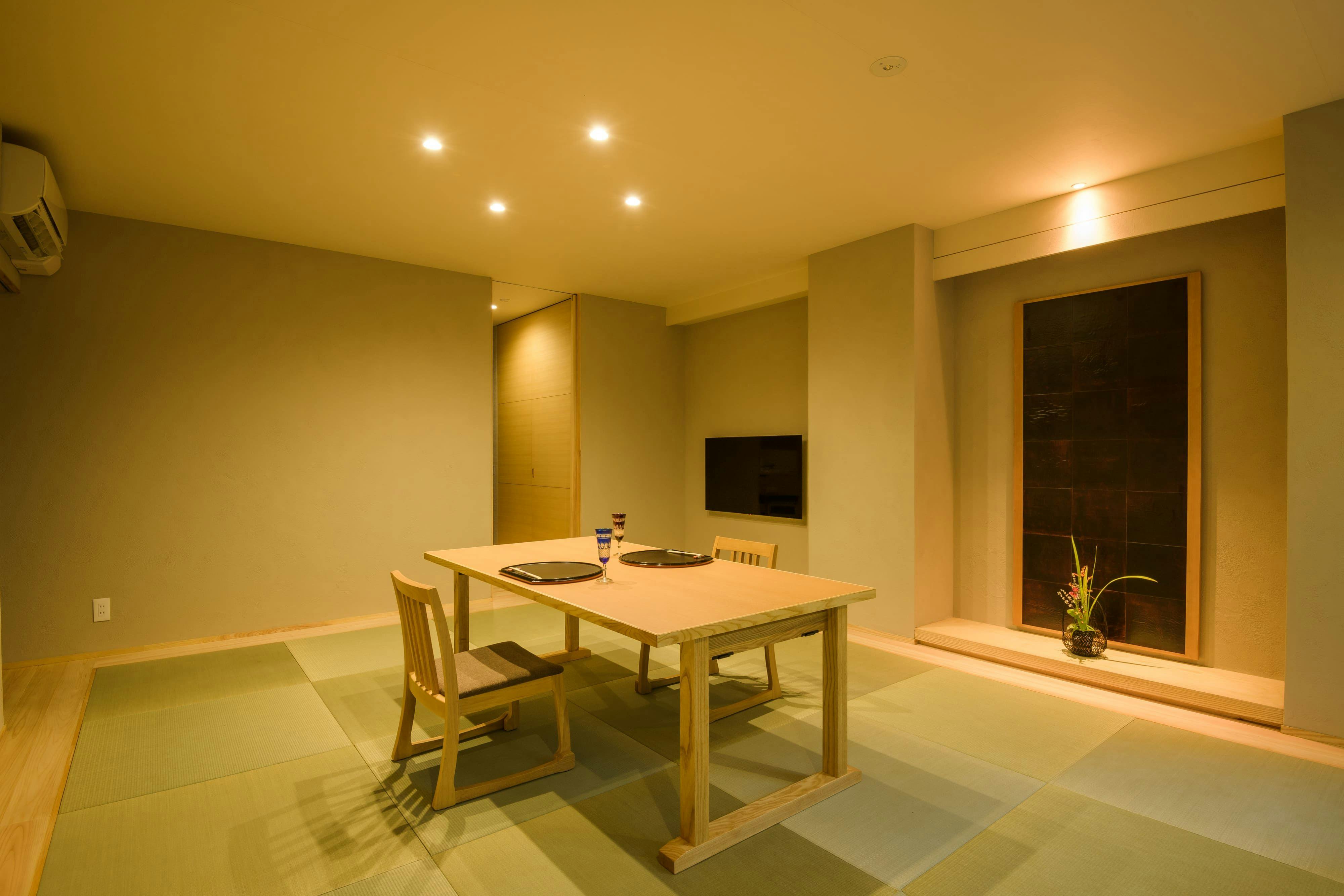 ベッドルームにはプロジェクタースクリーン、ウォークインクローゼットを配し、お食事は和室12畳のダイニングテーブルで朝夕ともにゆっくりとオーナーシェフのお料理をお楽しみ下さいませ。