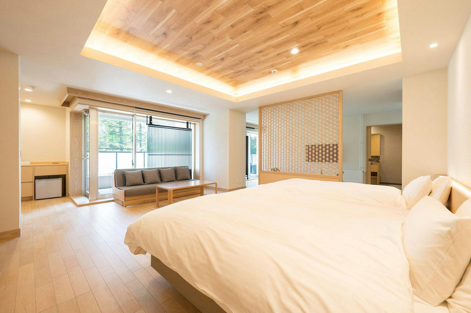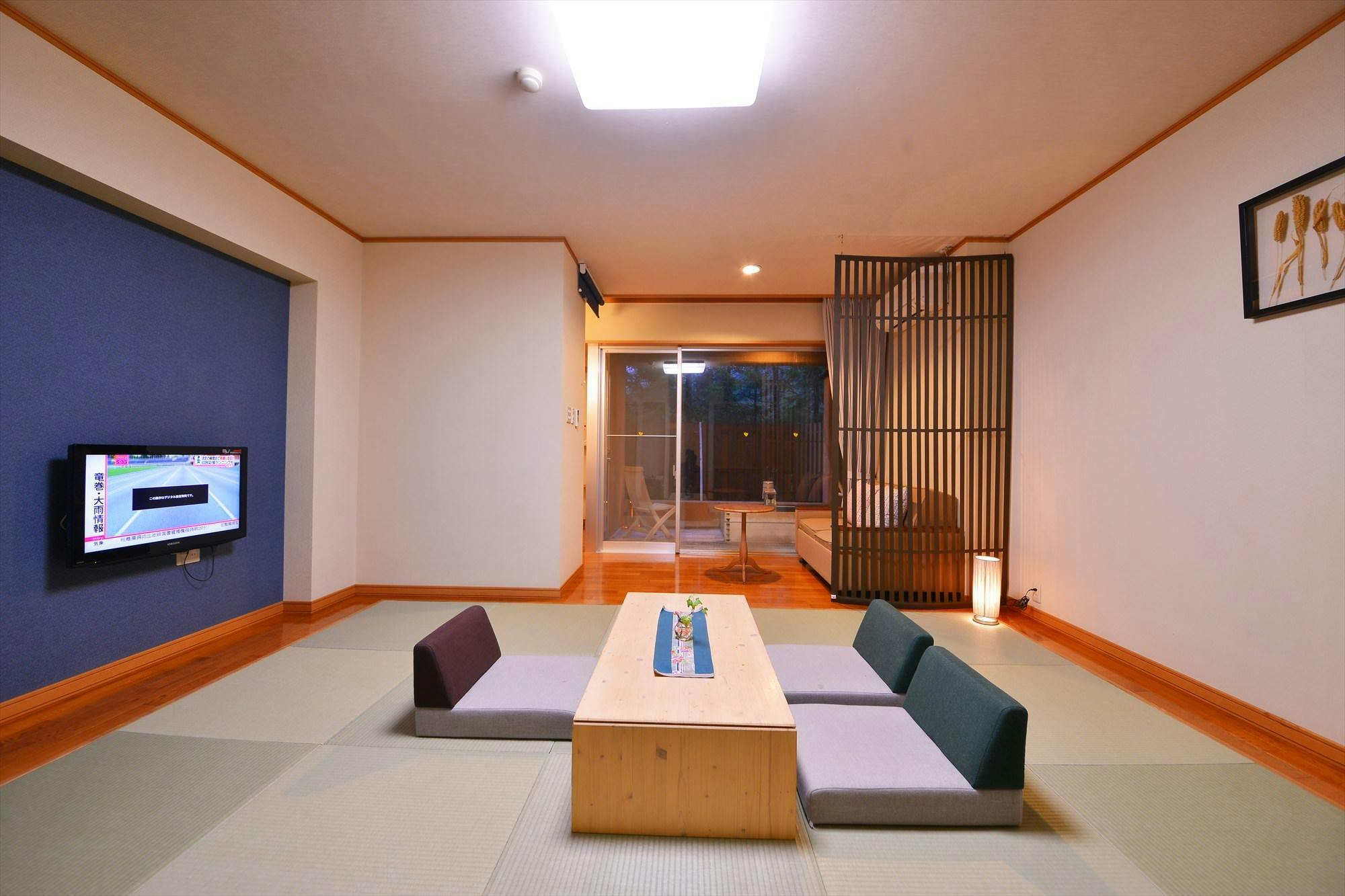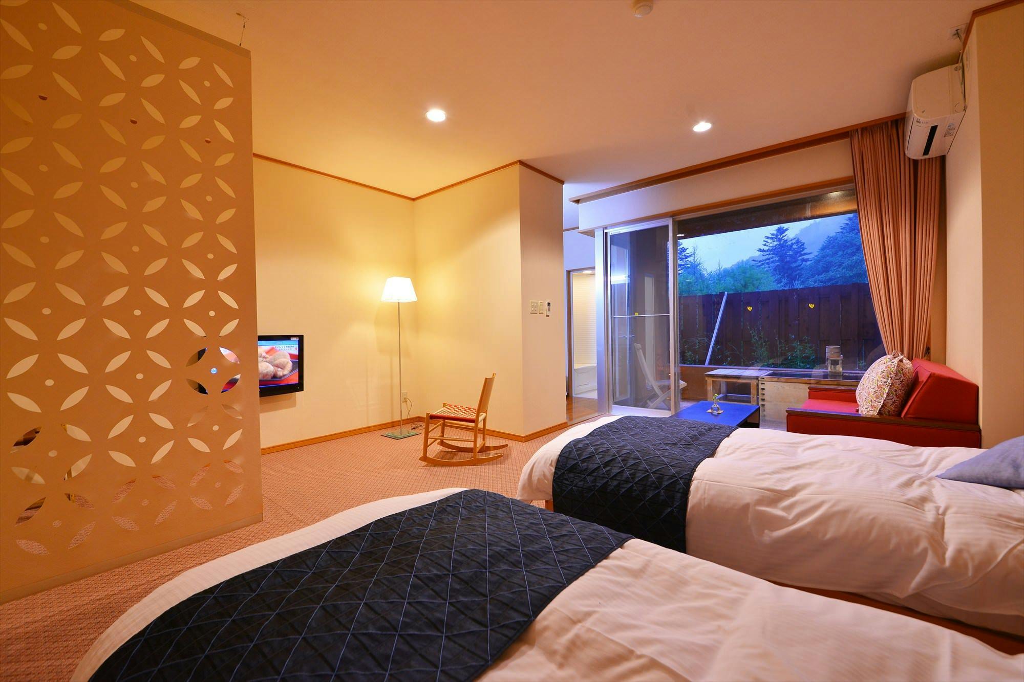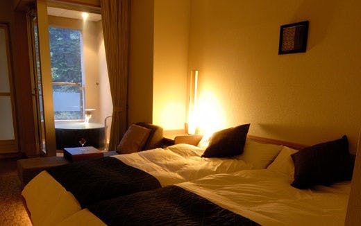 フローリング貼りの洋室にはローベッドが2つ。リビングルームは素足に優しい畳敷きで、窓辺には露天風呂をご用意しています。光あふれる日中と照明が灯る夜とではお部屋の印象が一変。ナチュラル&ムーディーな雰囲気をお楽しみいただけます。※当館はエレベーターがございません。ご年配の方やお御足の悪い方は1階の欧スタイルの客室がおすすめです。