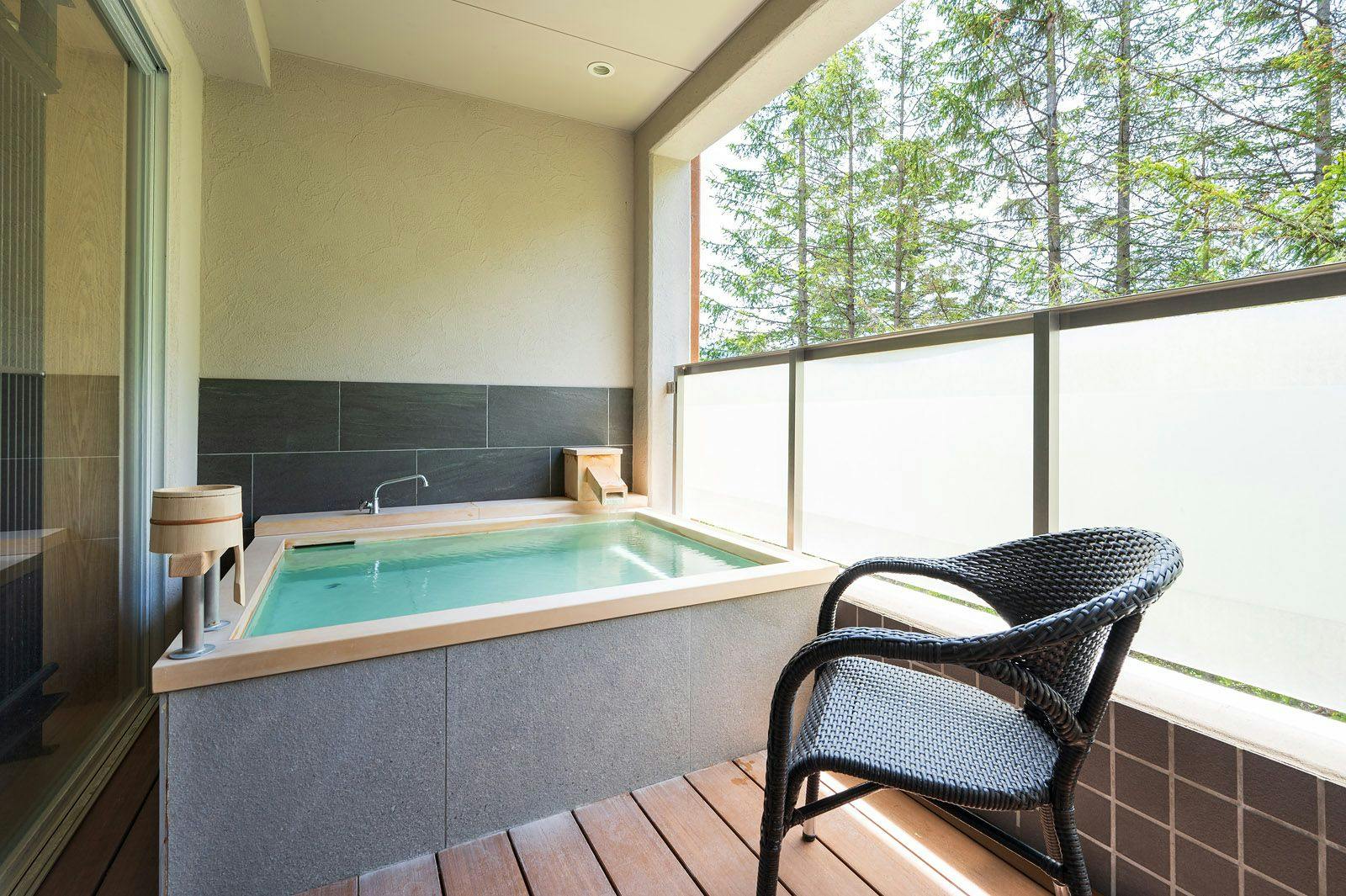 天然温泉100%掛流しの露天風呂+シャワーブース付と和の洒落た空間が人気の客室(※各室全て趣が異なるこだわりのお部屋、2~3名対応)※当館はエレベーターがございません。ご年配の方やお御足の悪い方は1階の欧スタイルの客室がおすすめです。