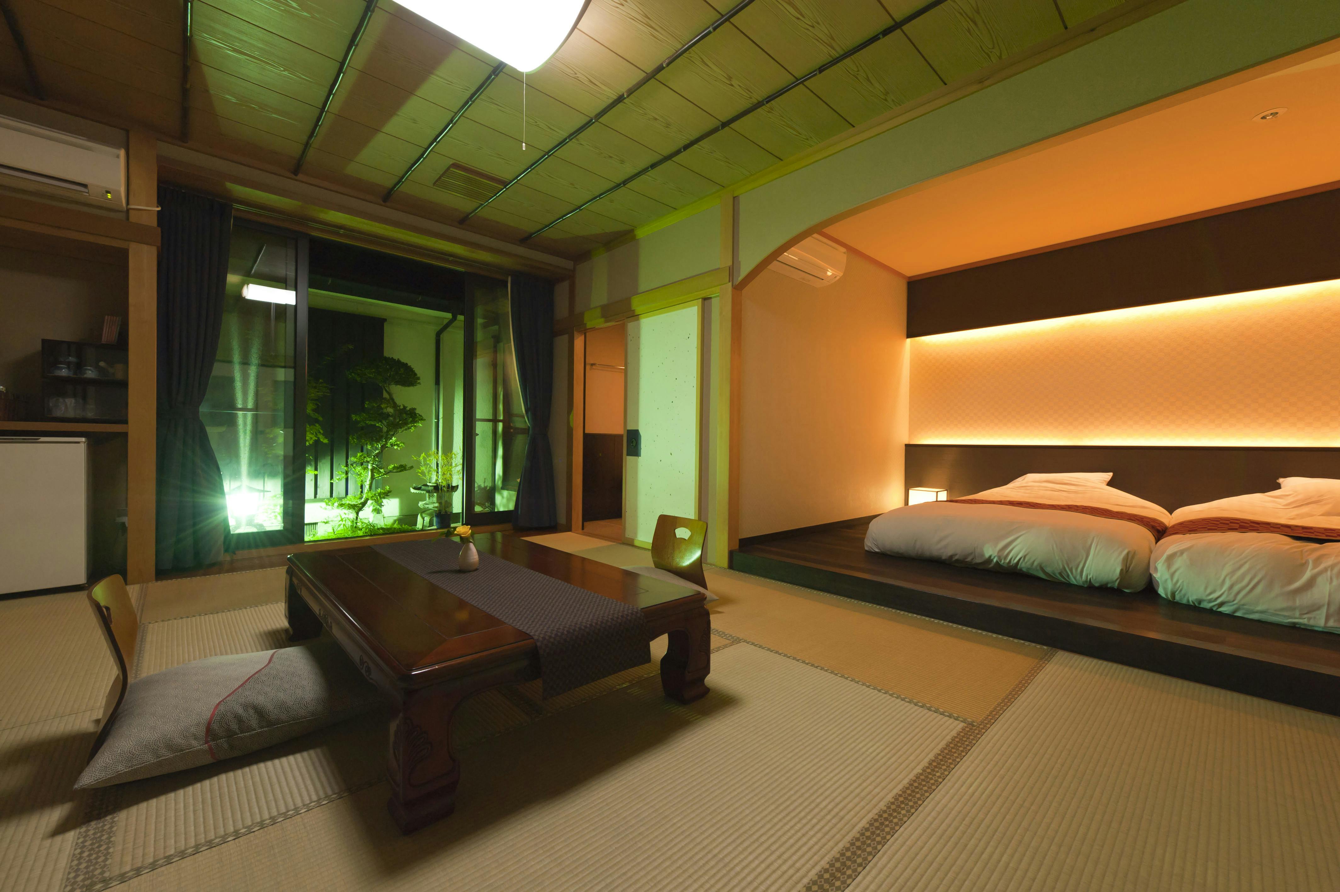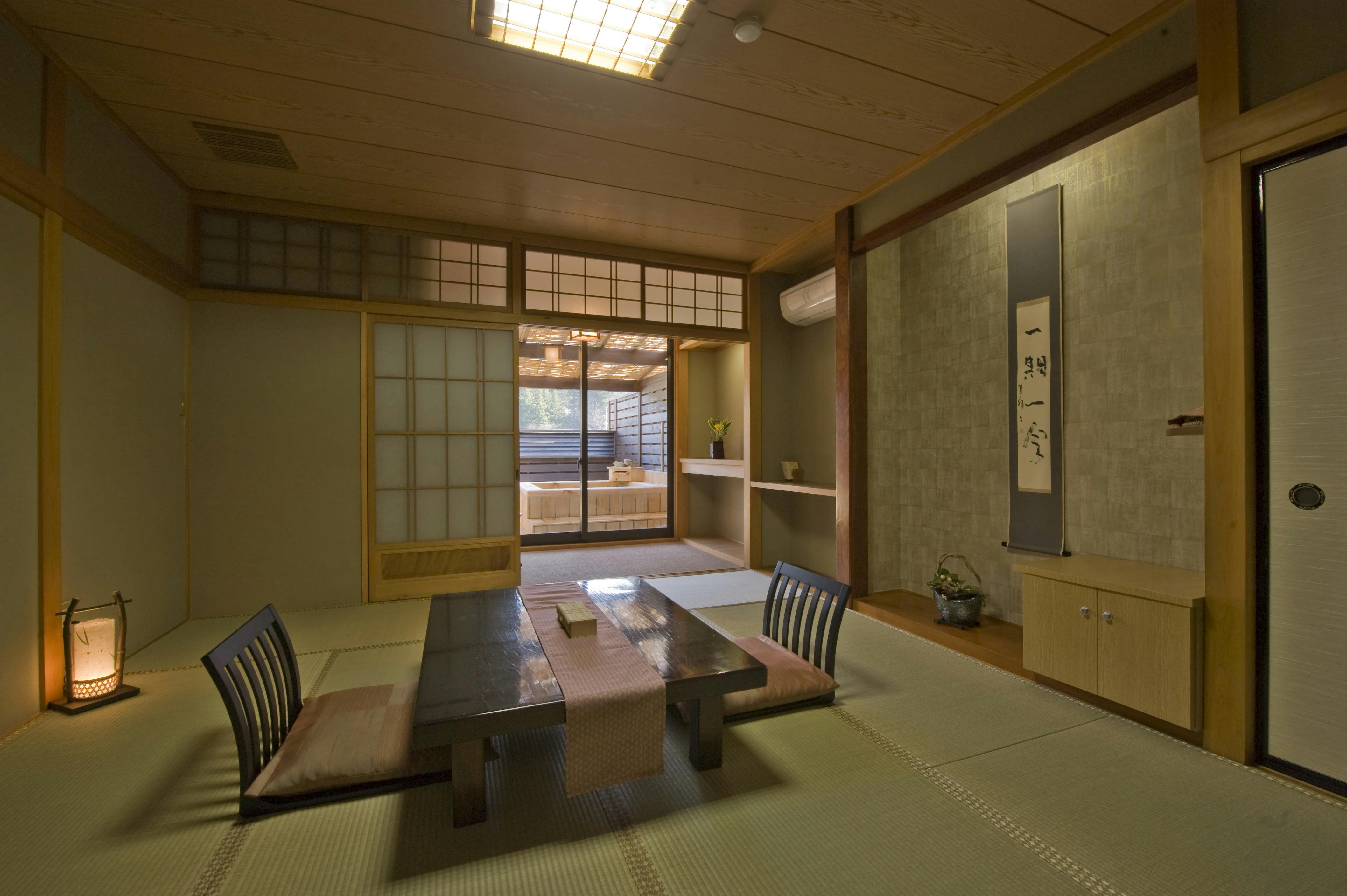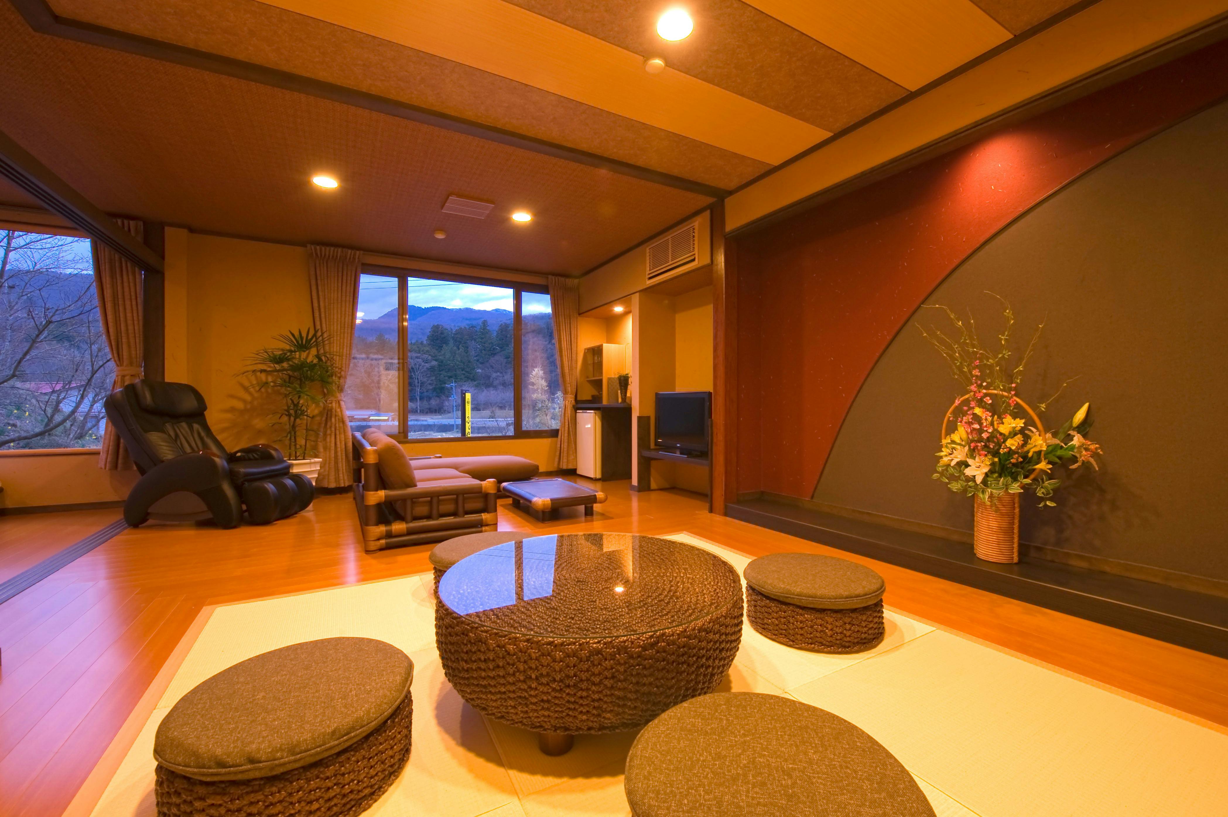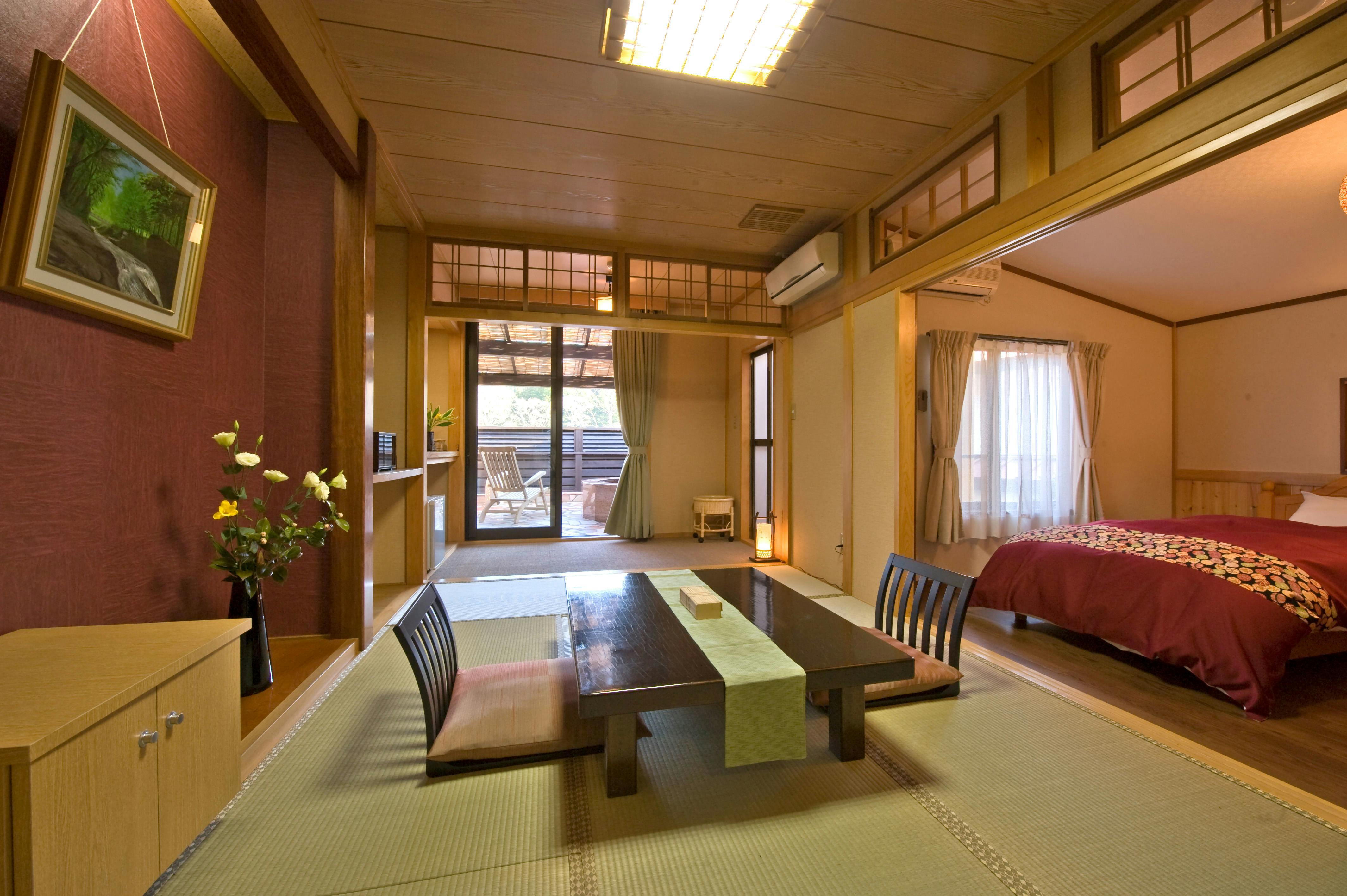 こちらのお部屋は、当館で最高ランク客室になります。夏は涼やかな風を感じ、窓辺には蛍のやわらかなひかりが・・・。冬は暖かなこたつを囲み、都会の雑踏を忘れ大切な人と「ほっ」とするひと時を。お部屋の生花は、女将が心を込めてご用意しております。広々とした和室にベッドルーム、至福のひとときをごゆっくりとお寛ぎ下さい。※無線LANがご利用になれます。※デッキのみ喫煙可能です。
