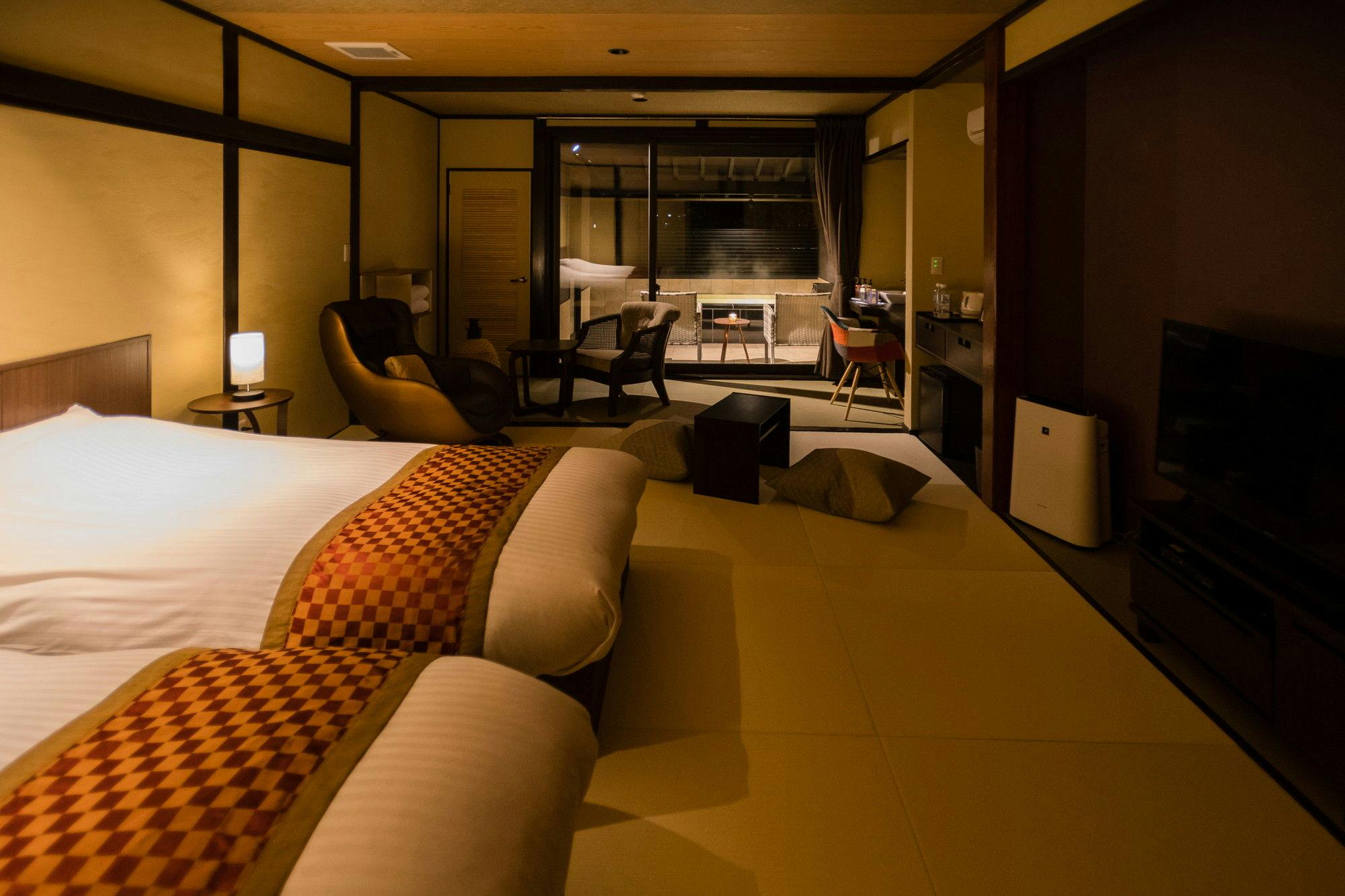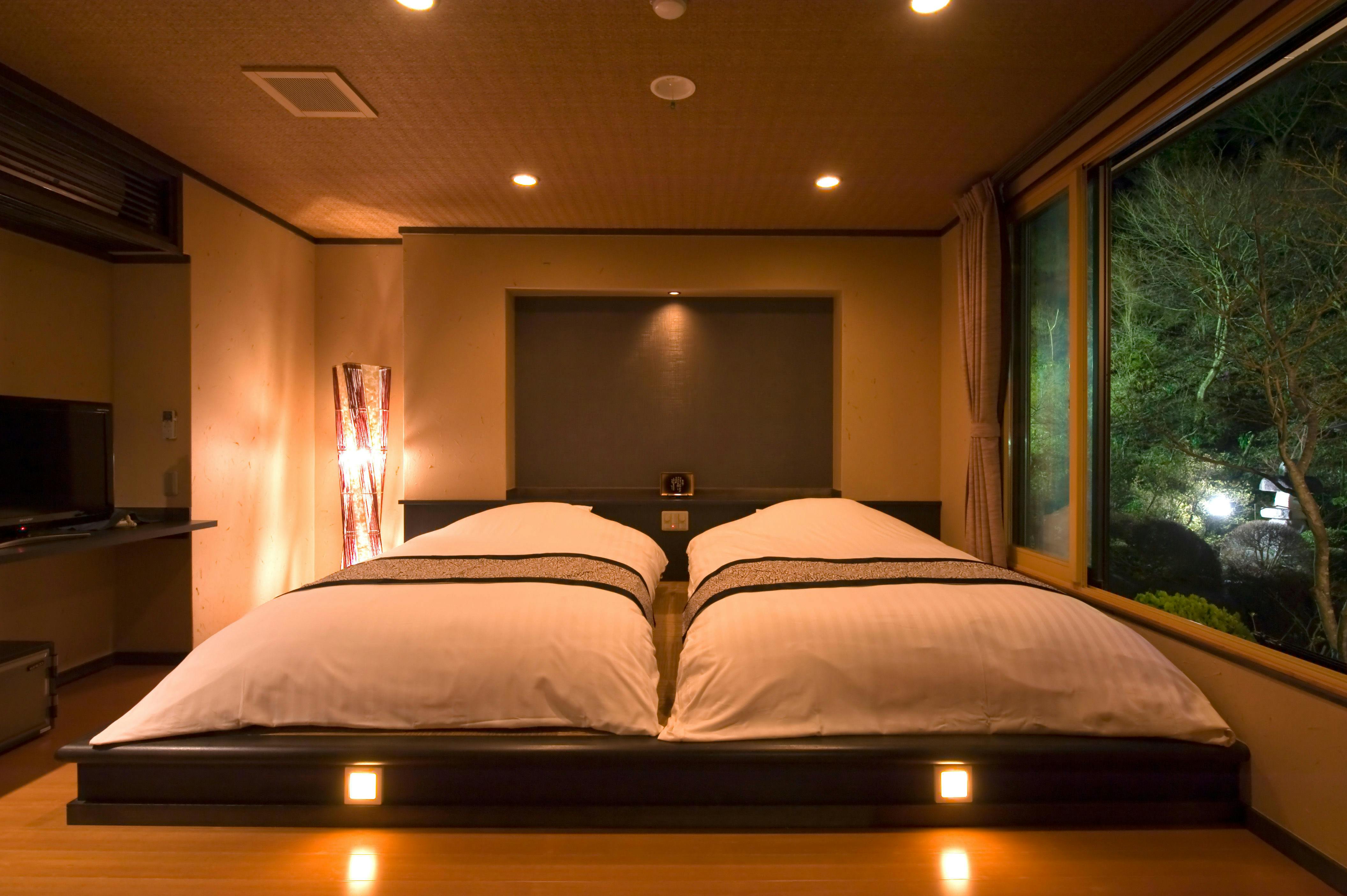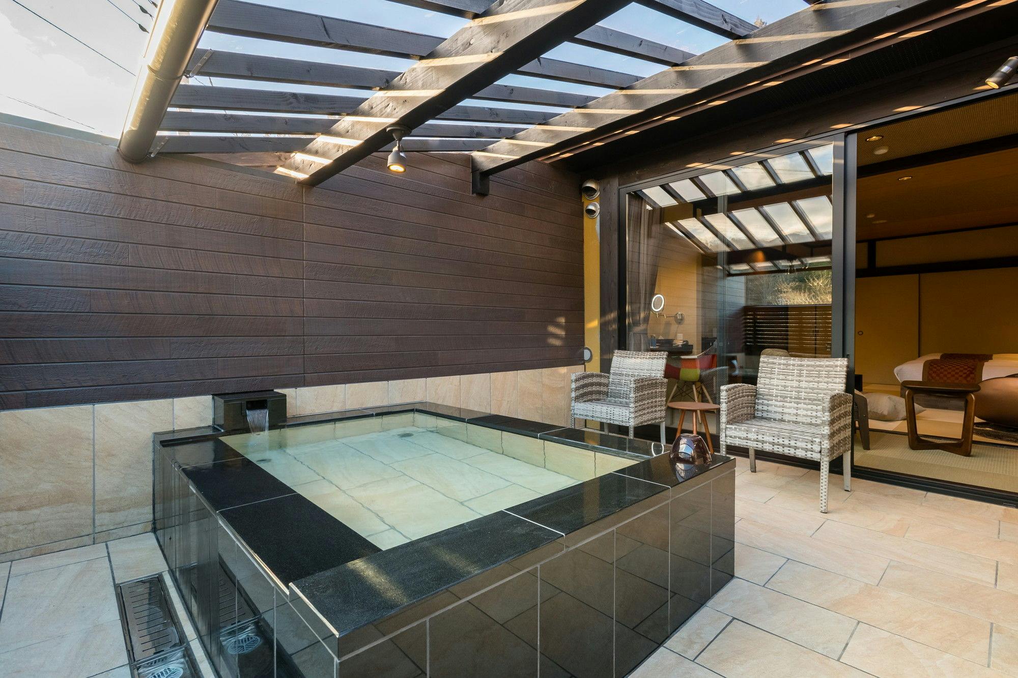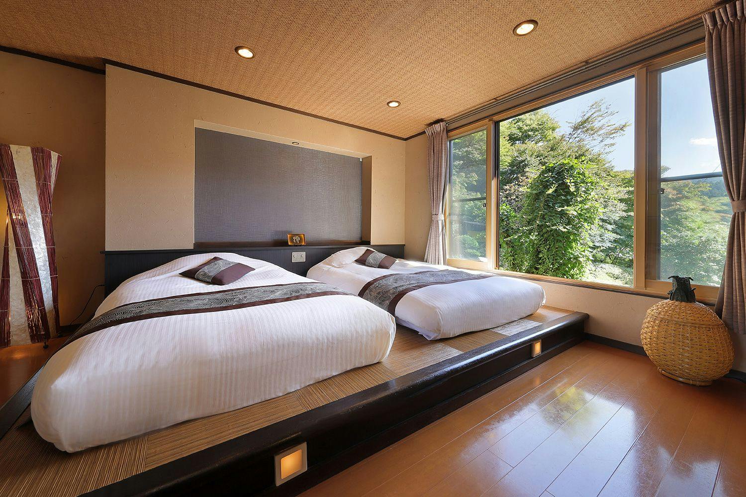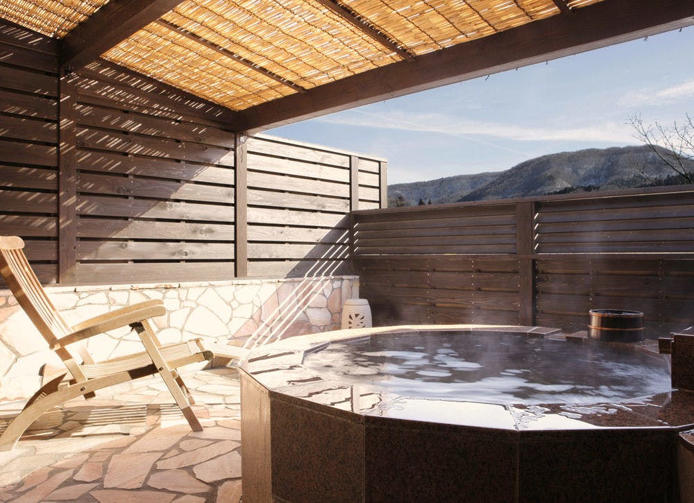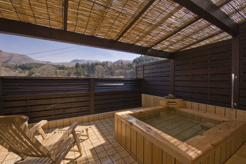 夏は涼やかな風を感じ、窓辺には蛍のやわらかなひかりが・・・。冬は暖かなこたつを囲み、都会の雑踏を忘れ大切な人と「ほっ」とするひと時を。お部屋の生花は、女将が心を込めてご用意しております。角部屋で更にベッドでお休みいただけるスペースをご用意いたしました。広々としたデッキには専用露天風呂もございます。露天風呂付き客室でごゆっくりとお寛ぎ下さい。※無線LANがご利用になれます。※デッキのみ喫煙可能です。