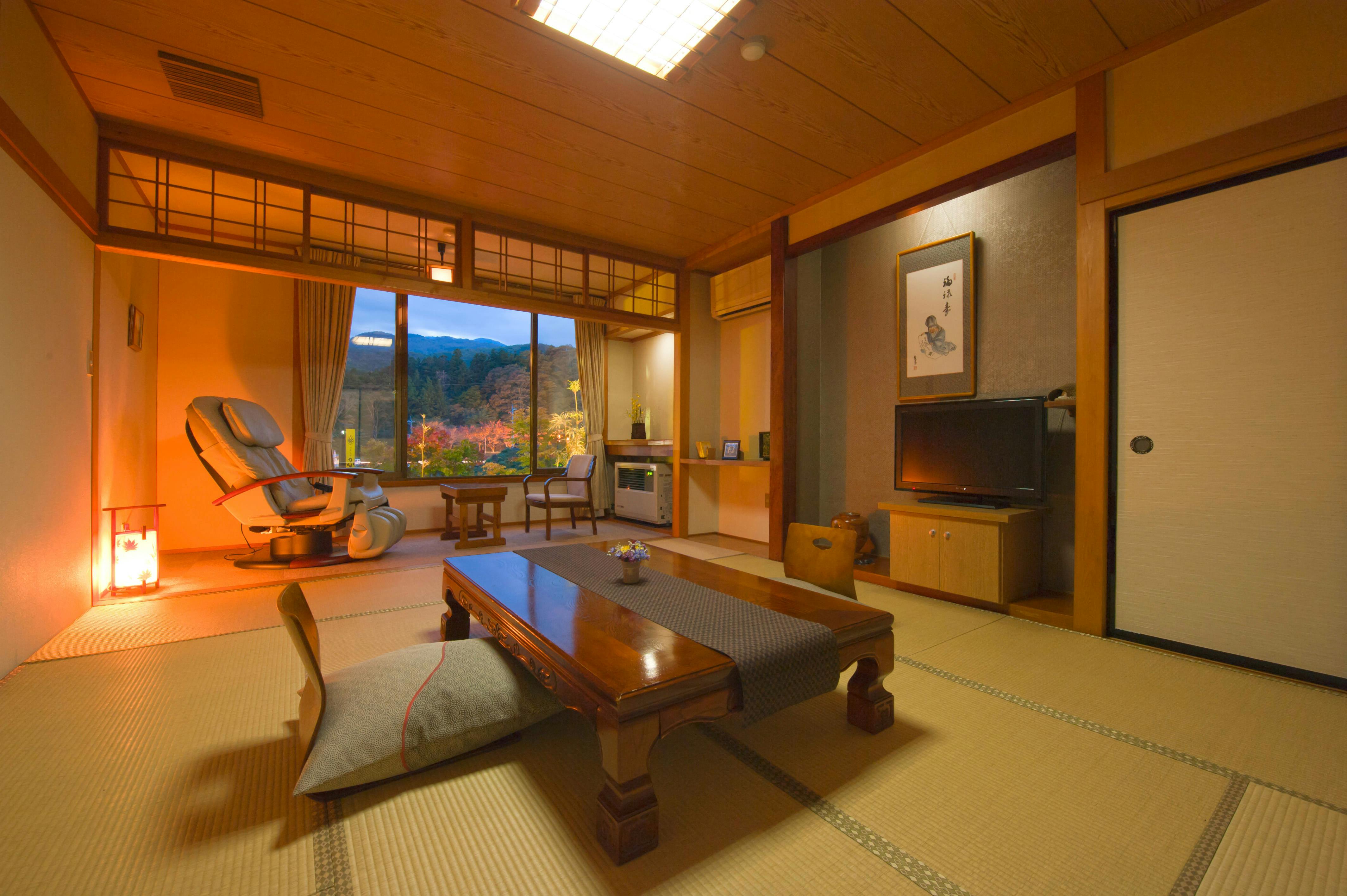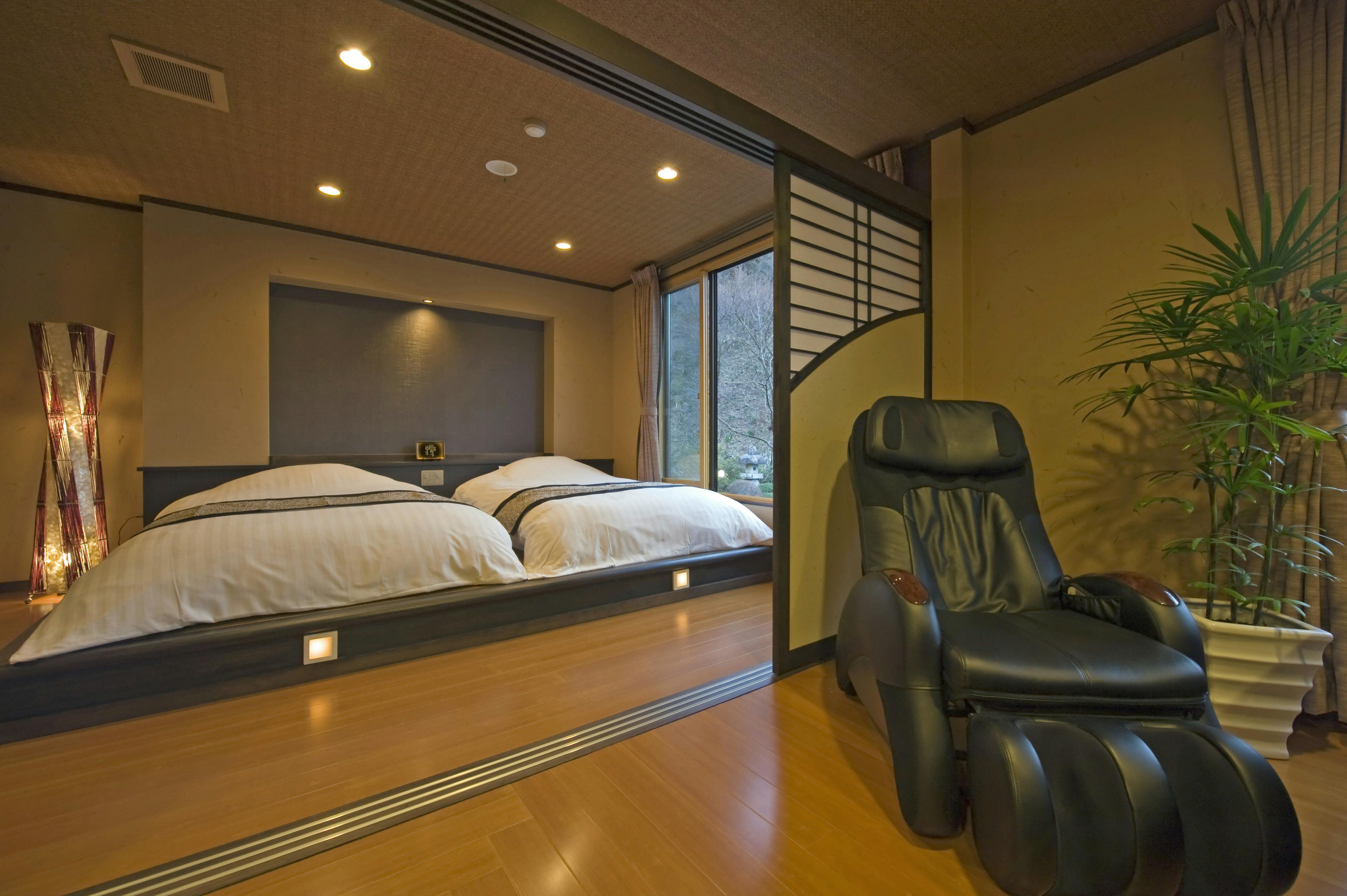 夏は涼やかな風を感じ、窓辺には蛍のやわらかなひかりが・・・。冬は暖かなこたつを囲み、都会の雑踏を忘れ大切な人と「ほっ」とするひと時を。お部屋の生花は、女将が心を込めてご用意しております。2010年リニューアル致しました、モダン和洋室になります。当館で一番広いお部屋です。角部屋でお部屋には無料のマッサージチェアも付いております。ごゆっくりとお寛ぎ下さい。※無線LANがご利用になれます。