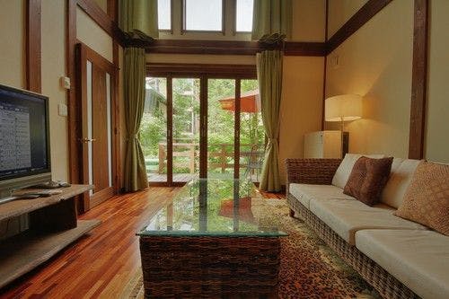 □1階居間30平米+2階寝室30平米+庭園付檜露天風呂+専用テラス付のゴージャスな広さ。