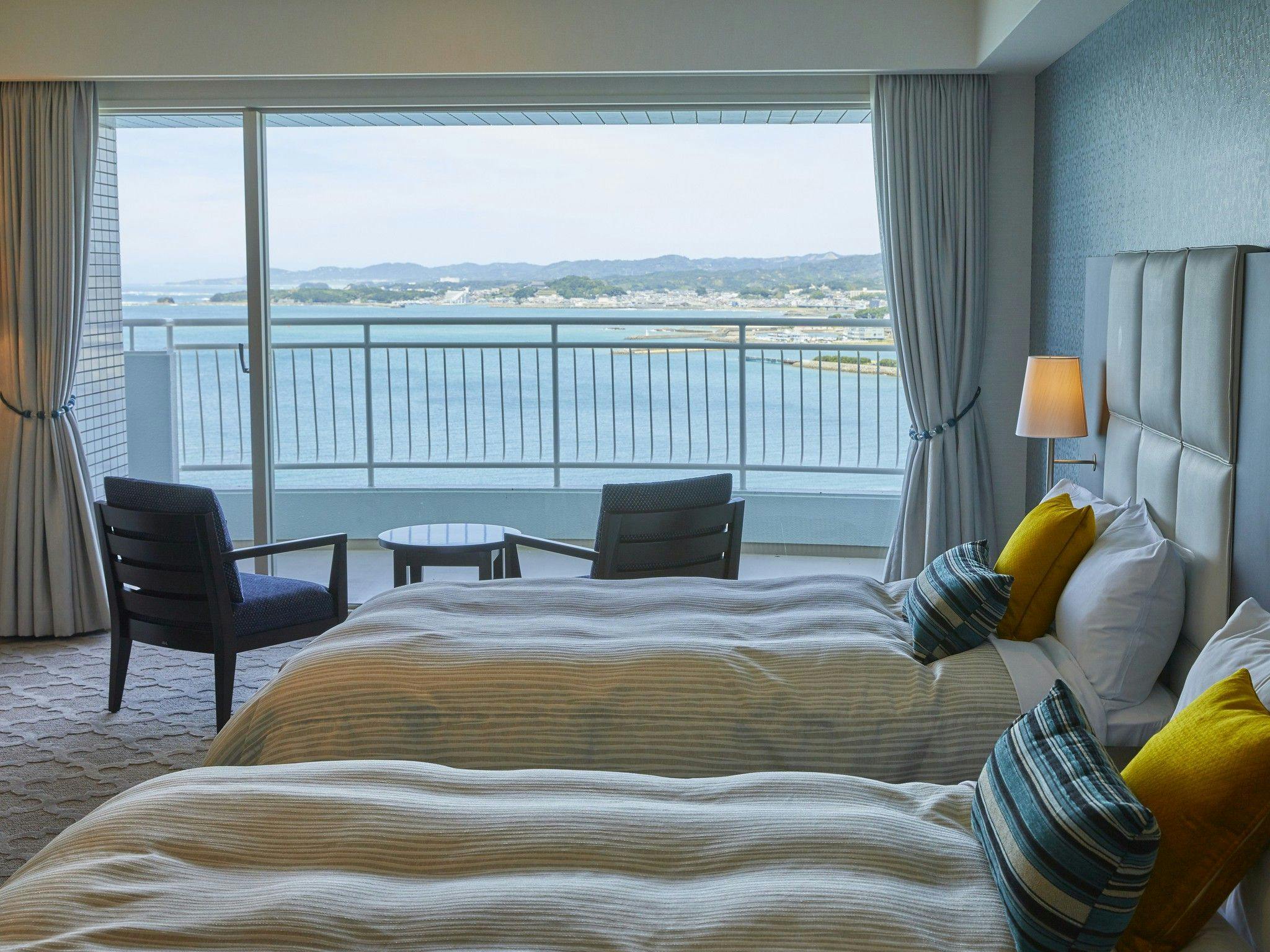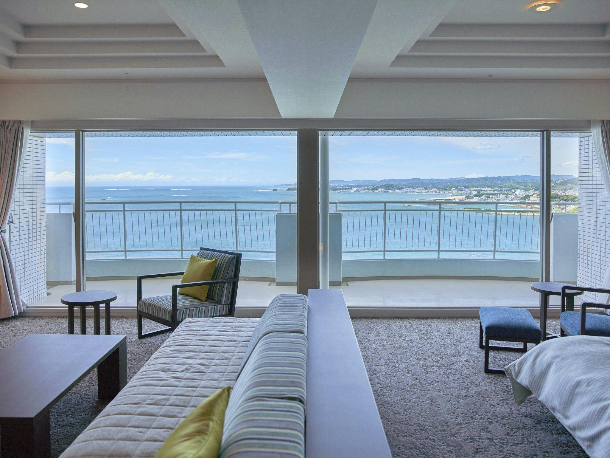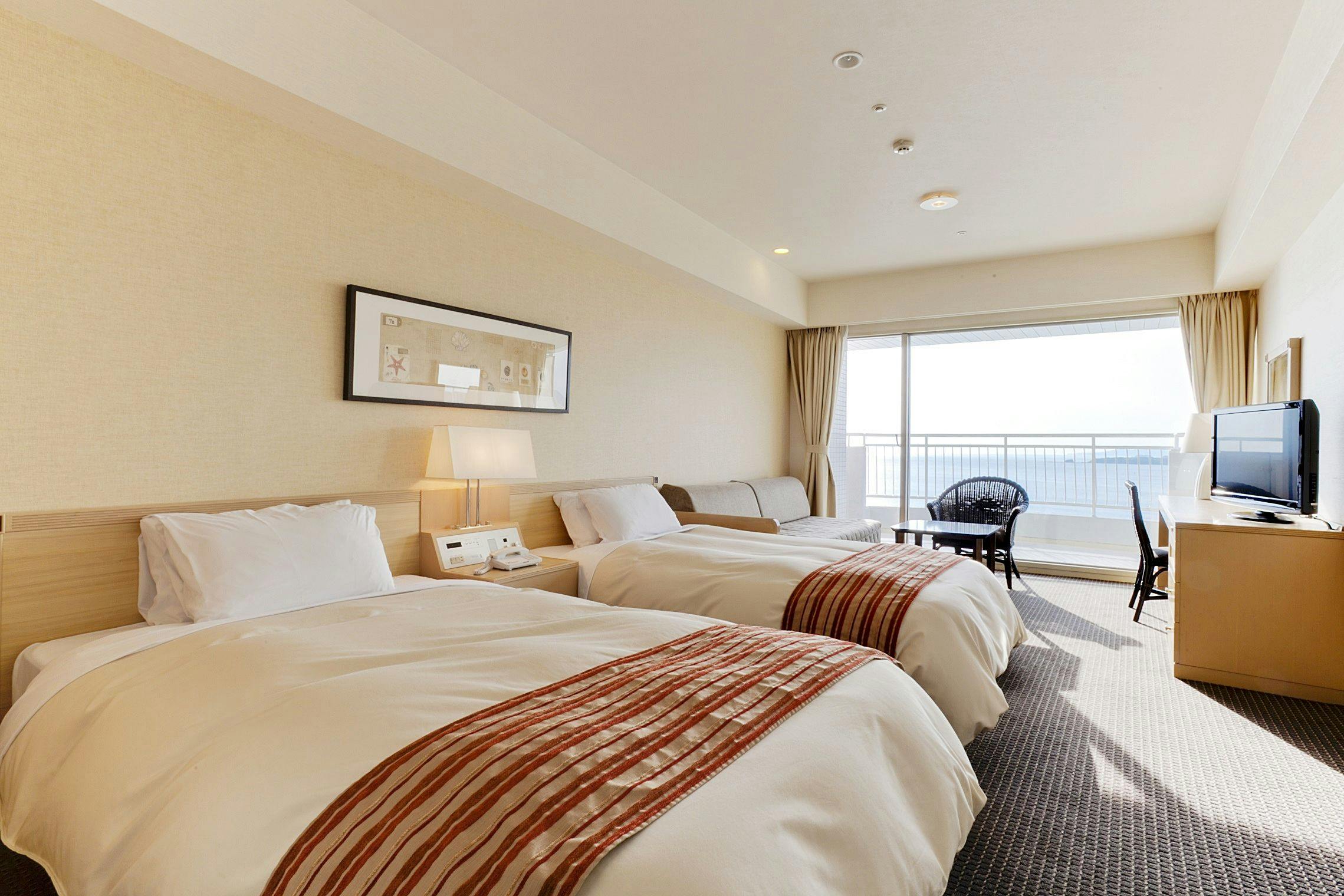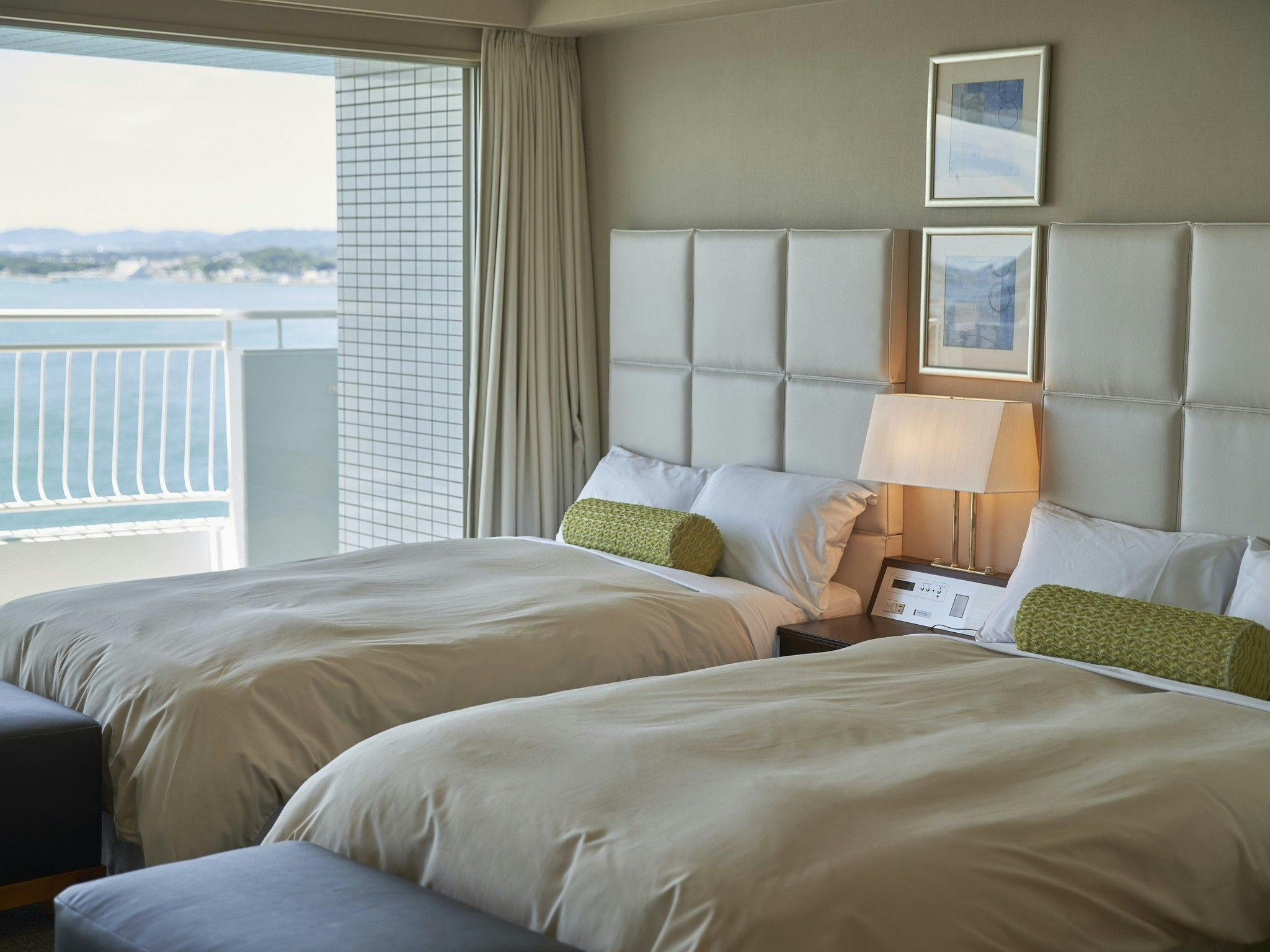 美しい海を独り占め。大切な人と過ごすラグジュアリーなツインルーム。バルコニー付の贅沢なお部屋。4名様まで宿泊可<最上階18階>※3名様以上の場合はエキストラベッドをご用意。バス・トイレ・ベッド幅:120cm×2台。広さ:75平米・無線LAN完備