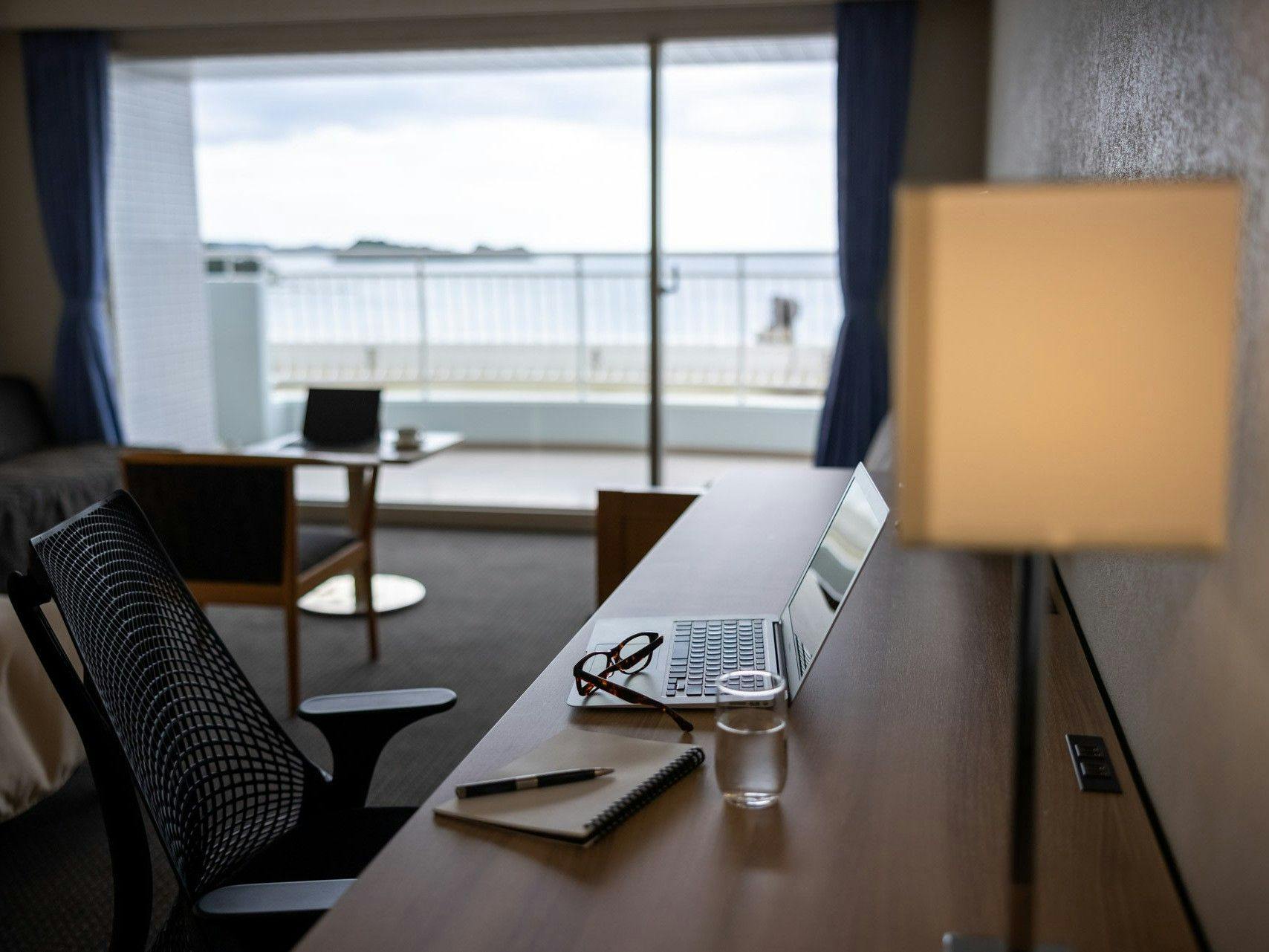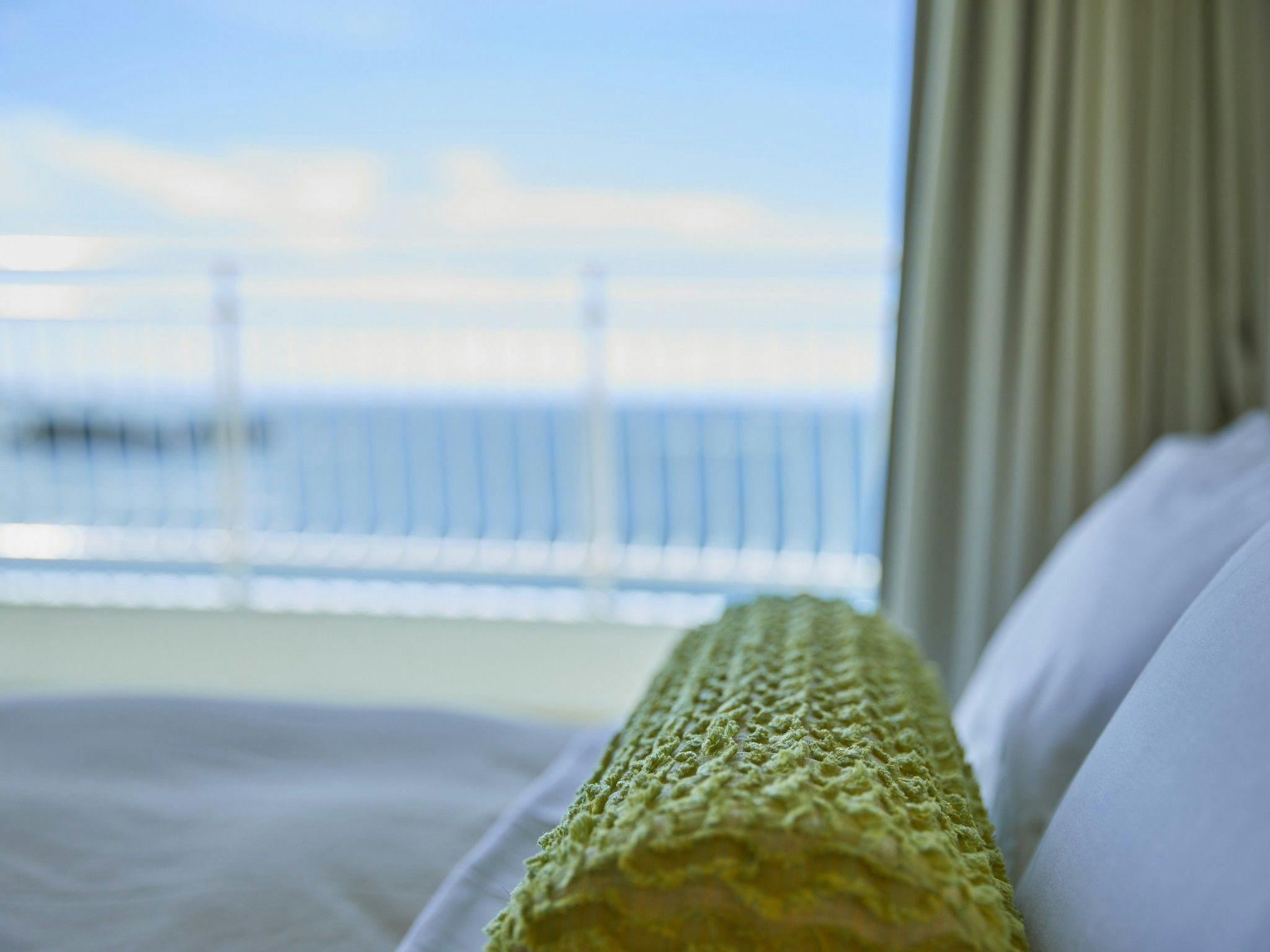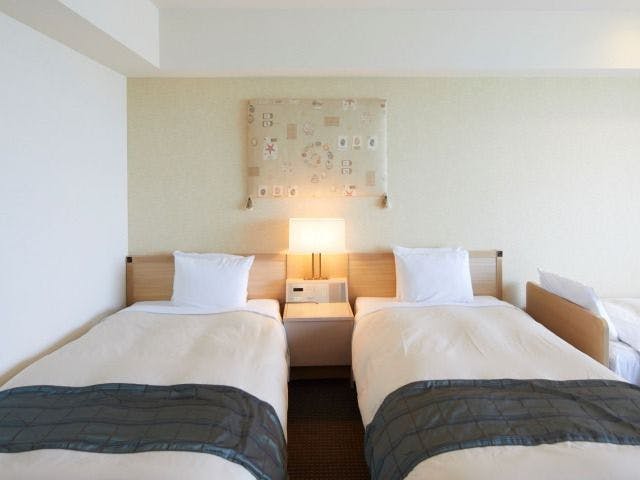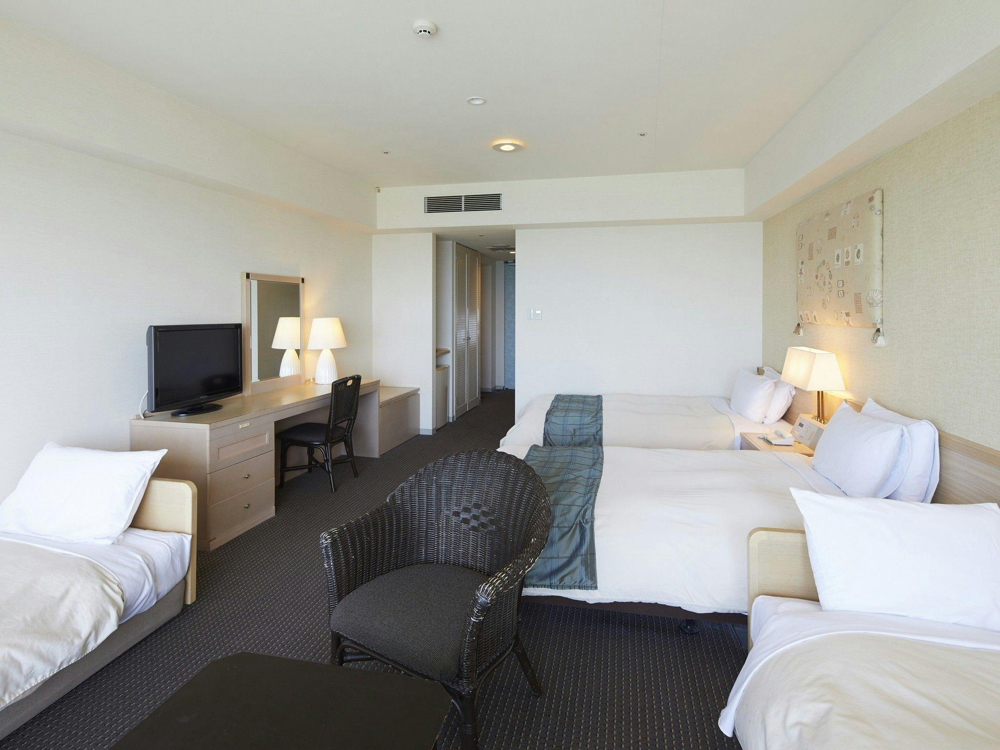 美しい海を独り占め。大切な人と過ごすラグジュアリーなツインルーム。バルコニー付の贅沢なお部屋。4名様まで宿泊可<最上階18階>※3名様以上の場合はエキストラベッドをご用意。バス・トイレ・ベッド幅:120cm×2台。広さ:75平米・無線LAN完備