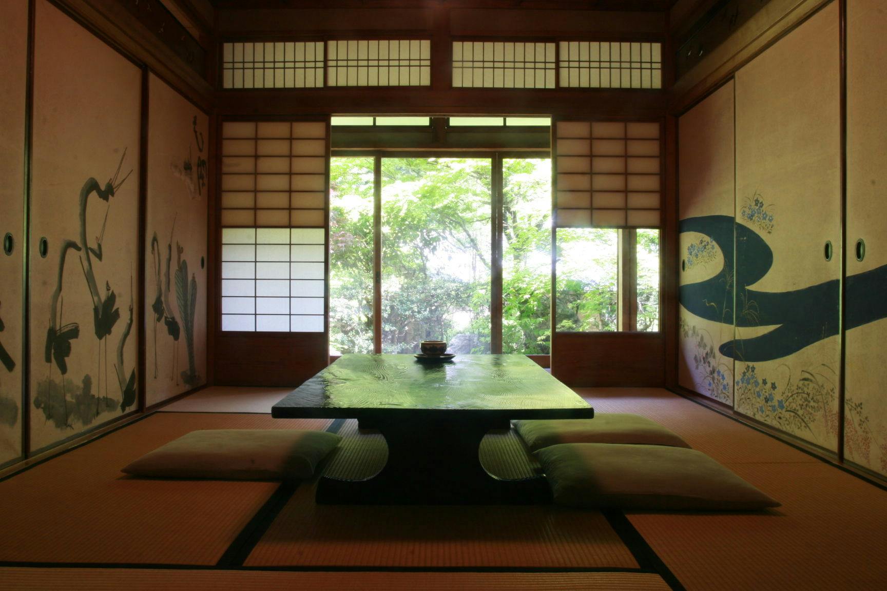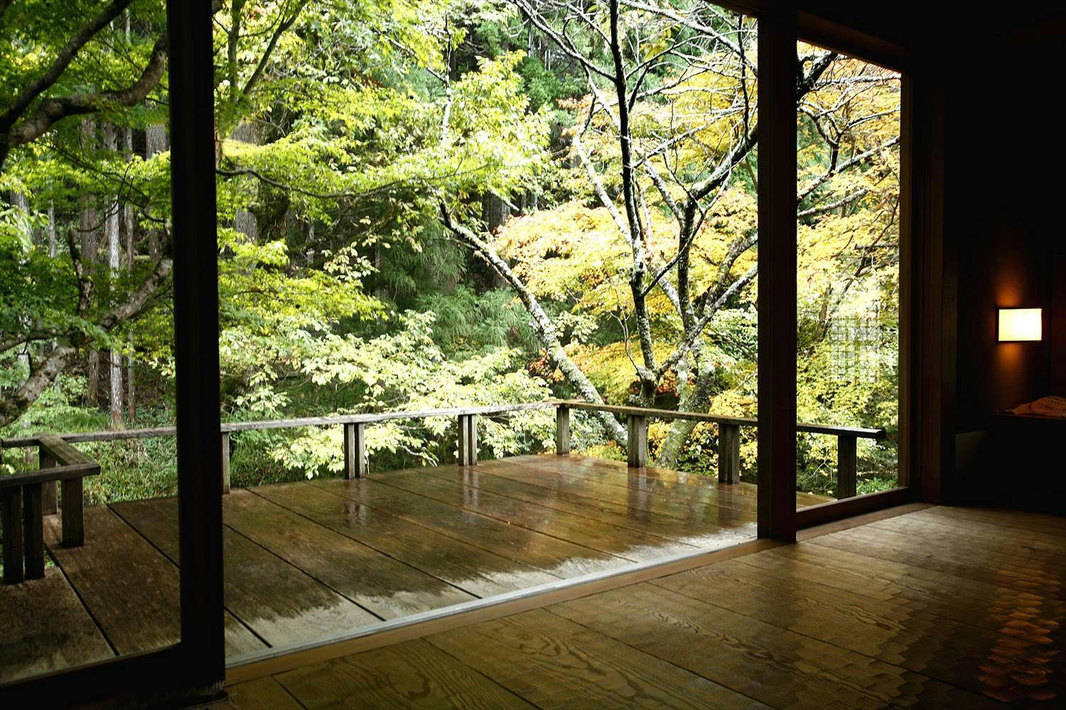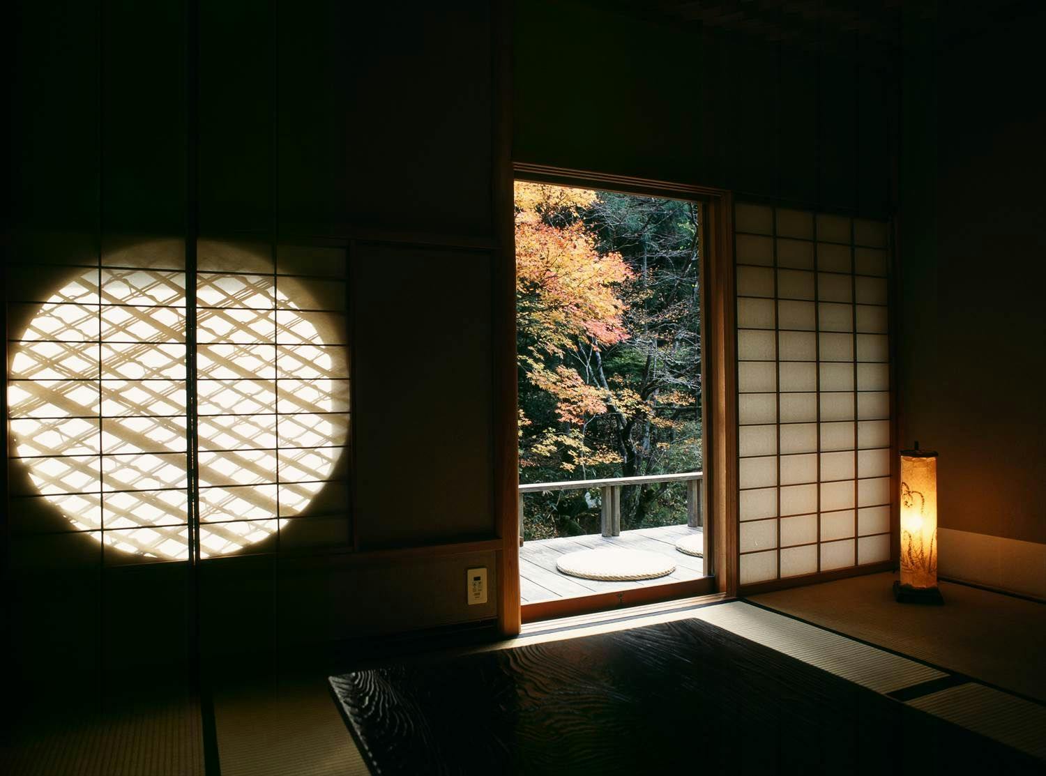 離れの一番奥の部屋で、桂離宮写しの下地窓、名栗の縁、大きく開かれた一枚張りのガラス窓が視界と心を外へ誘う。※お部屋にはお風呂がございませんので、貸切風呂をご利用下さい。