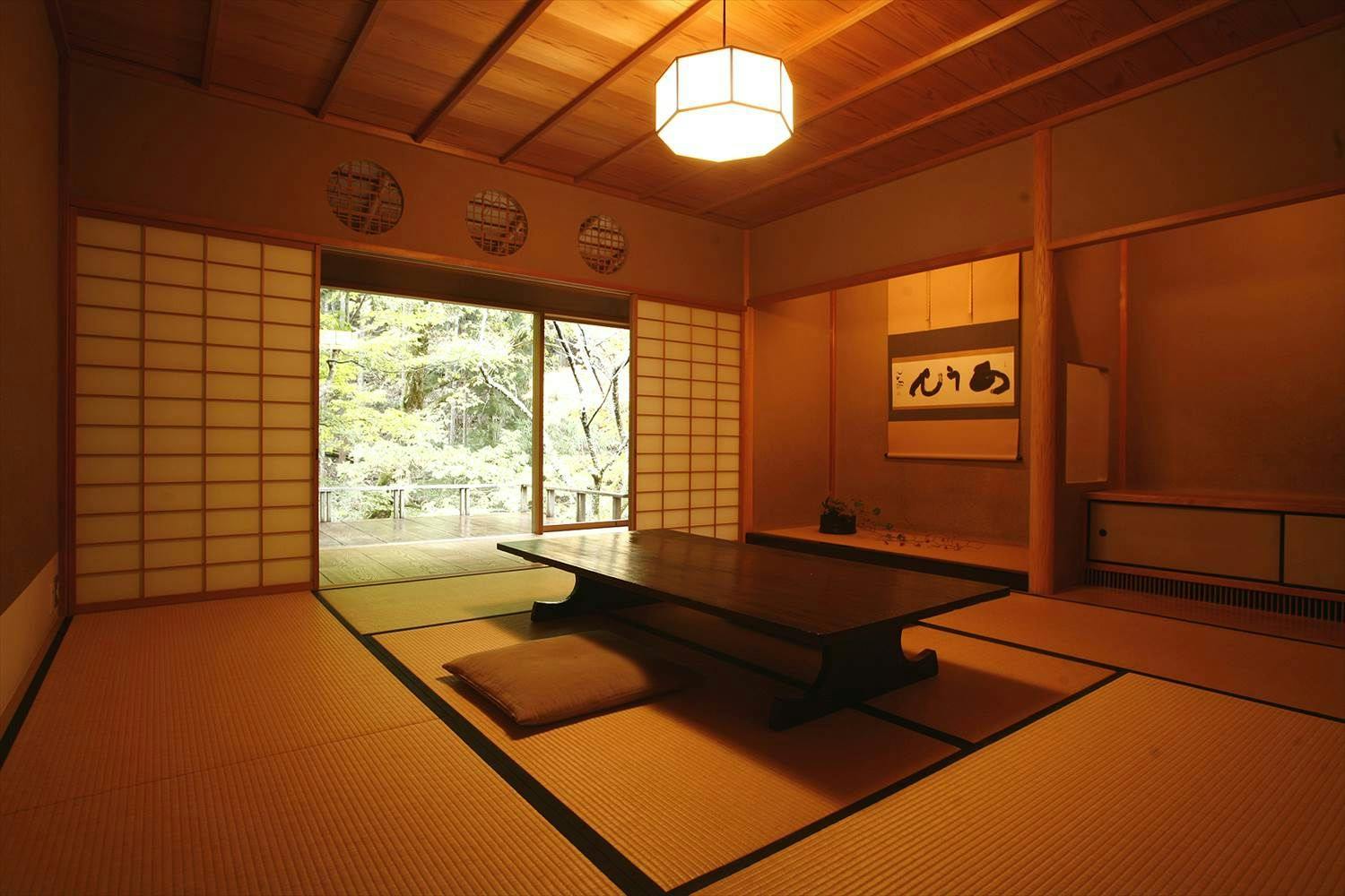 網代仕立ての天井、吉野窓から見える清流と木々という草庵風に仕立てた小じんまりとしたこの部屋は、何ともいえない居心地を人に感じさせてくれる。※お部屋にはお風呂がございませんので、貸切風呂をご利用下さい。