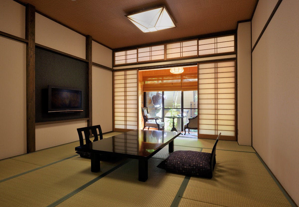 鹿児島がテーマの風土や工芸・文化を感じられる一番人気のお部屋。入り口からお部屋に続く廊下はライトアップされた竹林の中を歩いている感覚です。大島紬、蒲生和紙、宮之城の竹、竜門司焼など部屋の随所に鹿児島特産の材料を使用した、開放感のある和モダンスタイル。書斎風の縁側で川のせせらぎを聞きながらゆっくりとした時間を楽しめます。