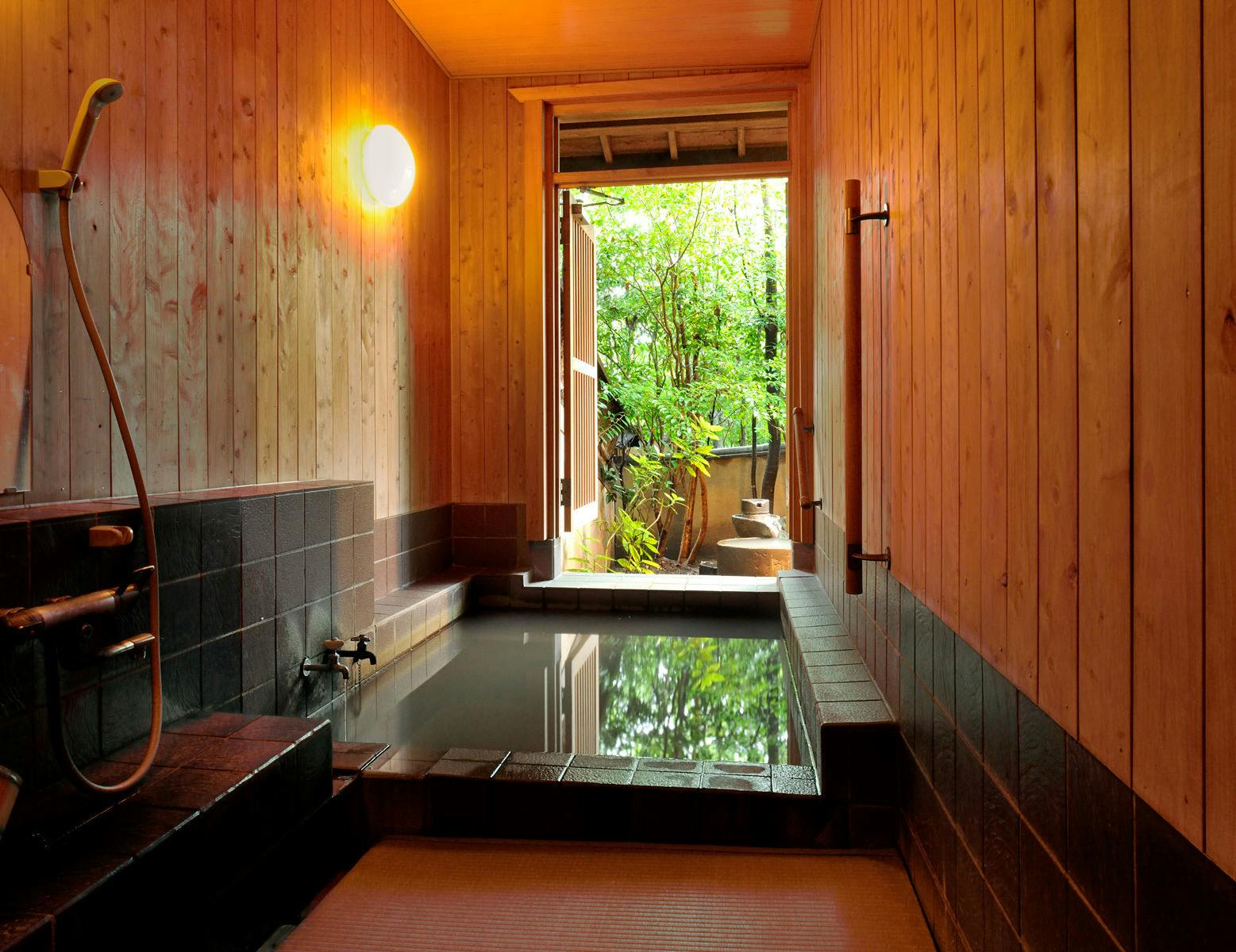 個室の様なフローリングの2人掛けソファーと丸テーブルから庭を眺めつつ、お好みのスタイルで寛ぎのひとときをお過ごしください。露天風呂は昔懐かしい五右衛門風呂風。
