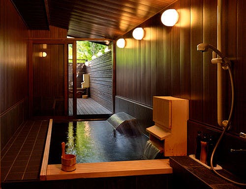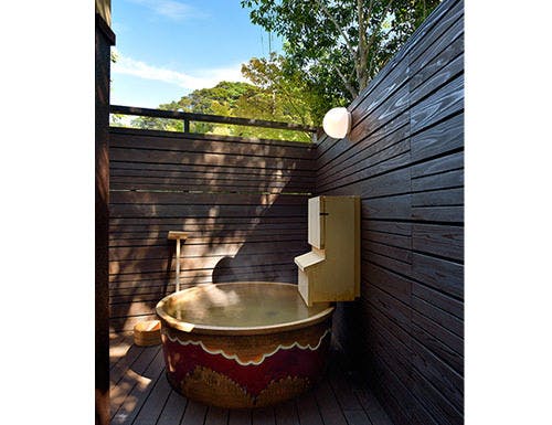 露天風呂はケヤキの木をそのまま湯船にし、節穴から差し込む光や風を感じられ胎内に抱かれた様な感覚です。庭を望む縁側にあるクラシカルな椅子とテーブルでゆっくりとお過ごしください。