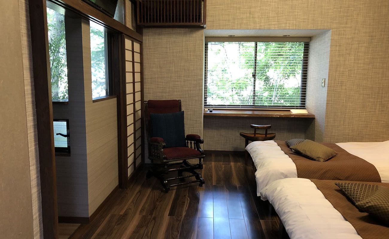 【芹(せり)のお部屋】露天風呂はゆったりつかれるサイズの陶器風呂は、川のせせらぎを聴きながら自然を感じられる空間です。部屋の随所に大島紬を使用し大人スタイルで落ち着いた空間にしました。洋室にはロッキングチェアを置いており、読書やゆったりと過ごす贅沢な時間をお愉しみ頂けます。窓辺の出窓コーナーでは景色を楽しみつつ香り高い珈琲でもどうぞ。※2020年にベッドルームにトイレを増設しお部屋に2つトイレのあるタイプ