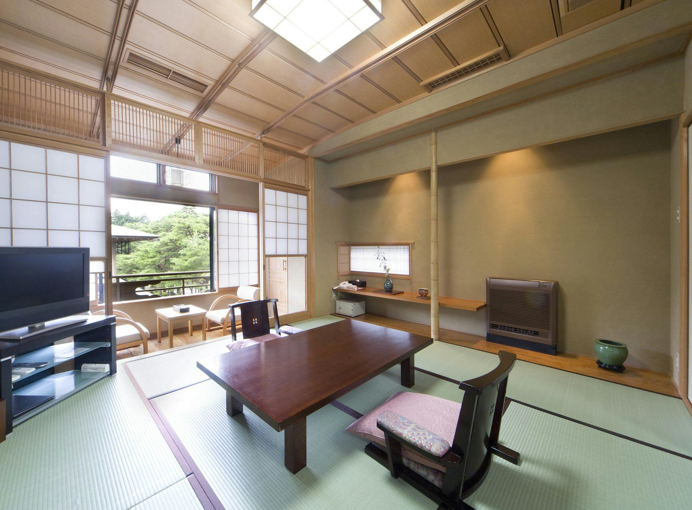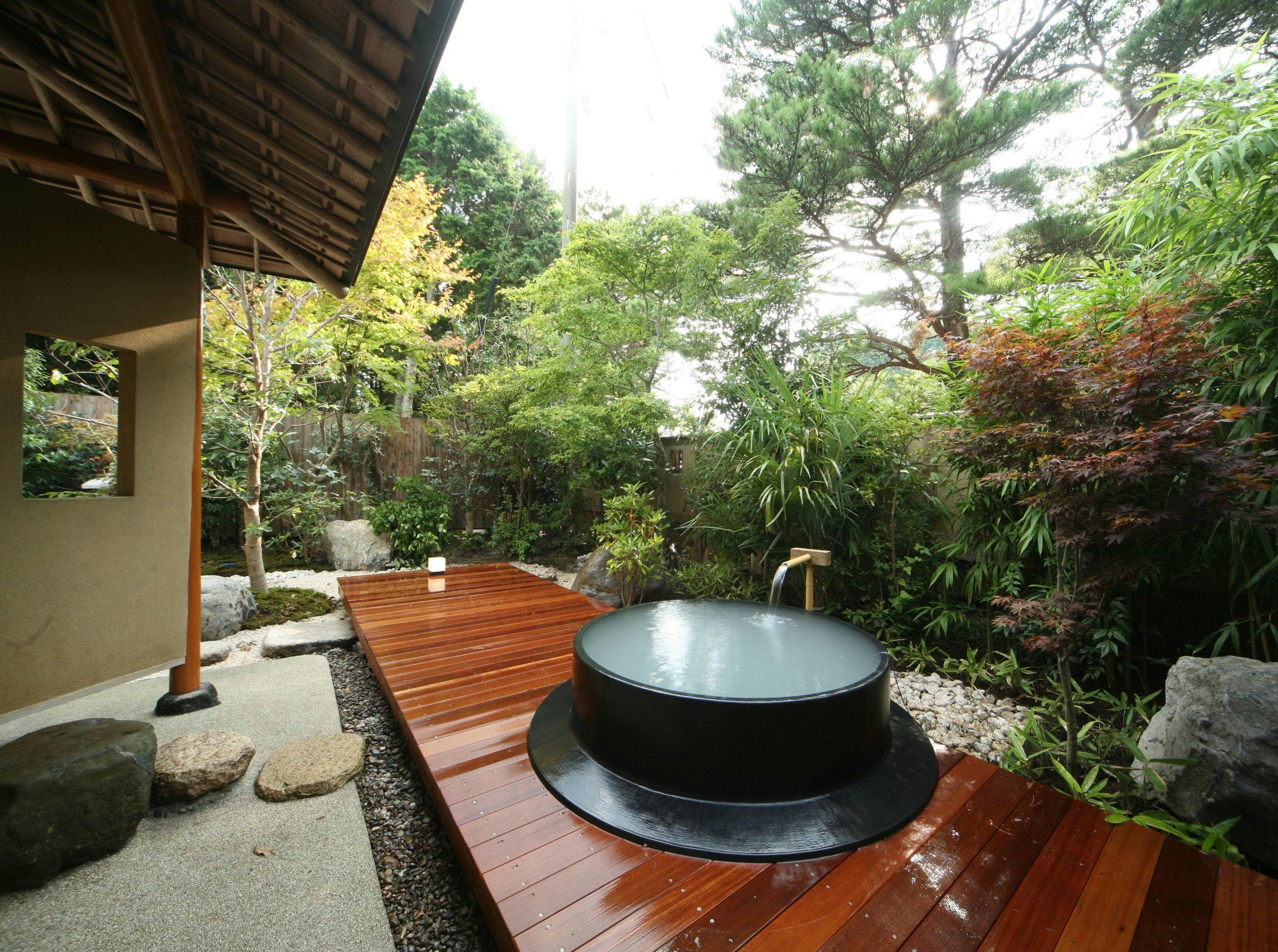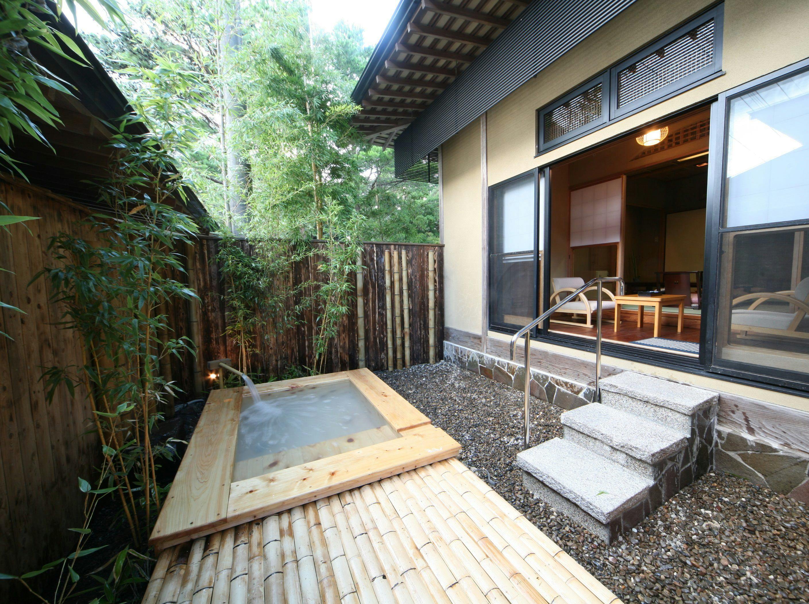 居間の正面に”深緑の湯”の名の通り、木々に囲まれた露天風呂が望める、贅沢なお部屋です。