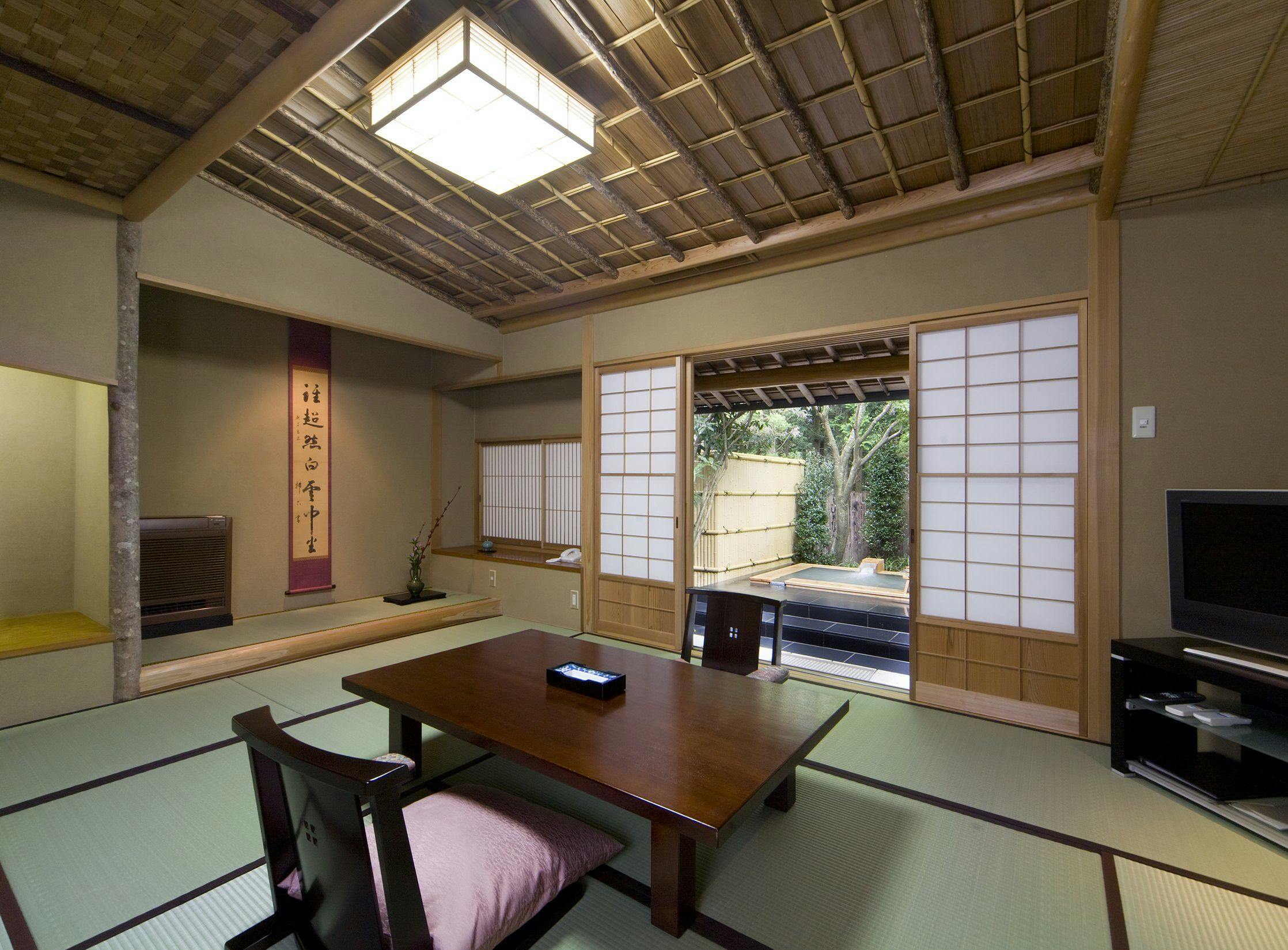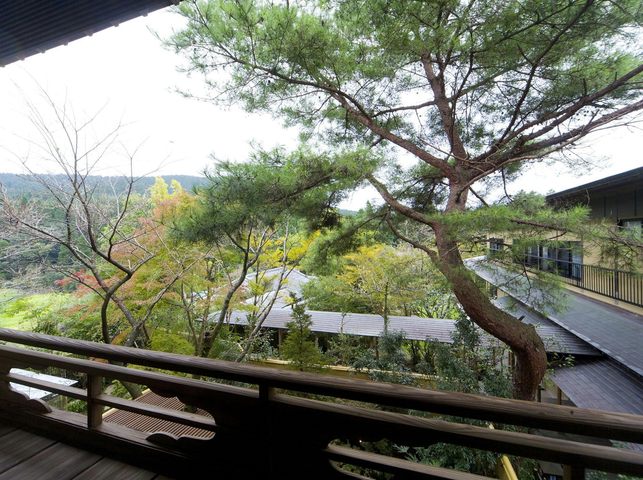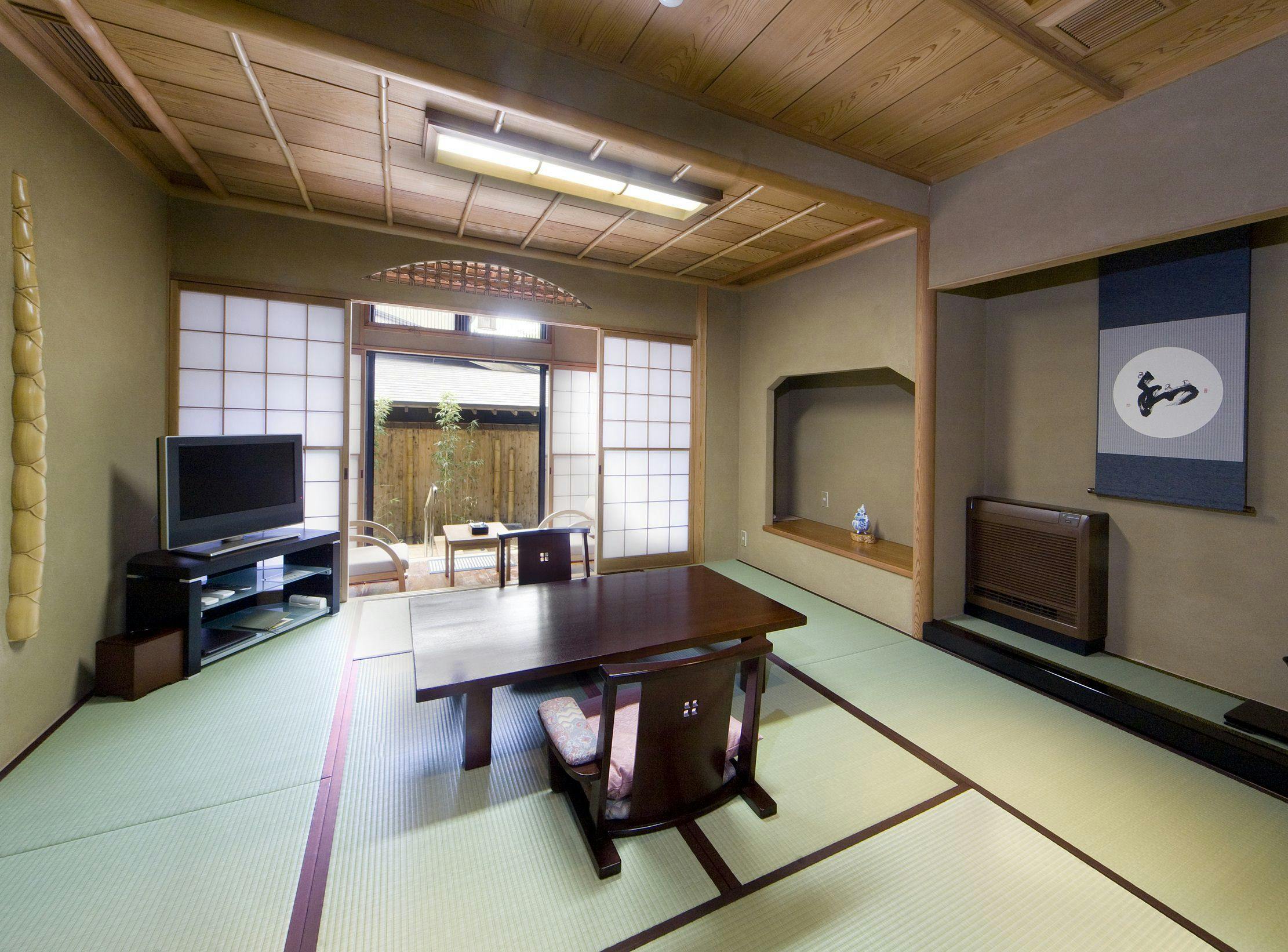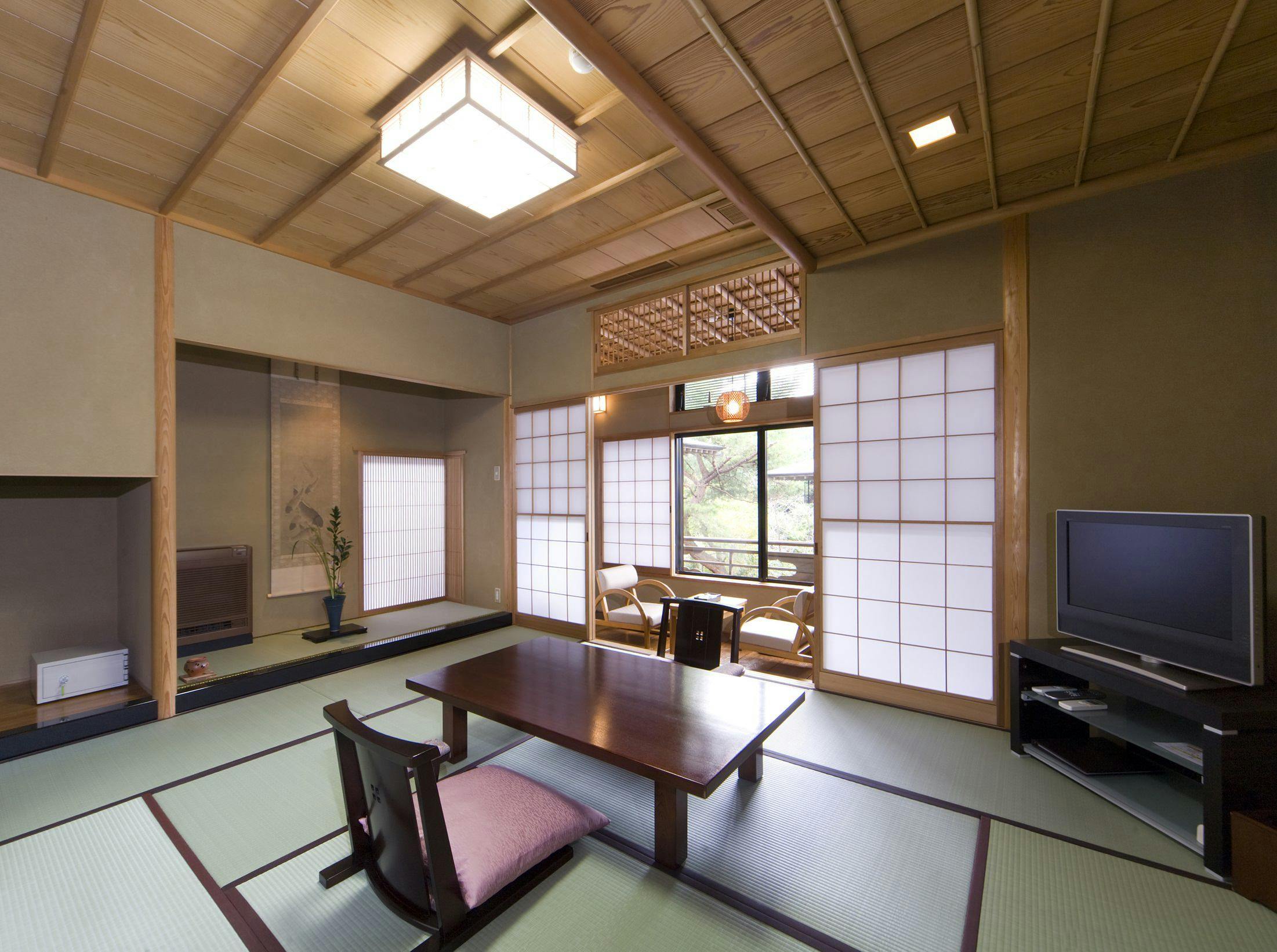 居間の正面に”深緑の湯”の名の通り、木々に囲まれた露天風呂が望める、贅沢なお部屋です。