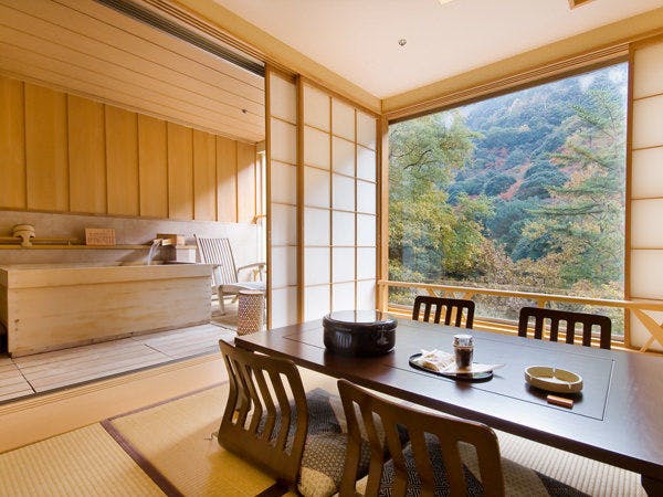 杉立山と石手川を望む渓谷側の特別客室には、奥道後温泉を引き湯したかけ流しの露天風呂が設備されています。静かなプライベート空間にて、滞在中いつでもお好きな時にご入浴いただけます。■1階渓谷側の特別客室【客室設備】・露天風呂(檜風呂)・液晶テレビ・冷蔵庫(空)・金庫・ウォシュレット付トイレ・マッサージチェア・色浴衣