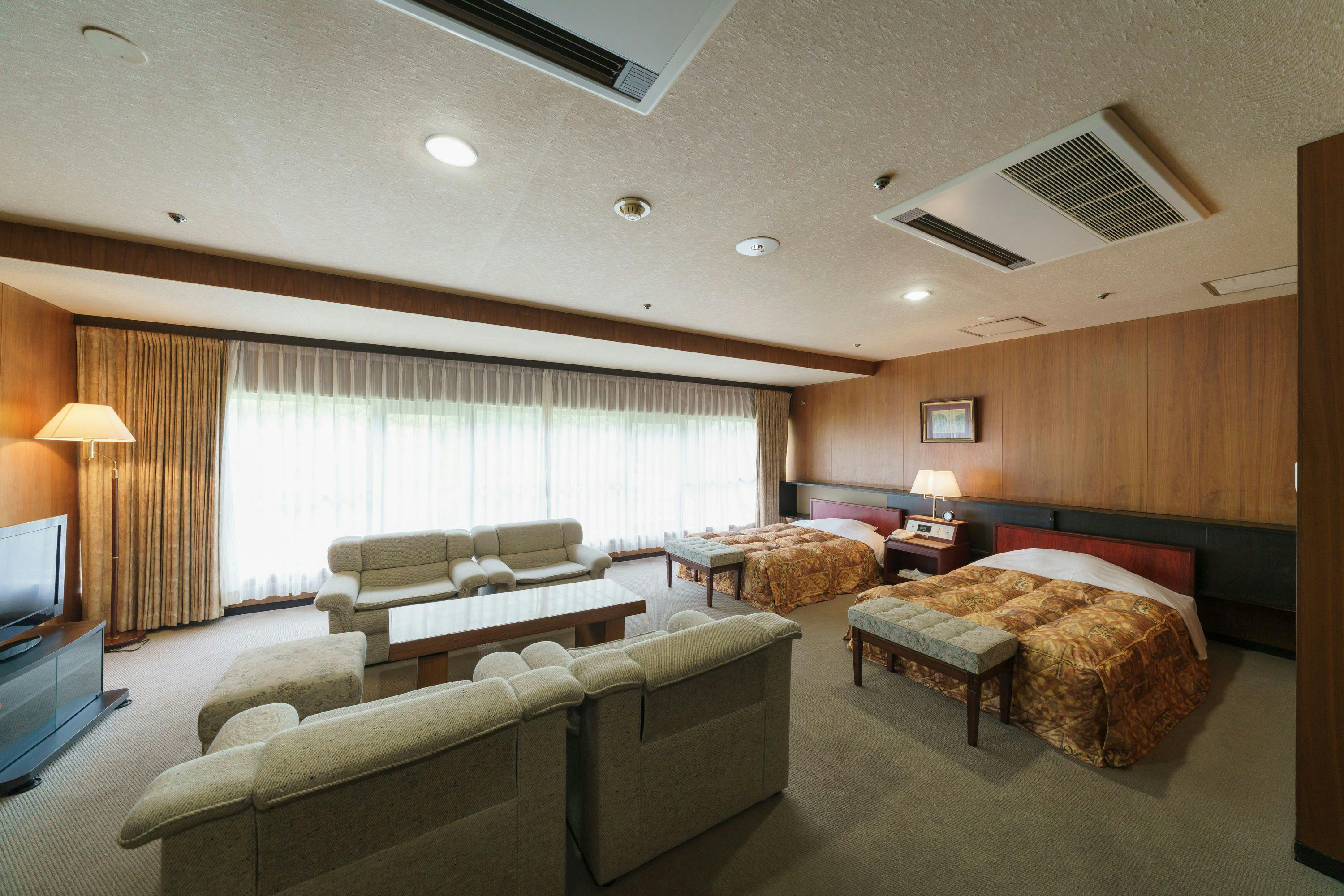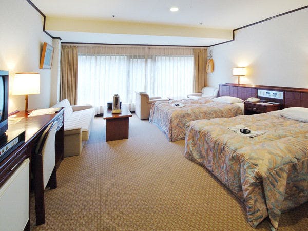 杉立山や石手川を望む、広々とした洋室をご準備いたします。温泉は大浴場をご利用いただけます。【客室設備】・液晶テレビ・冷蔵庫(空)・ウォシュレット付トイレ