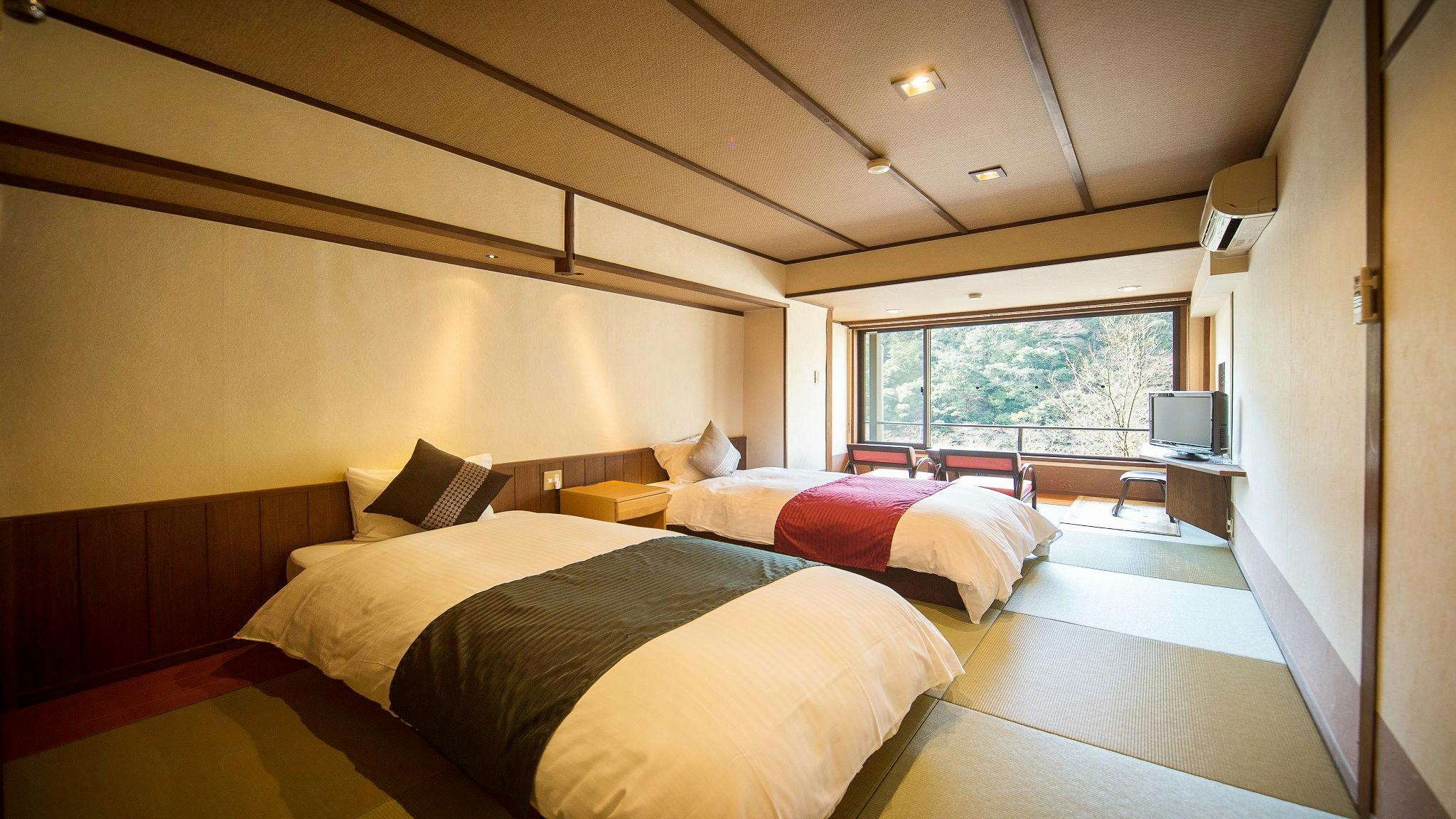 和室10畳にツインベッドの和ベッドタイプのお部屋(渓谷側)四季折々、季節の移ろいをお部屋からもお楽しみ頂けます。