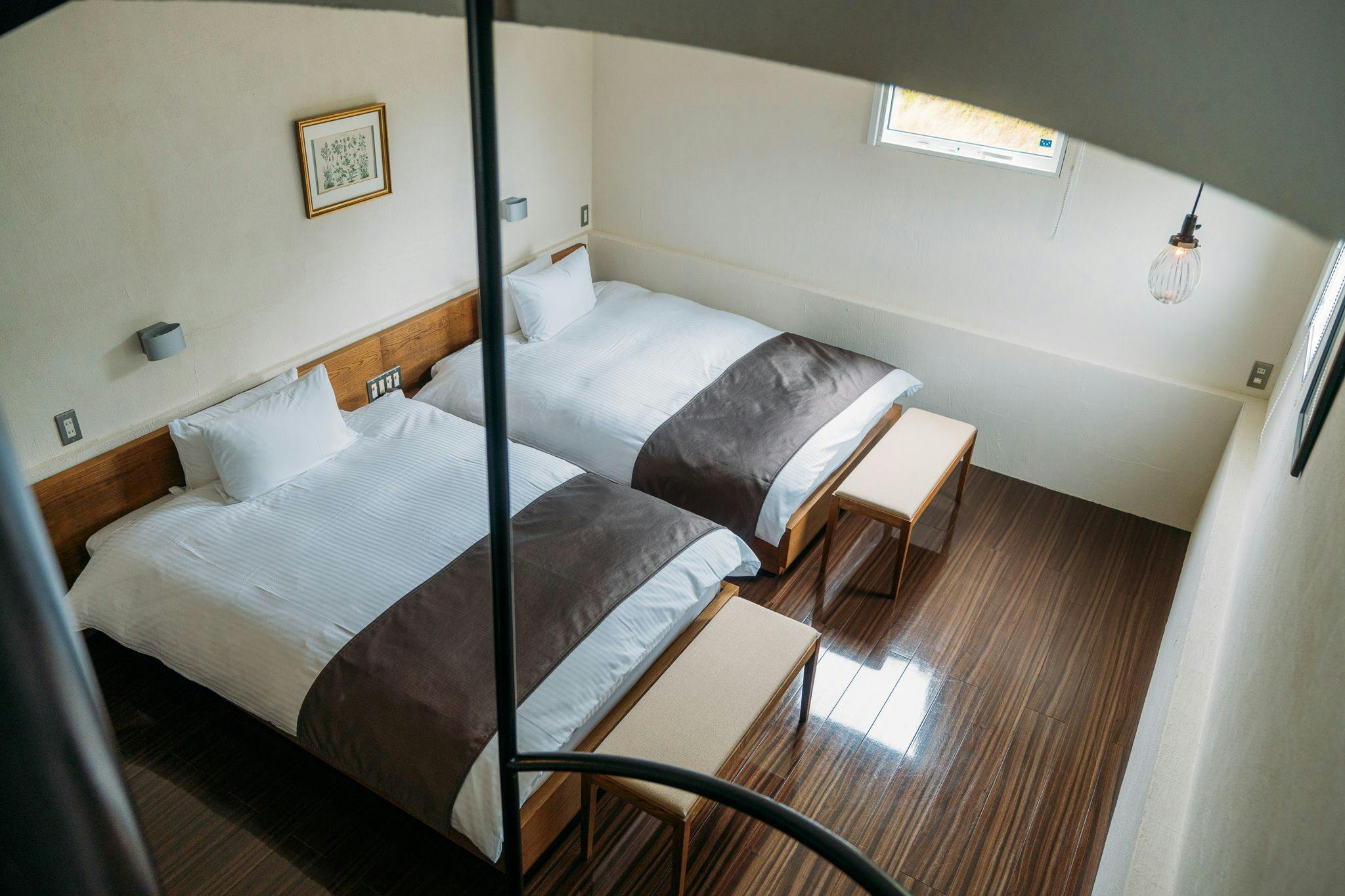 また、こちらのお部屋は、2階から入室頂き、客室内の螺旋階段より1階のお手洗い・浴室へ移動頂きますので、ご滞在中は螺旋階段の上り下りが必要となります。