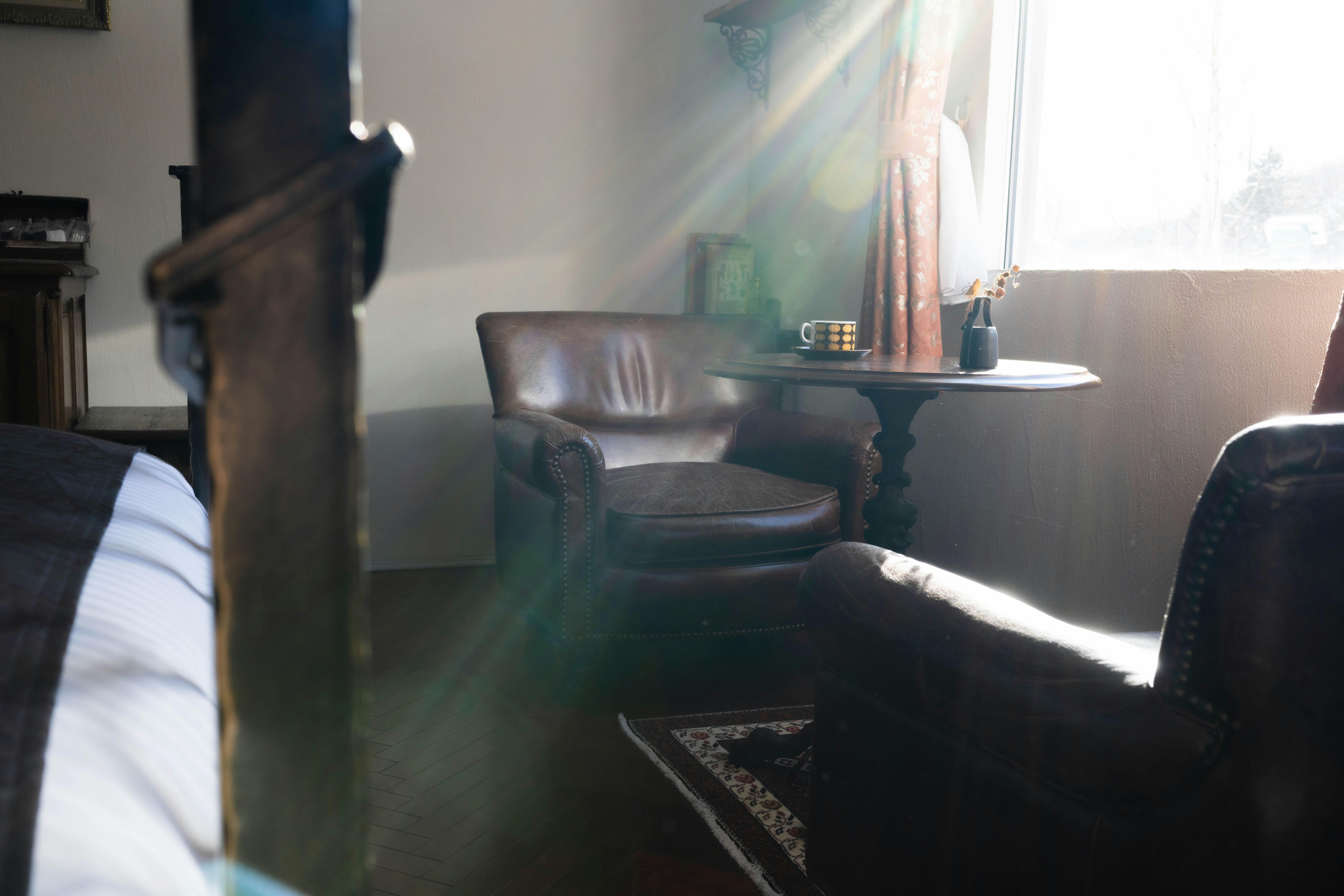 革張りソファに座ってゆったり寛いで頂きたい部屋です。