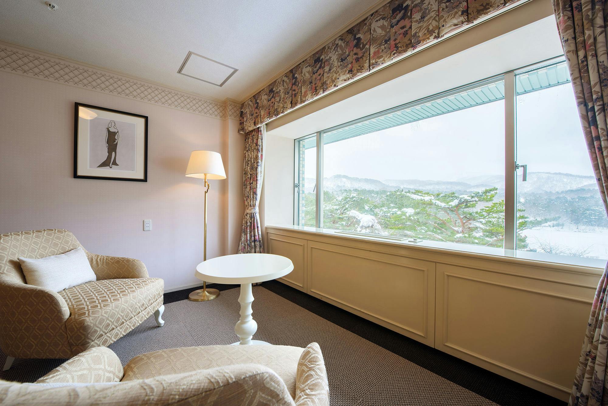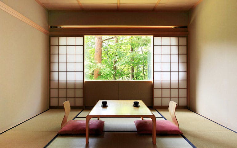 ファミリーに最適な12畳の和室です。窓越しに見える裏磐梯の四季に癒されながら、足を伸ばしてごゆるりとお寛ぎください。ファミリーやグループ一部屋で滞在をご希望の場合に最適なお部屋です。※通常利用1~4名様(5名様まで利用可)