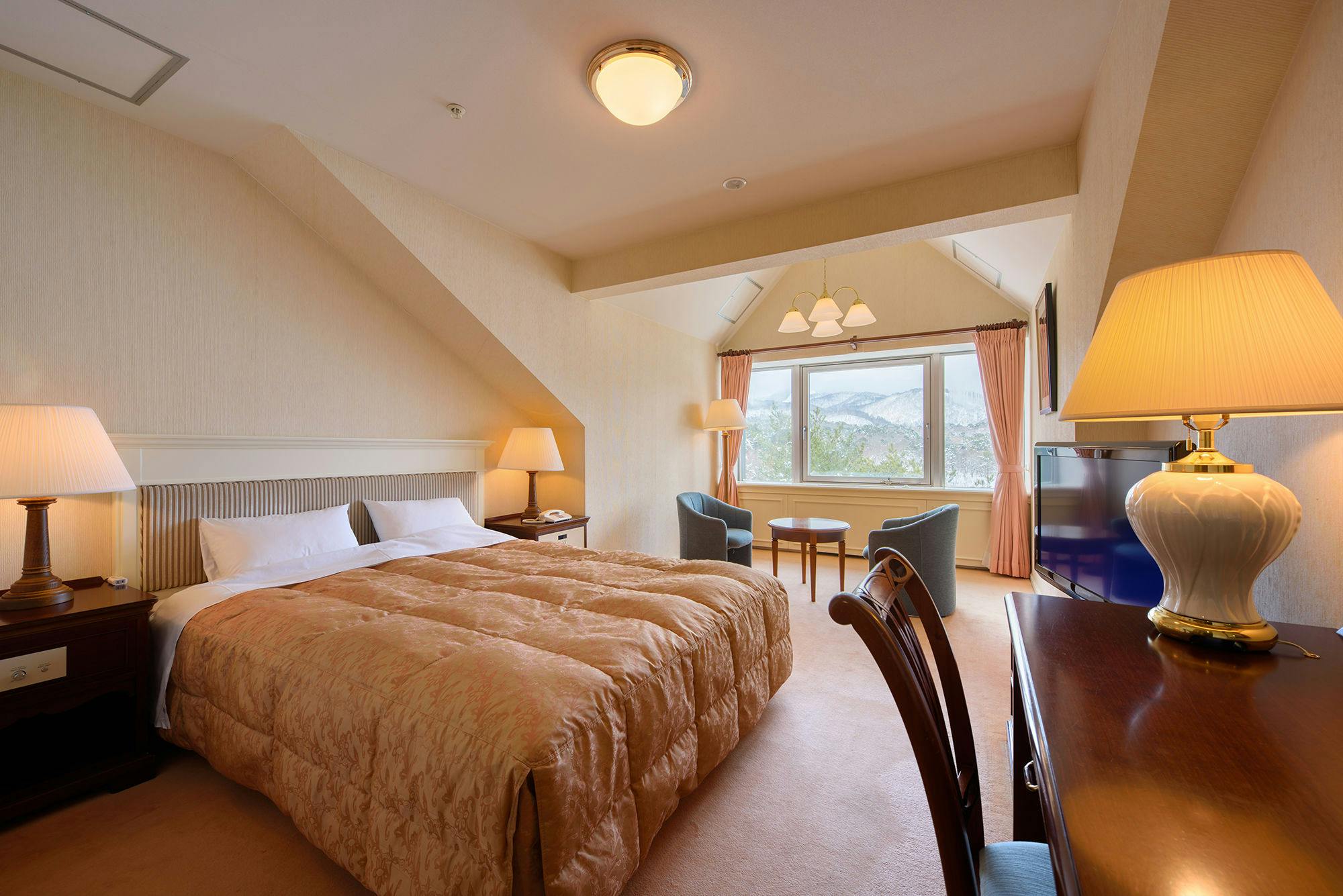 最上階にあるゆとりのダブルルーム。ゆとりのクイーンサイズベッドを配置したお部屋で、高原リゾートでの休日をお過ごしください。ひとりでゆったりお休みになりたい方はもちろん、お二人でもご利用いただけます。
