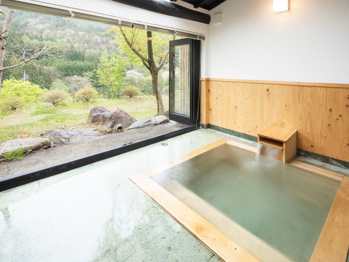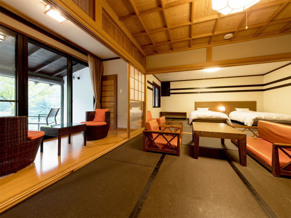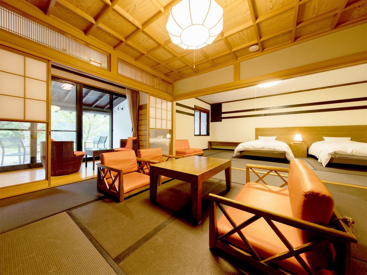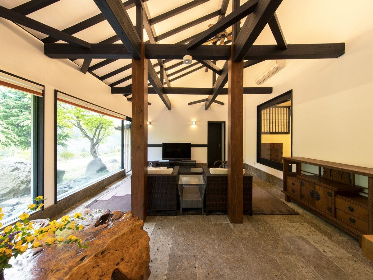 居間+寝室95平米ソファセットシモンズ製ベッド1台(160cm×195cm)※3名様以上は布団対応になります。-----------------------------------1室限定の貴賓室「天空」。広々とした居間はお庭に面して一面のガラス張り。庭園と武尊山の四季の移ろいを存分にご覧いただけます。懐かしい木の温もりと和の風情、そしてモダンさが融合された空間で、特別なひとときをお過ごしください。