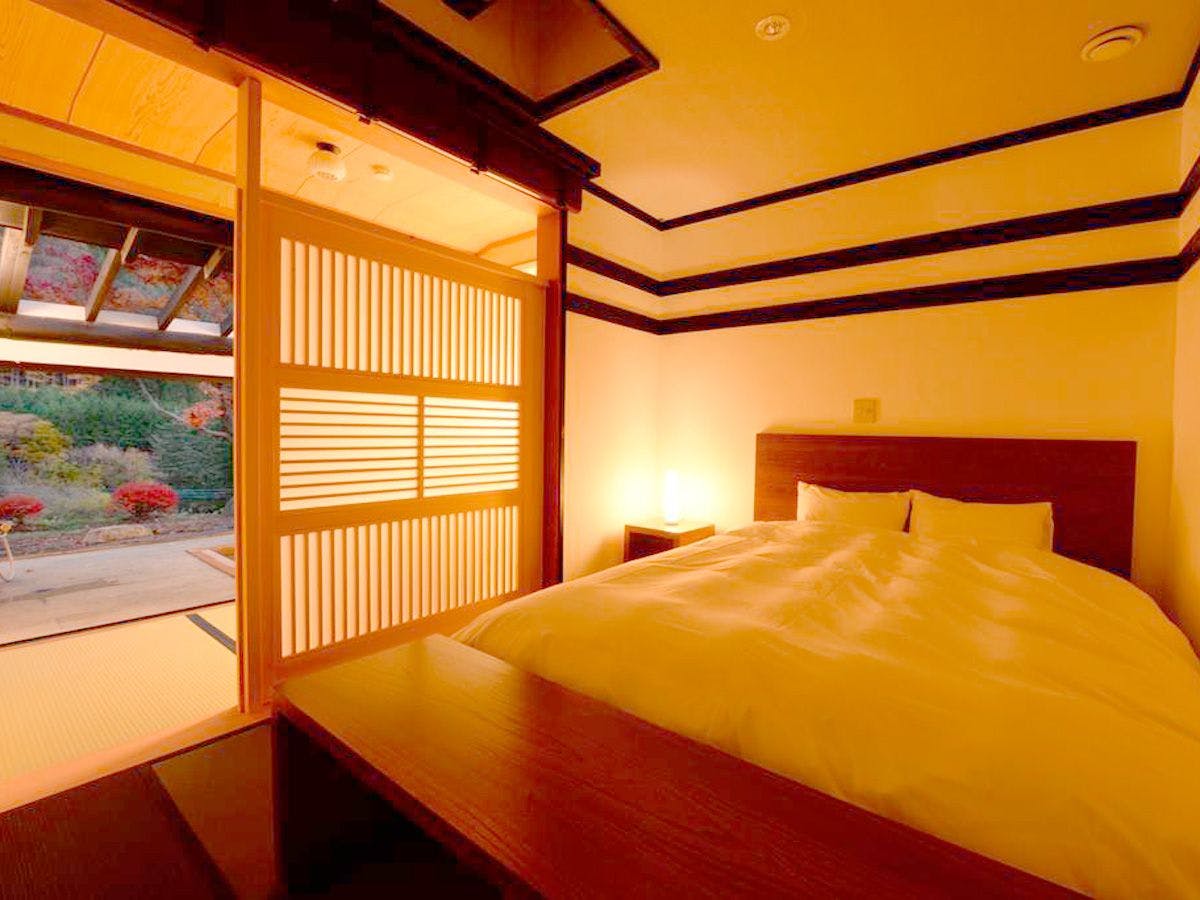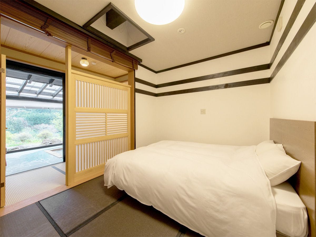 寝室6畳シモンズ製ベッド1台(160cm×195cm)-----------------------------------カップルや一人旅のご利用にお勧め。ゆったりとスペースのとられた半露天風呂で景色と温泉を愉しみ、心地よいベッドで上質の眠りを自分へのご褒美に。