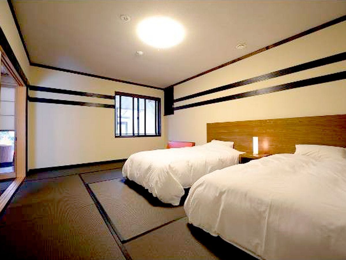 居間8畳+寝室12畳ソファセットシモンズ製ベッド2台(120cm×195cm)※3名様以上は布団対応になります。-----------------------------------ファミリーやグループなど4名様までご利用いただける二間の和室。襖を開ければ広々20畳の空間。畳のお部屋ですがベッドとソファでおくつろぎいただけます。