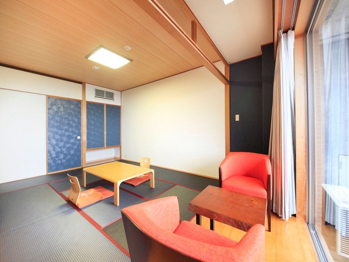 和室8畳のお部屋にセミダブルサイズ(120×195cm)のベッドを2台設置したお部屋です。