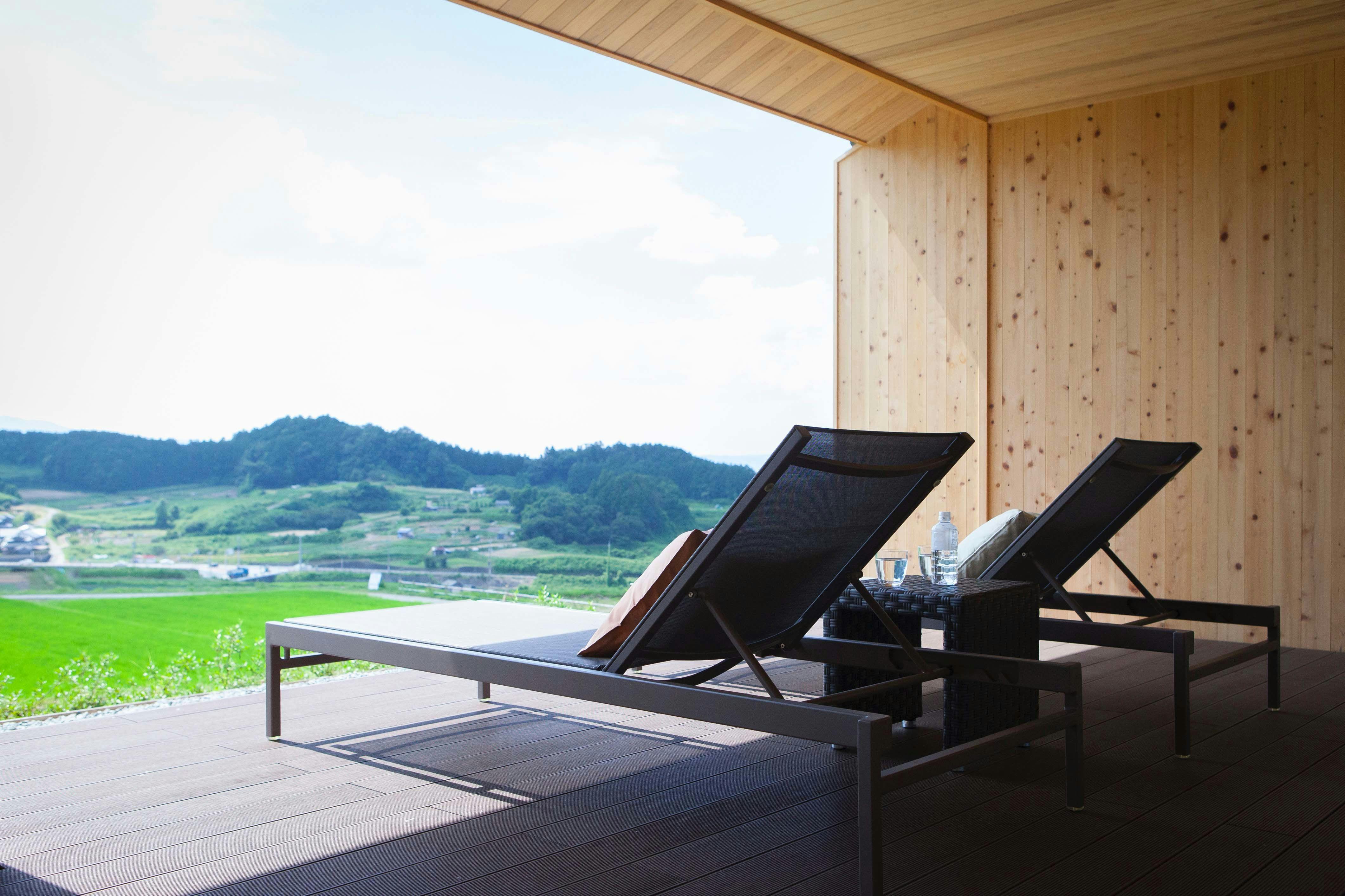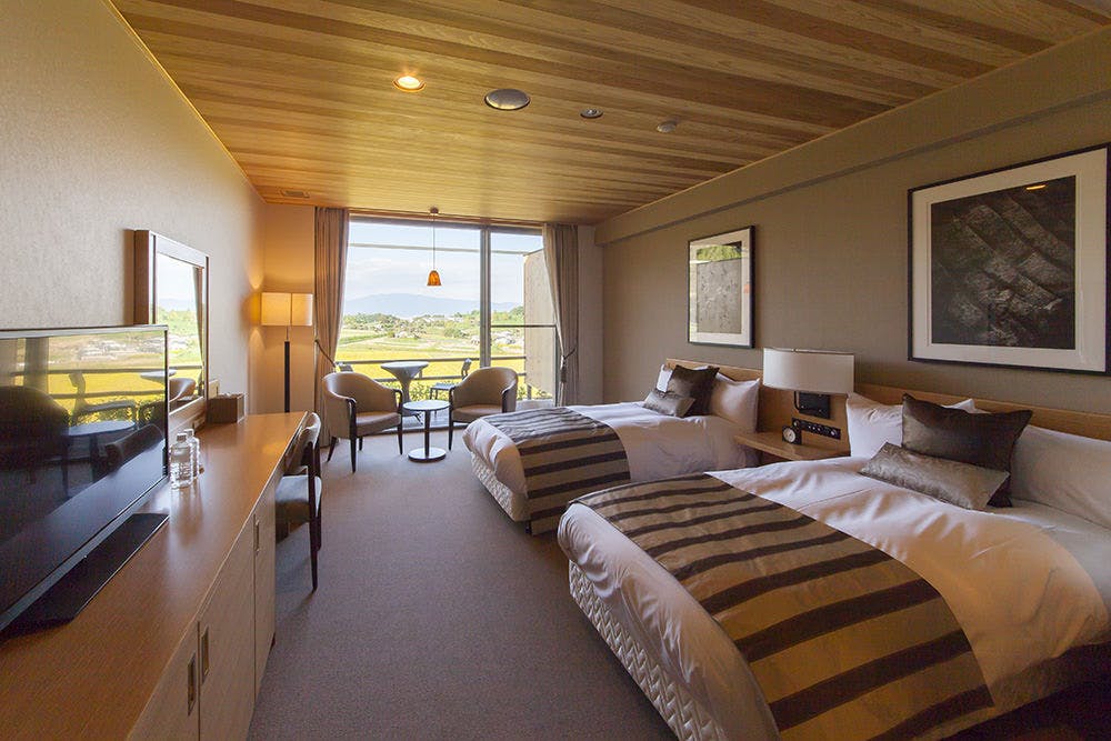 木の素材感を生かした上質なデザインと落ち着いた雰囲気のツインルーム。日本三大美林の一つである吉野杉を一面に敷いた天井、吉野檜の灯りなど、奈良のエッセンスも感じていただける空間です。テラスの上で感じる爽やかな風の音や、鳥のさえずりが心を癒してくれるでしょう。