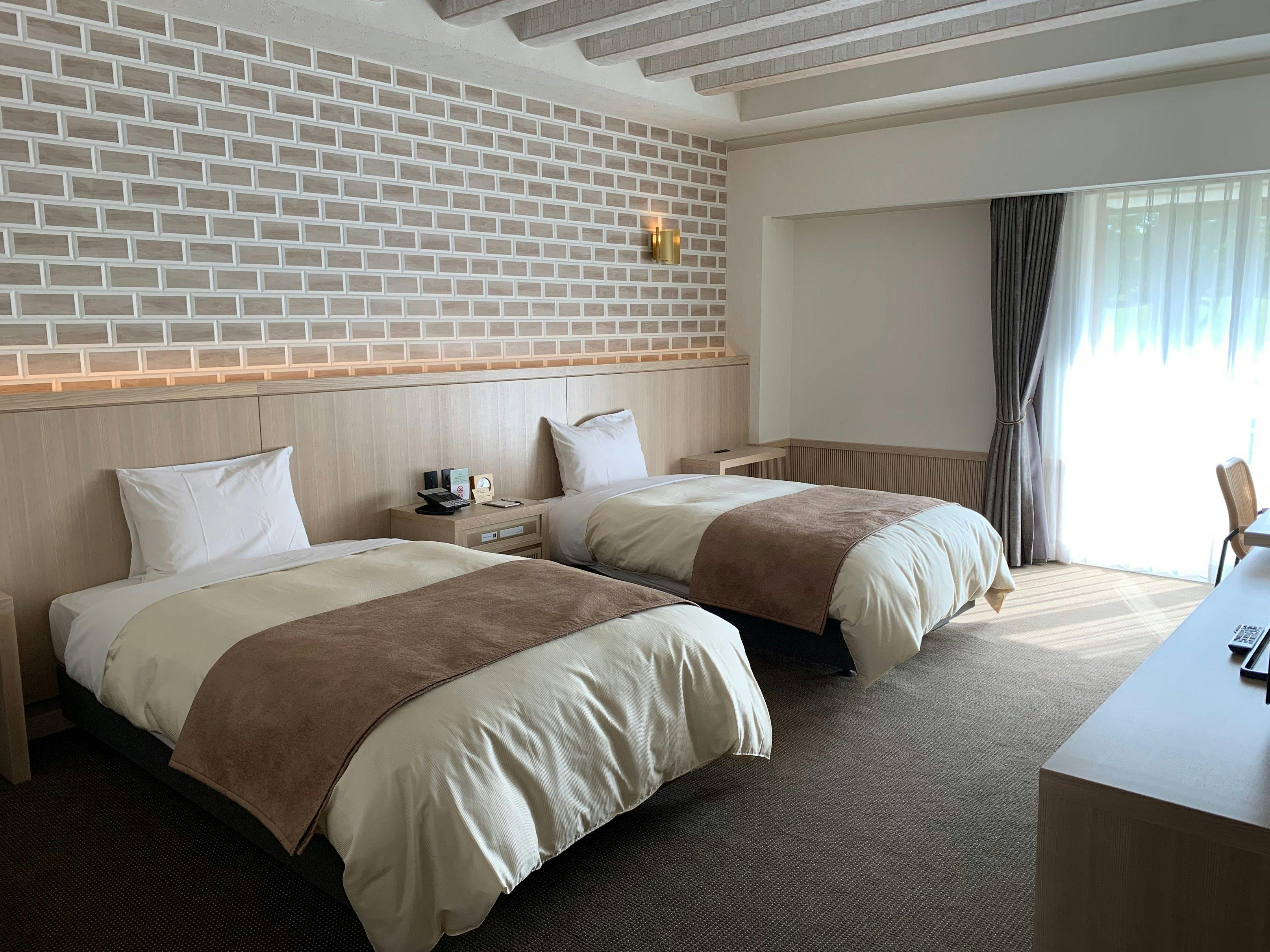 シモンズ製ベッドを使用しております。シャワールーム付(大浴場は1F共用スペースにあります。)3名でご利用の場合は事前に問い合わせ下さい。エキストラベッド料金:+5,500円(素泊まり料金)