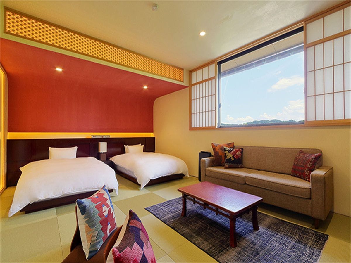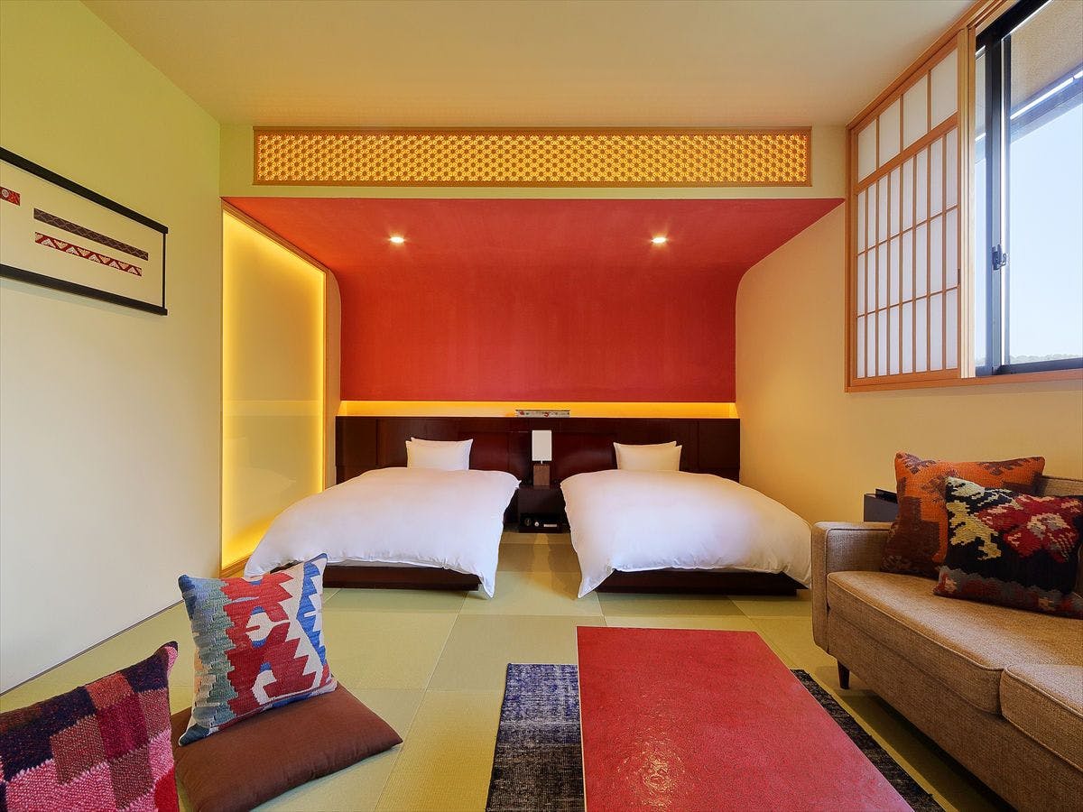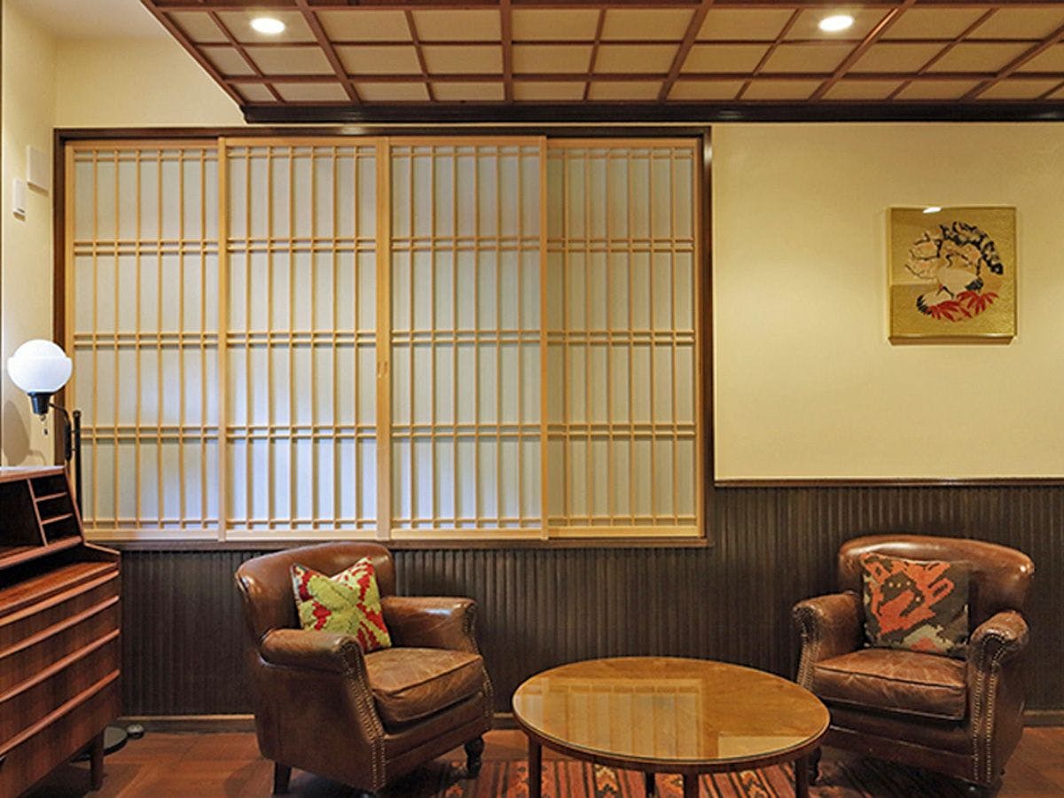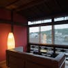 弁柄の漆喰壁が華やかですが、麻の葉の欄間や北欧家具が不思議と心を落ち着かせます。